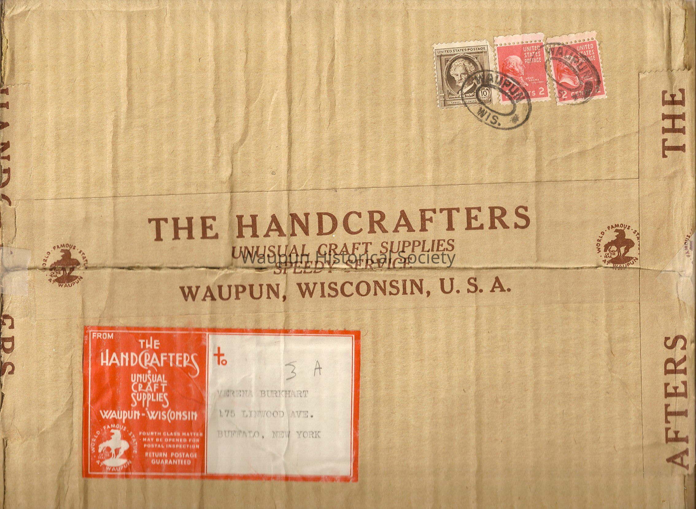 Packing box approximately 9"x12" from The Handcrafters, unusual craft supplies, from Waupun,Wisconsin. The exact date is unknown except by the contents of the box and the invoice from this collection would indicate 1935 - 1940. The total postage of 14 cents, sent this fourth class material to Verena Burkhart, 175 Linwood Ave. Buffalo, New York.Acquisition
