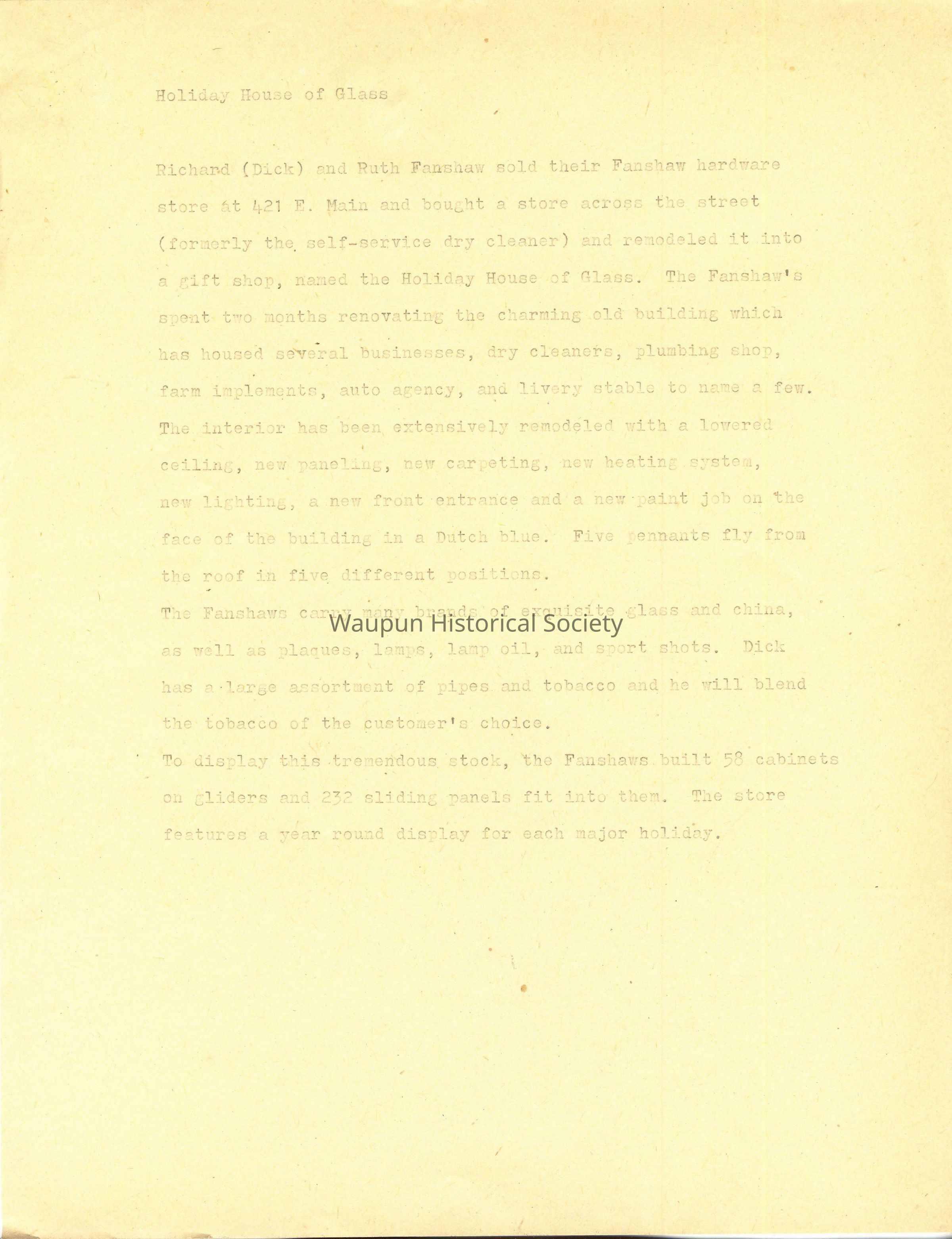 Richard (Dick) and Ruth Fanshaw sold their Fanshaw hardware store at 421 E. Main and bought a store across the street (formerly the self-service dry clearner) and remodeled it into a gift shop, named the Holiday House of Glass. The Fanshaw's spent two months renovatng the charming old building which has housed several businesses, dry clearners, plumbing shop, farm implements, auto agency, and livery stable to name a few. The interior has been extensively remodeled with a lowered ceiling, new paneling, new carpeting, new heating system, new lighting, a new front entrance and a new paint job on the face of the building in a Dutch blue. Five pennants fly from the roof in five different positions.