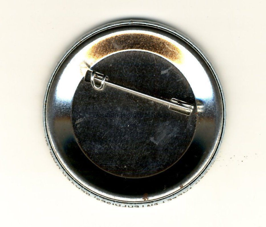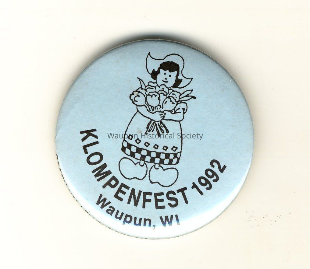 (1) Klompenfest 1992 Waupun, WI memorabilia button/pin. Drawing of a Dutch lady holding a bunch of tuplips on a light blue background.