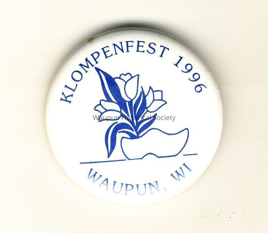 (1) Klompenfest 1996 Waupun, WI Button/Pin. Backgound is white with a drawing of 3 tulips in a wooden shoe.Acquisition