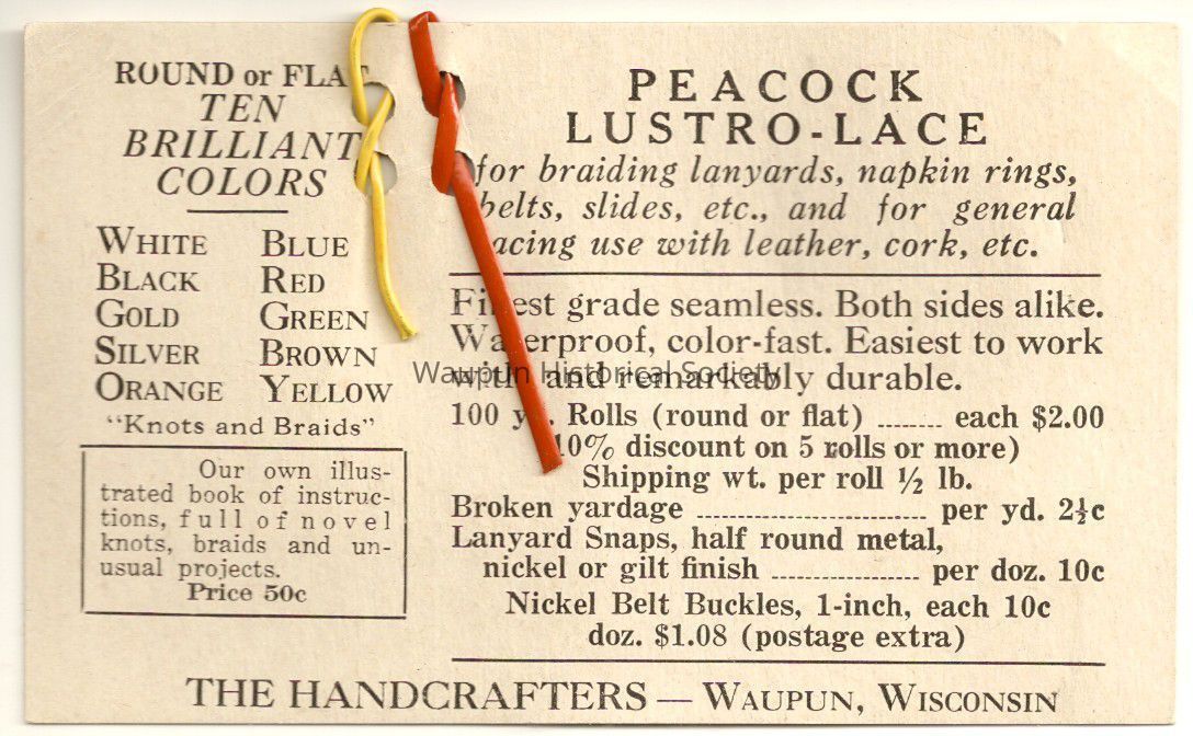 The Peacock Lustro Lace sample card from "The Handcrafters" of Waupun, Wisconsin measures 5 1/4" X 3 1/4" with two samples attached. Available in ten colors and in either round or flat laces, the card suggests uses, quality and features. Cost and shipping charges and additional items including an illustrated instruction book to order are also indicated on the front of the card.