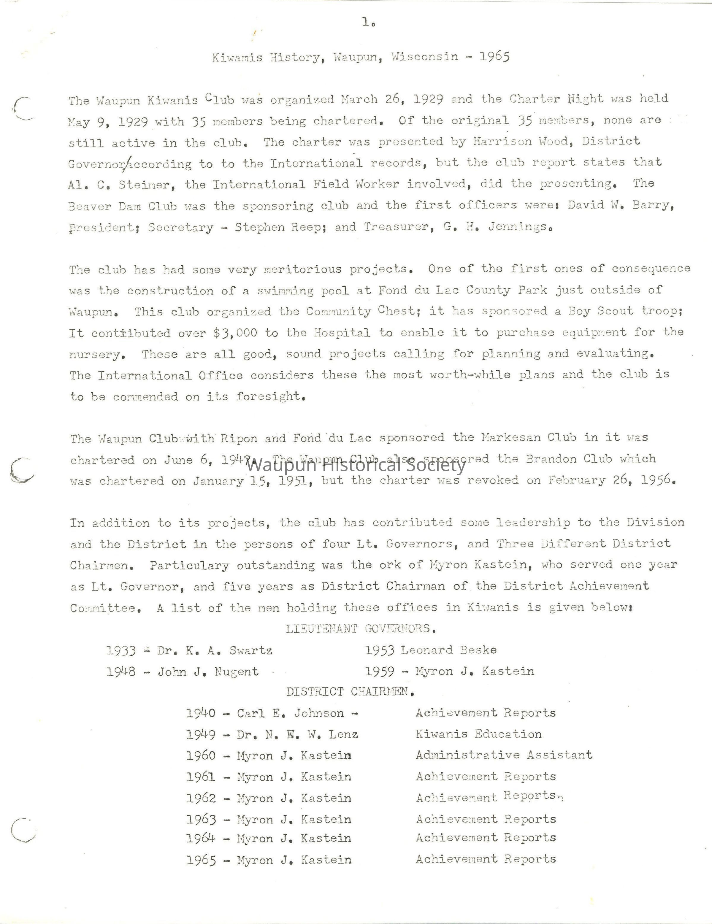 Lieutenant Governors 1933, Dr. Kenneth A. Swartz; 1948, John J. Nugent; 1953, Leonard F. Beske; 1959, Myron J. Kastein; 1967, Wallace E. Erickson (Westby); 1969, John "Jack" Keepers; Achievement Reports - 1940, Carl E. Johnson; Kiwanis Education - 1949, Dr. N. E. W. Lenz; Adm. Assist. to Governor - 1961, Myron J. Kastein; Achievement Reports - 1962 - 1970, Myron J. Kastein; Vocational Guidance - 1968, Wallace E. Erickson ( Westby); Public & Business Affairs - 1970 - 1972, John "Jack" Keepers; Citizenship Services - 1973, John "Jack" Keepers.Acquisition