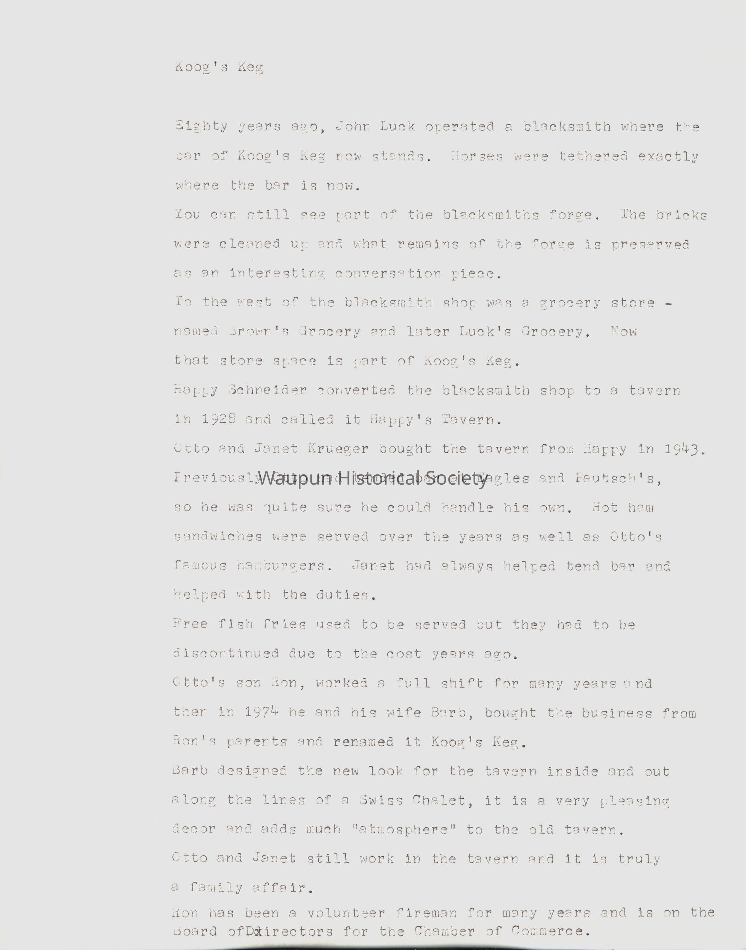 Historical information on Koog's Keg for 1976 Bicentennial Celebration in Waupun, WI.