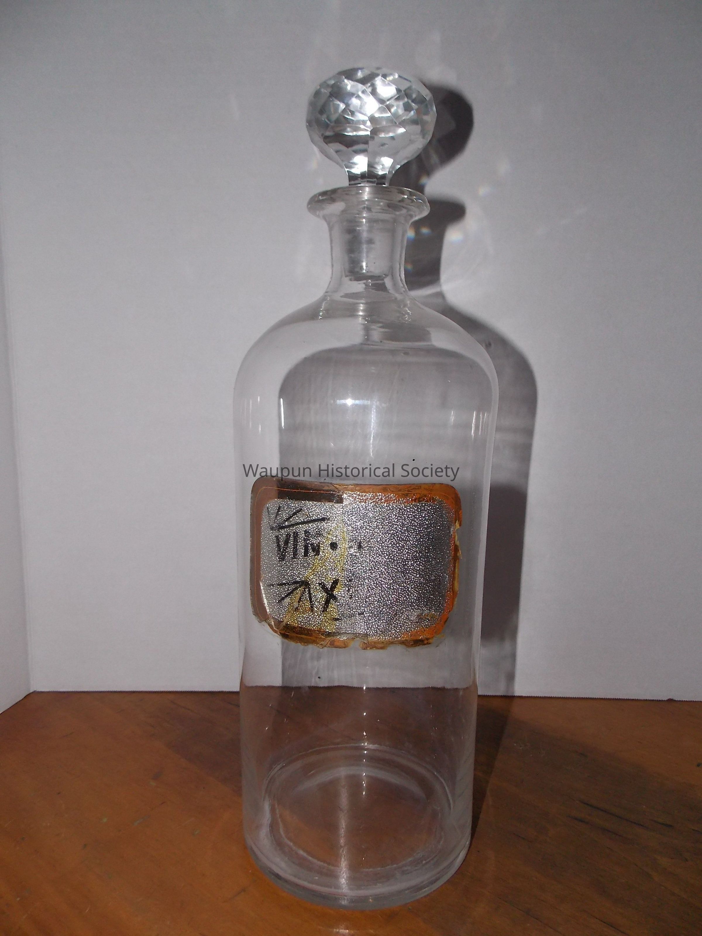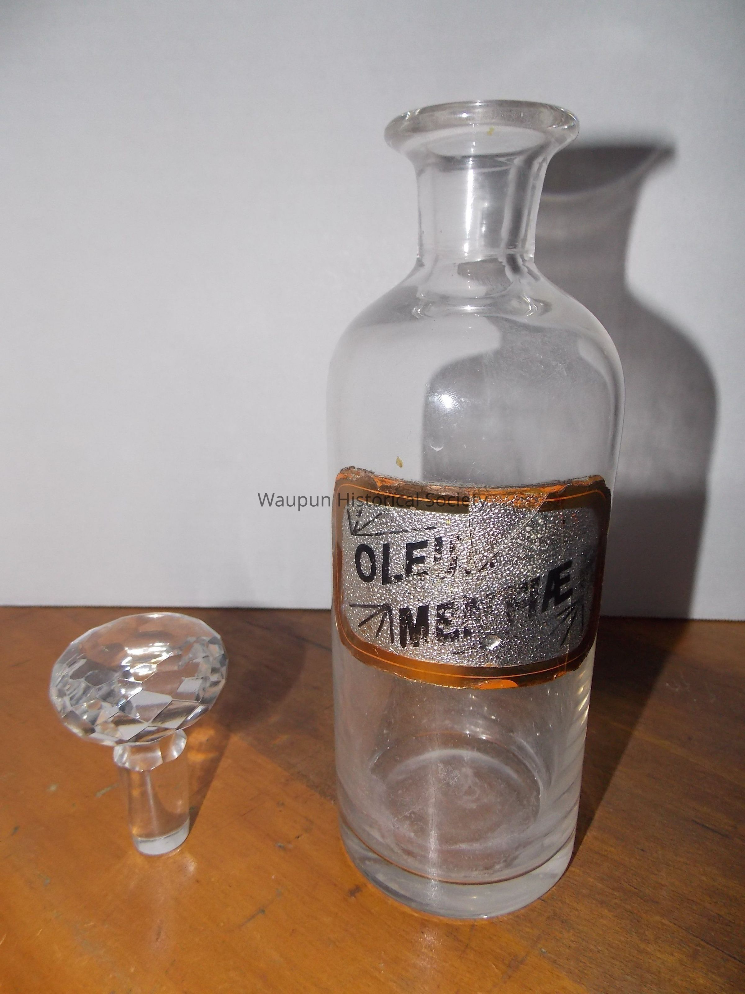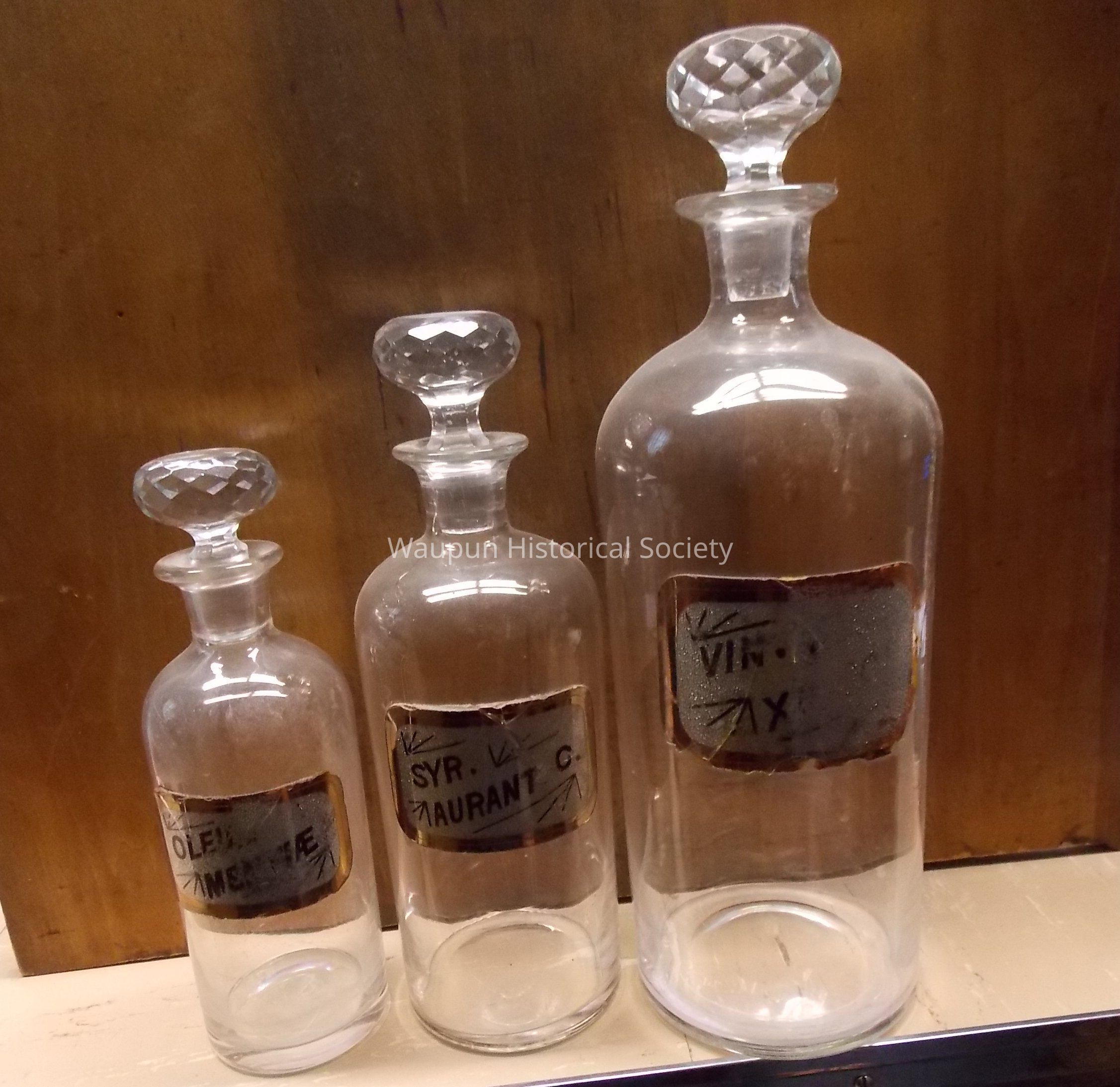 Three glass RX bottles or jars with glass diamond cut design stoppers. The labels have words describing what was in the bottles or jars. They are different sizes: 1 large, 1 medium, 1 small.Acquisition