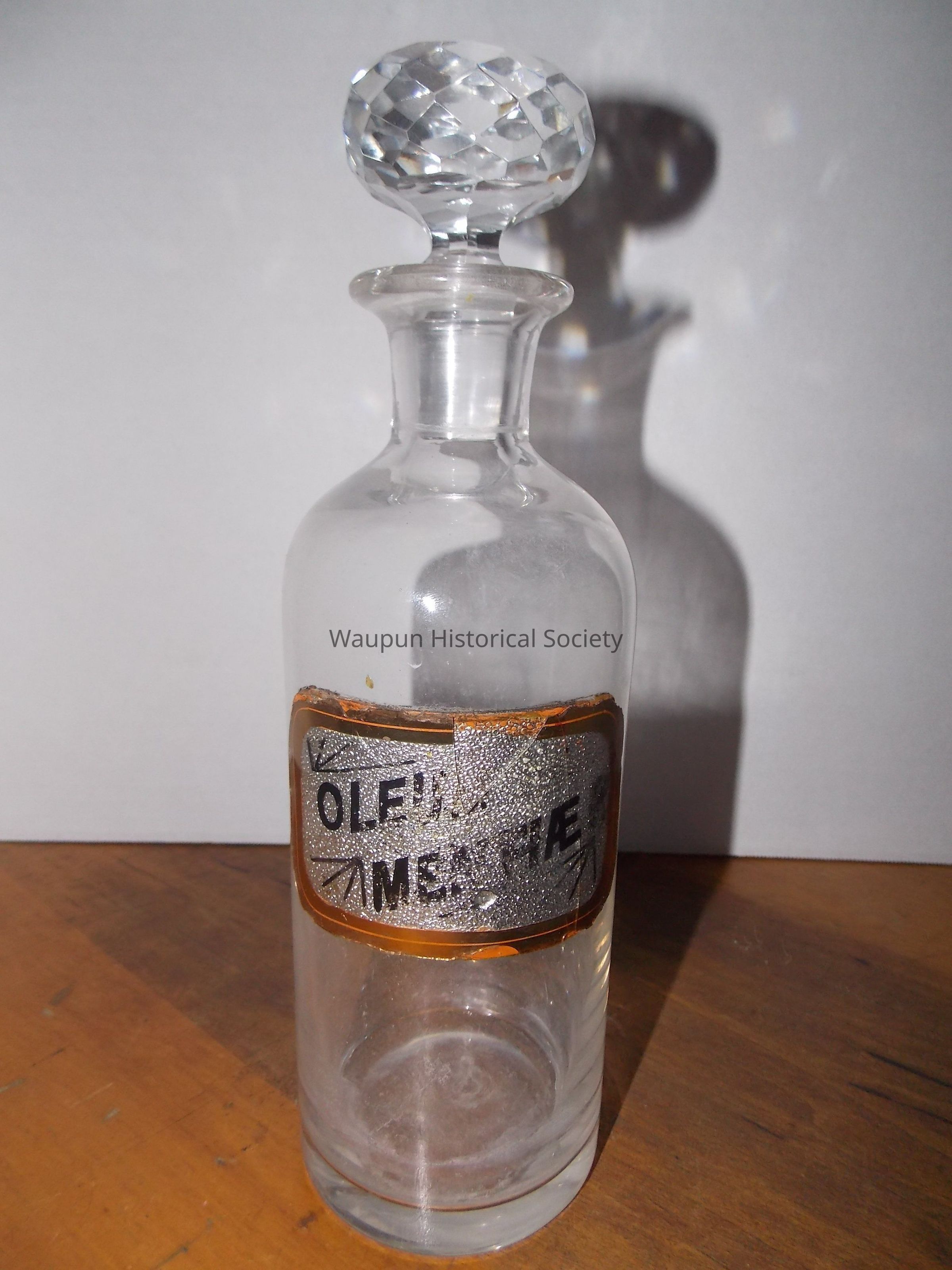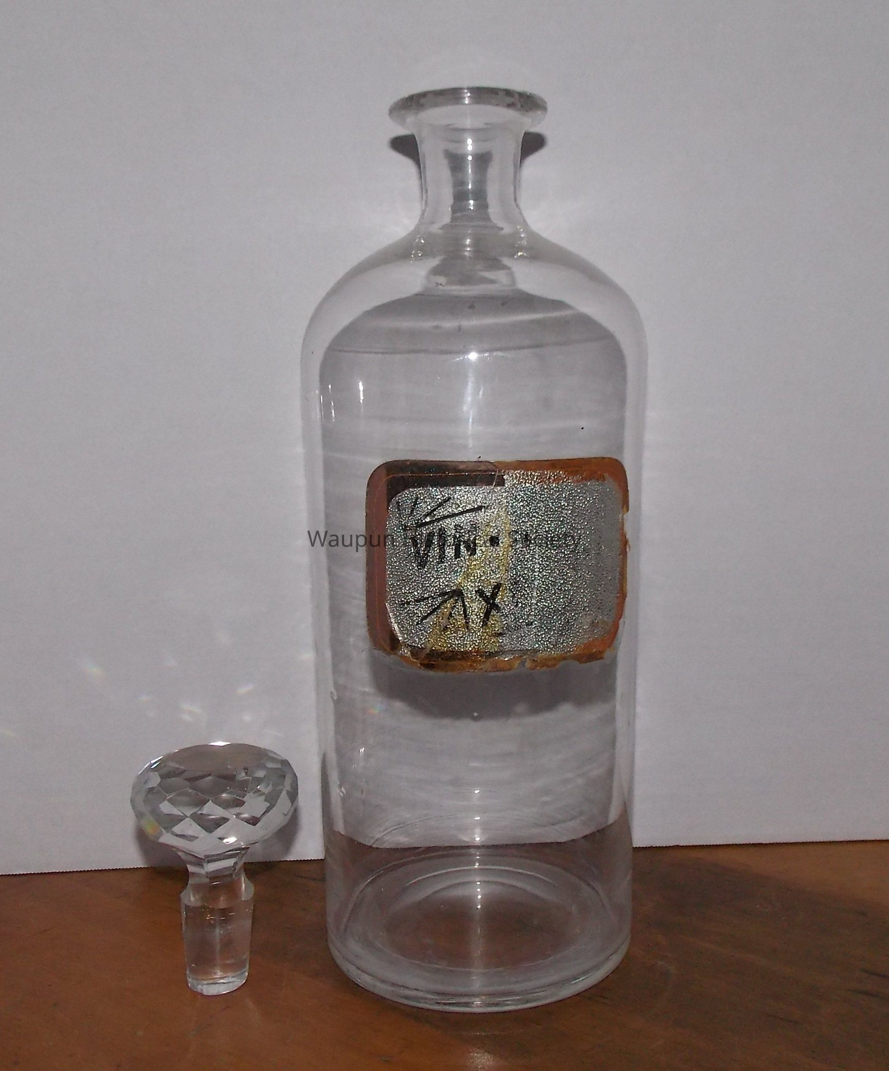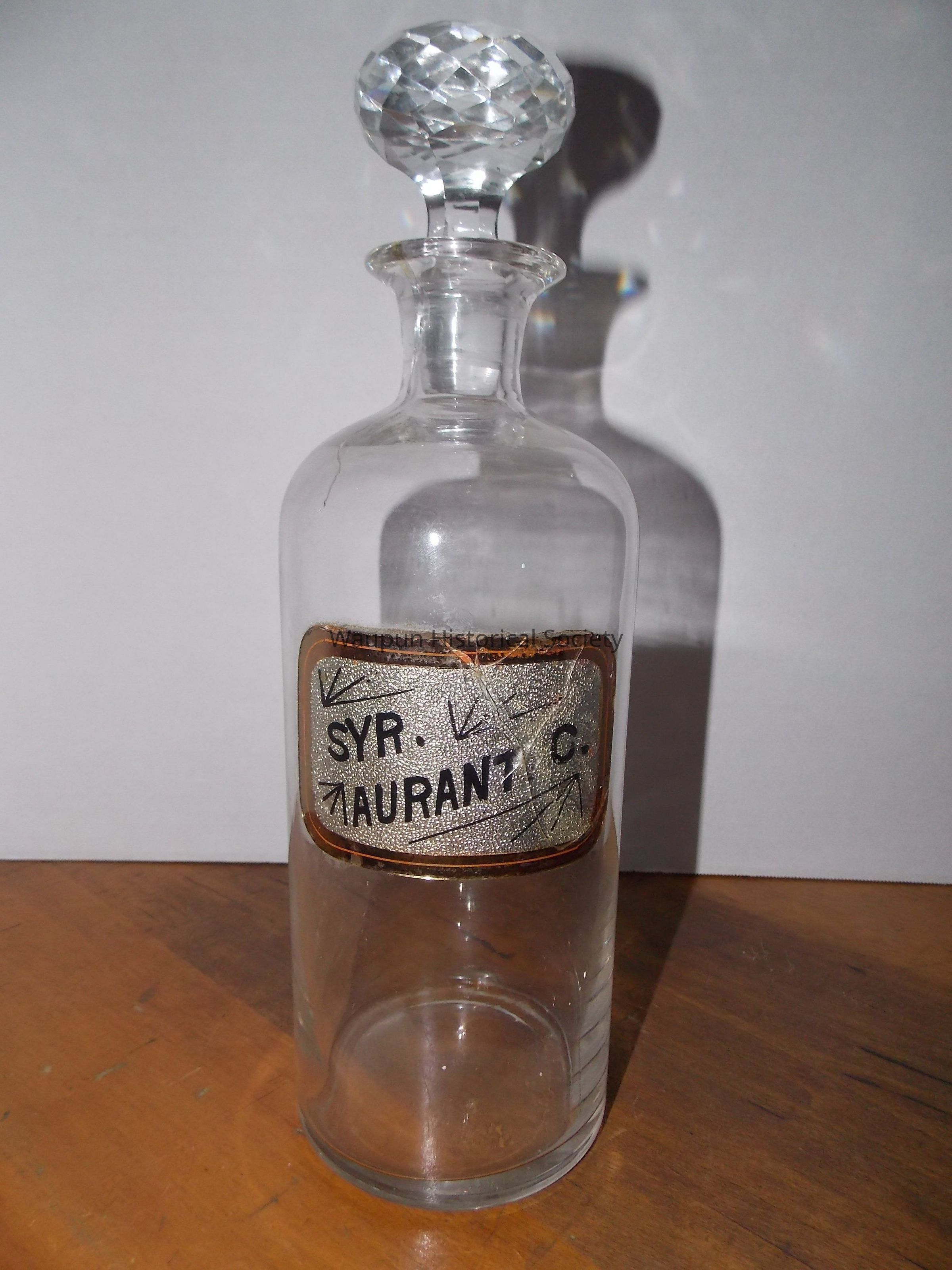 Three glass RX bottles or jars with glass diamond cut design stoppers. The labels have words describing what was in the bottles or jars. They are different sizes: 1 large, 1 medium, 1 small.Acquisition