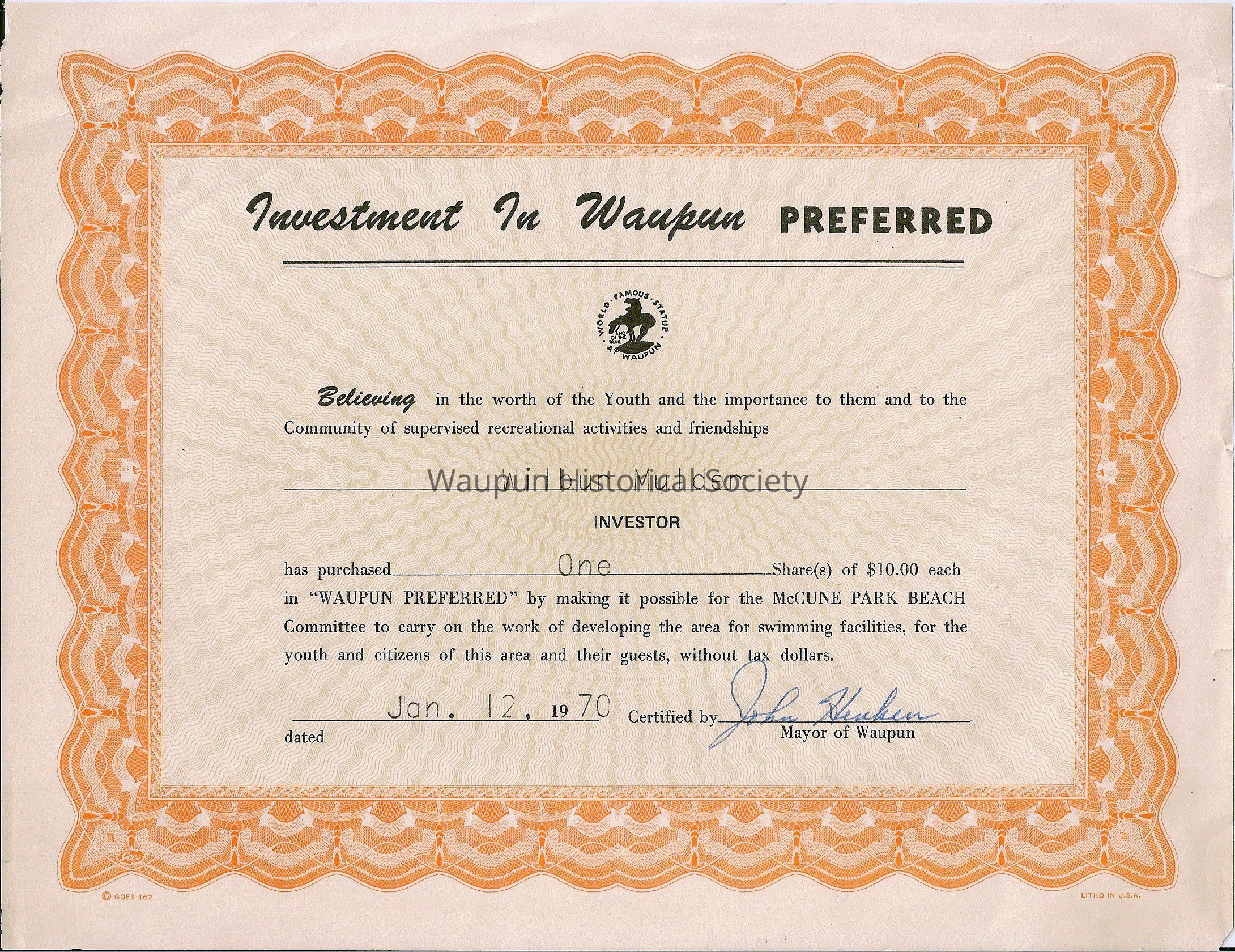 has purchased One Share(s) of $10.00 each in "WAUPUN PREFERRED" by making it possible for the McCUNE PARK BEACH Committee to carry on the work of developing the area for swimming facilities, for the youth and citizens of this area and their guests, without tax dollars.