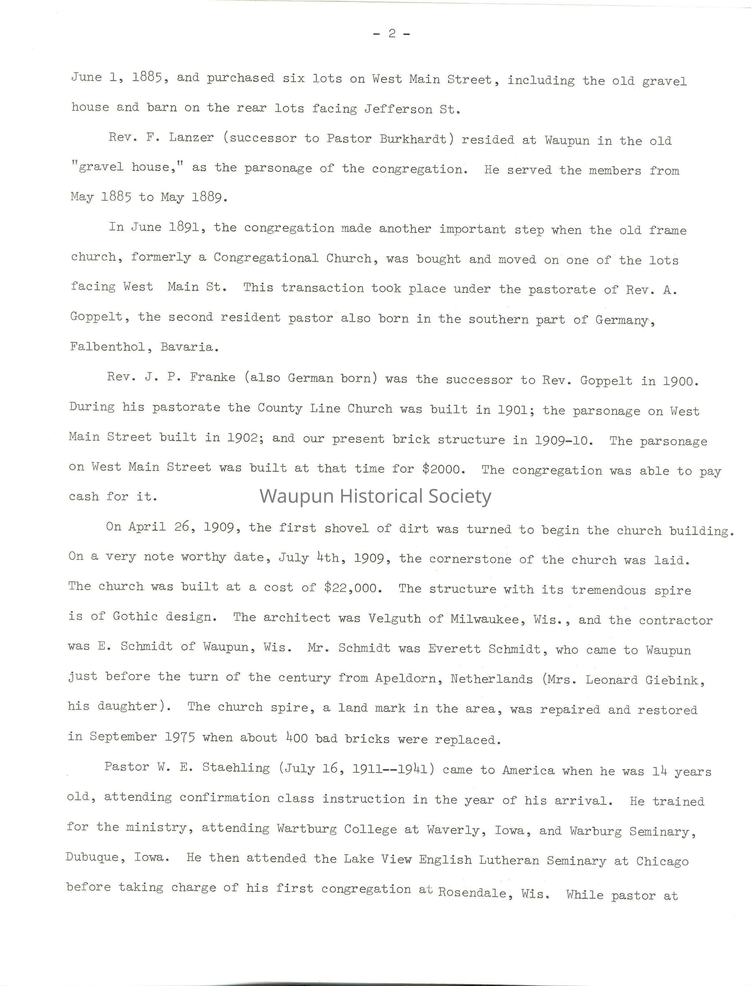 Rev. F. Lanzer (successor to Pastor Burkhardt) resided at Waupun in the old "gravel house," as the parsonage of the congregation. He served the members from May 1885 to May 1889.