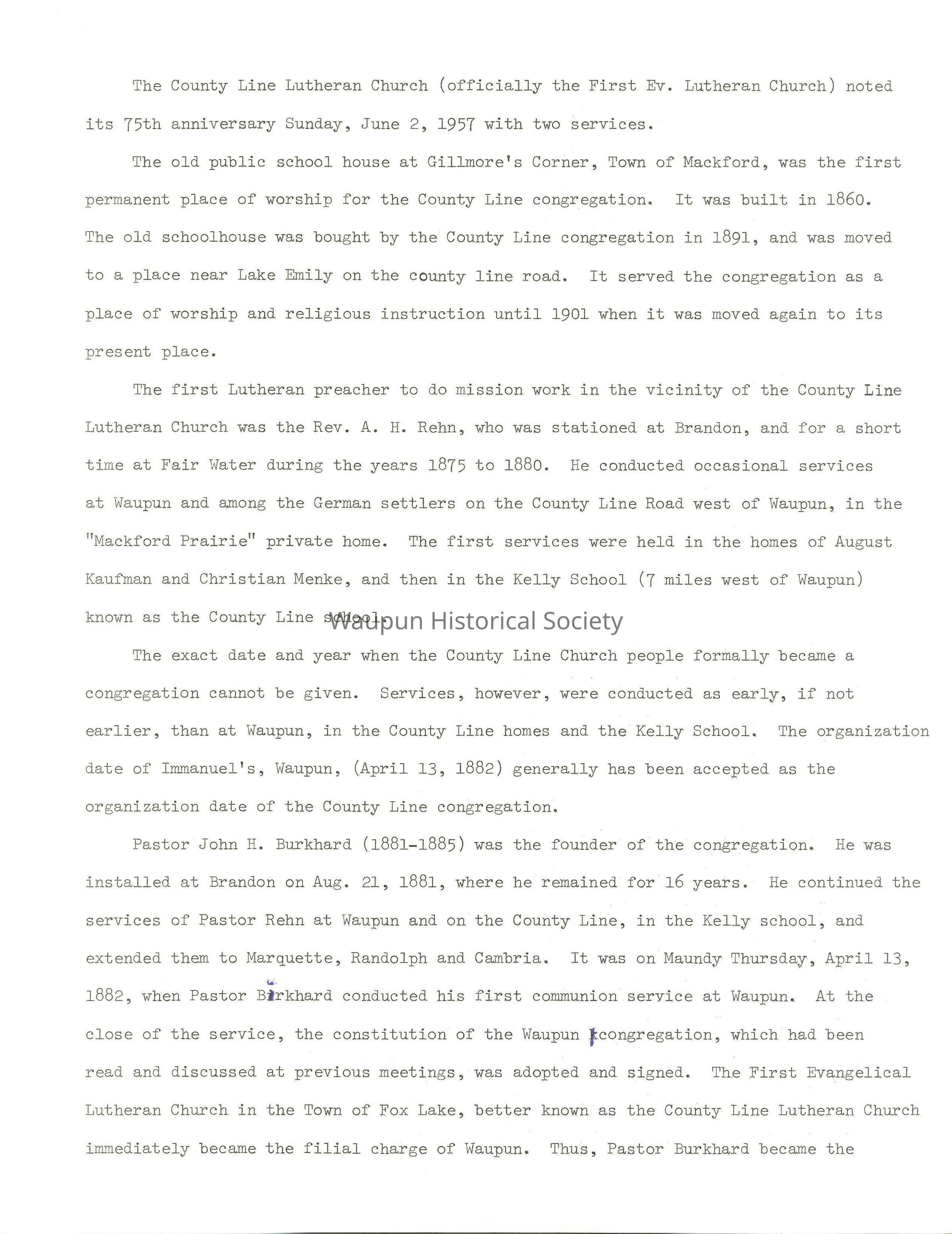 The first Lutheran preacher to do mission work in the vicinity of the County Line Lutheran Church was the Rev. A. H. Rehn, who was stationed at Brandon, and for a short time at Fair Water during the years 1875 to 1880. He conducted occasional services at Waupun and among the German settlers on the County Line Road west of Waupun, in the "Mackford Prairie" private home. The first services were held in the homes of August Kaufman and Christian Menke, and then in the Kelly School (7 miles west of Waupun) known as the County Line school.