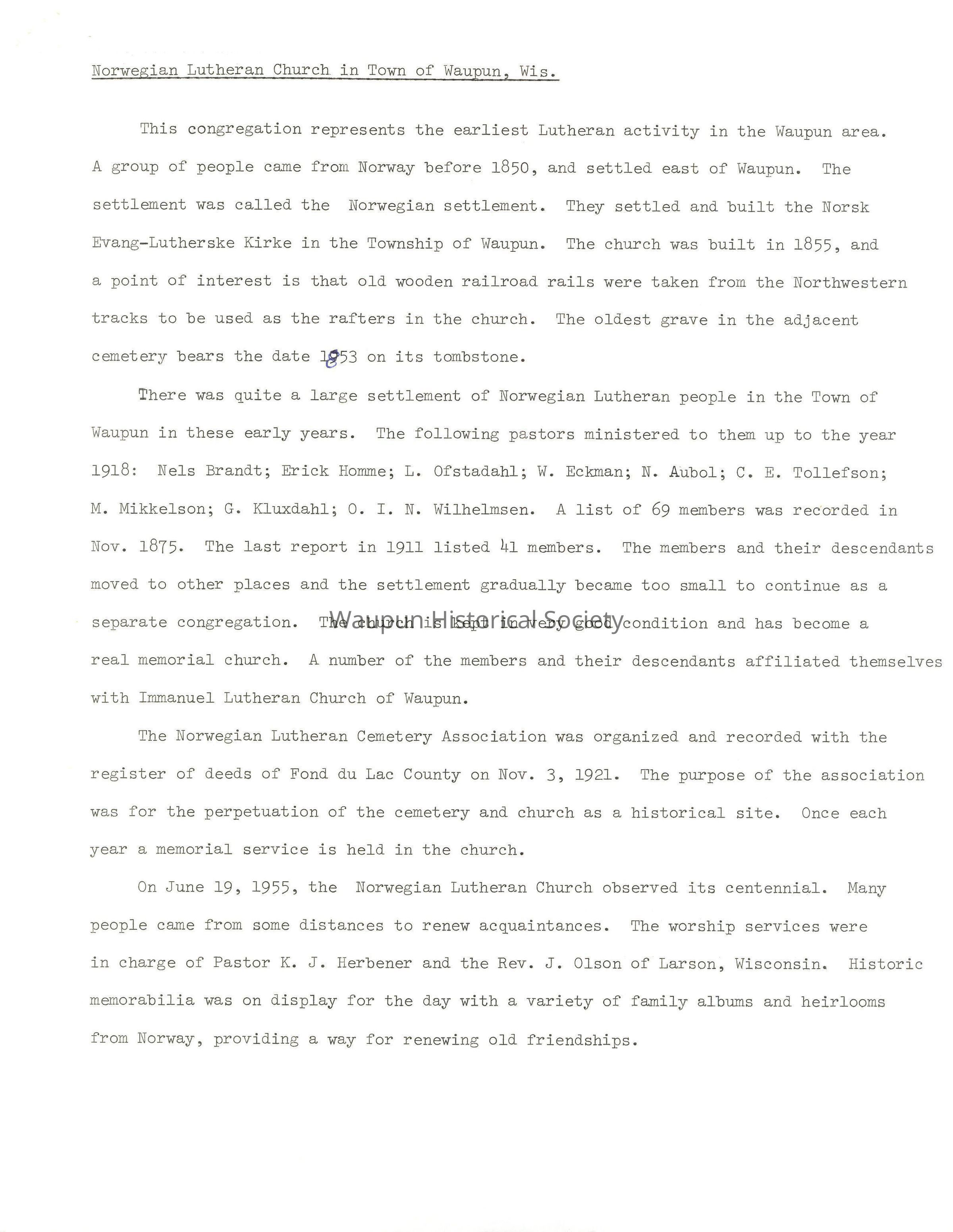 There was quite a large settlement of Norwegian Lutheran people in the Town of Waupun in these early years. The following pastors ministered to them up to the year 1918: Nels Brandt; Erick Homme; L. Ofstadahl; W. Eckman; N. Aubol; C. E. Tollefson; M. Mikkelson; G. Kluxdahl; O. I. N. Wilhelmsen. A list of 69 members was recorded in Nov. 1875. The last report in 1911 listed 41 members. The members and their descendants moved to other places and the settlement gradually became too small to continue as a separate congregation. The church is kept in very good condition and has become a real memorial church. A number of the members and their descendants affiliated themselves with Immanuel Lutheran Church of Waupun.