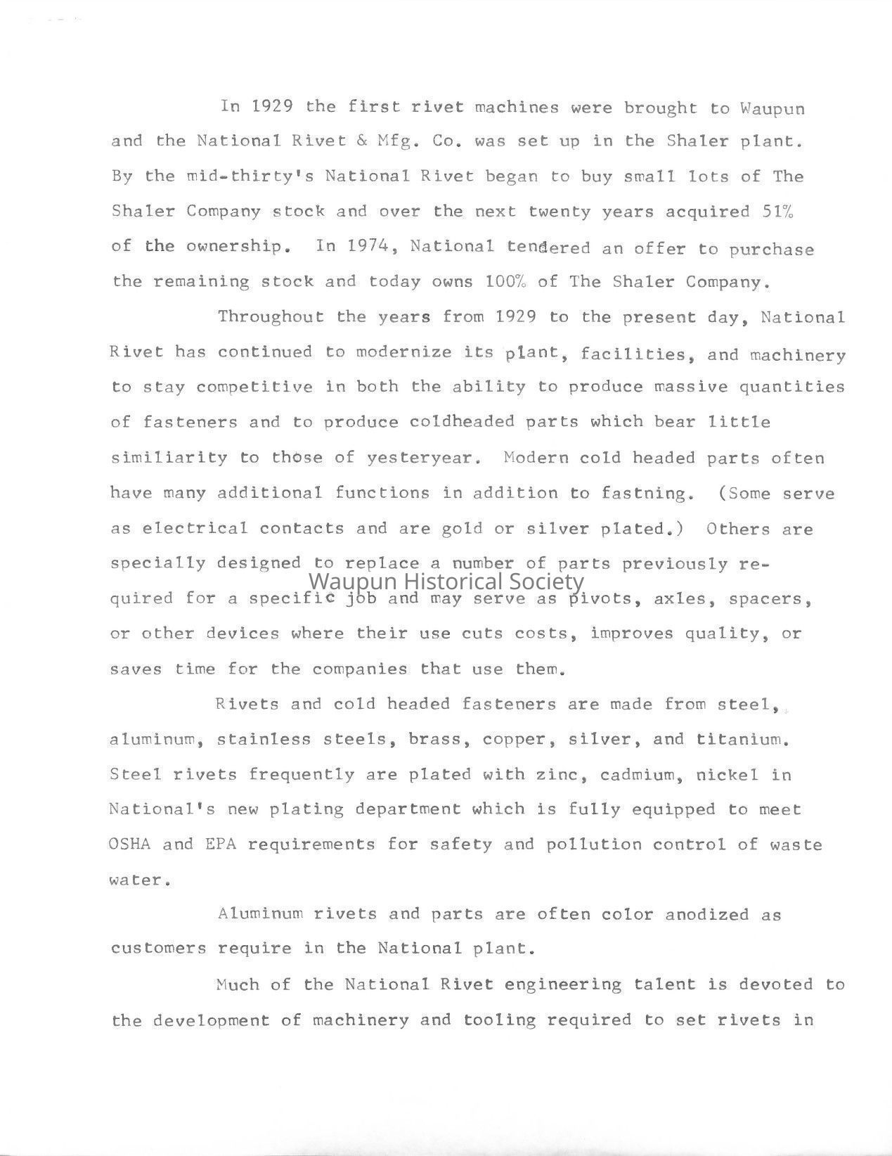 In 1929 the first rivet machines were brought to Waupun and the National Rivet & Mfg. Co. was set up in the Shaler plant. By the mid-thirty's National Rivet began to buy small lots of The Shaler Company stock and over the next twenty years acquired 51% of the ownership. In 1974, National tendered an offer to purchase the remaining stock and today owns 100% of The Shaler Company.