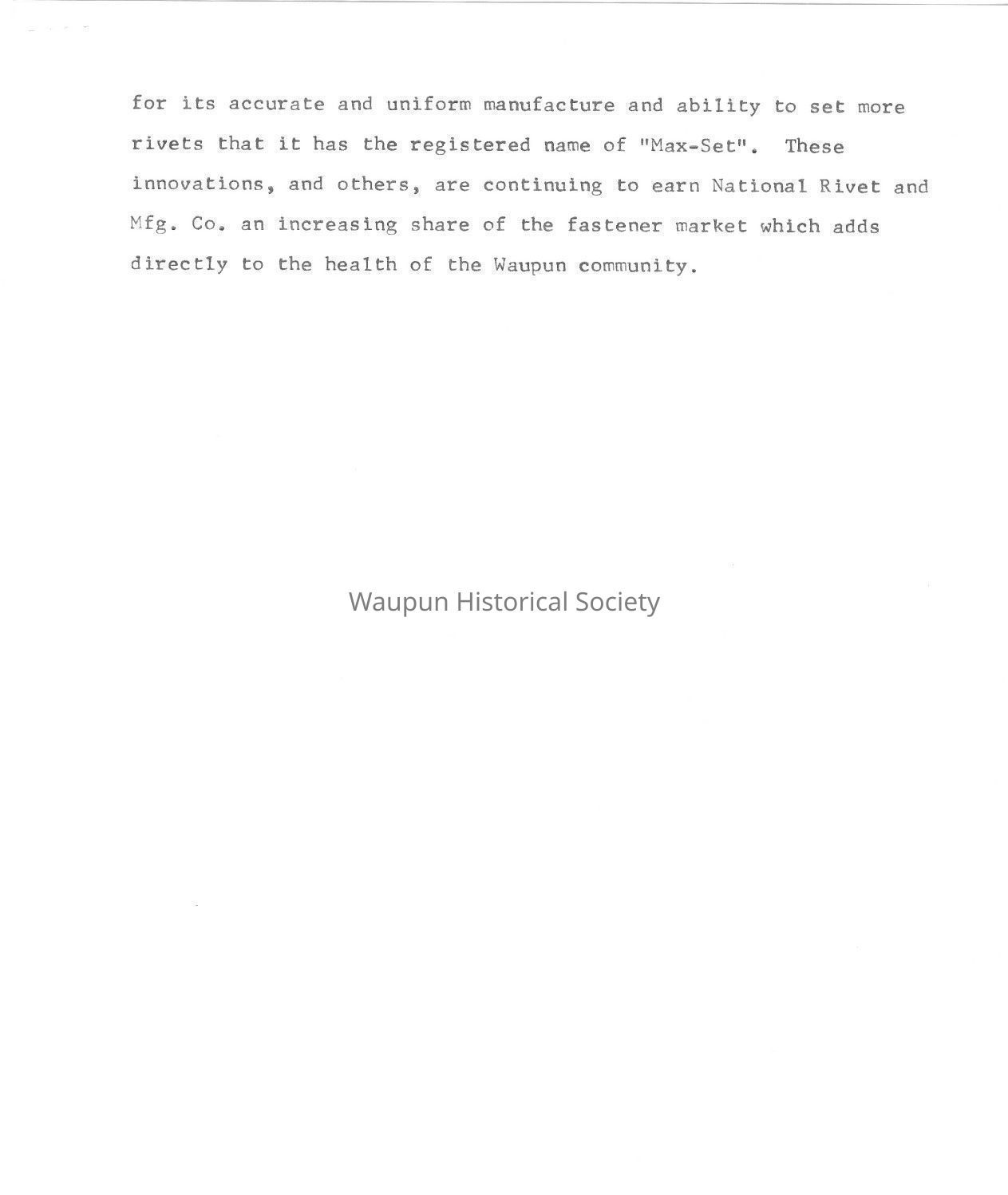 Historical information on National Rivet & Mfg. Co. for 1976 Bicentennial Celebration in Waupun, WI.