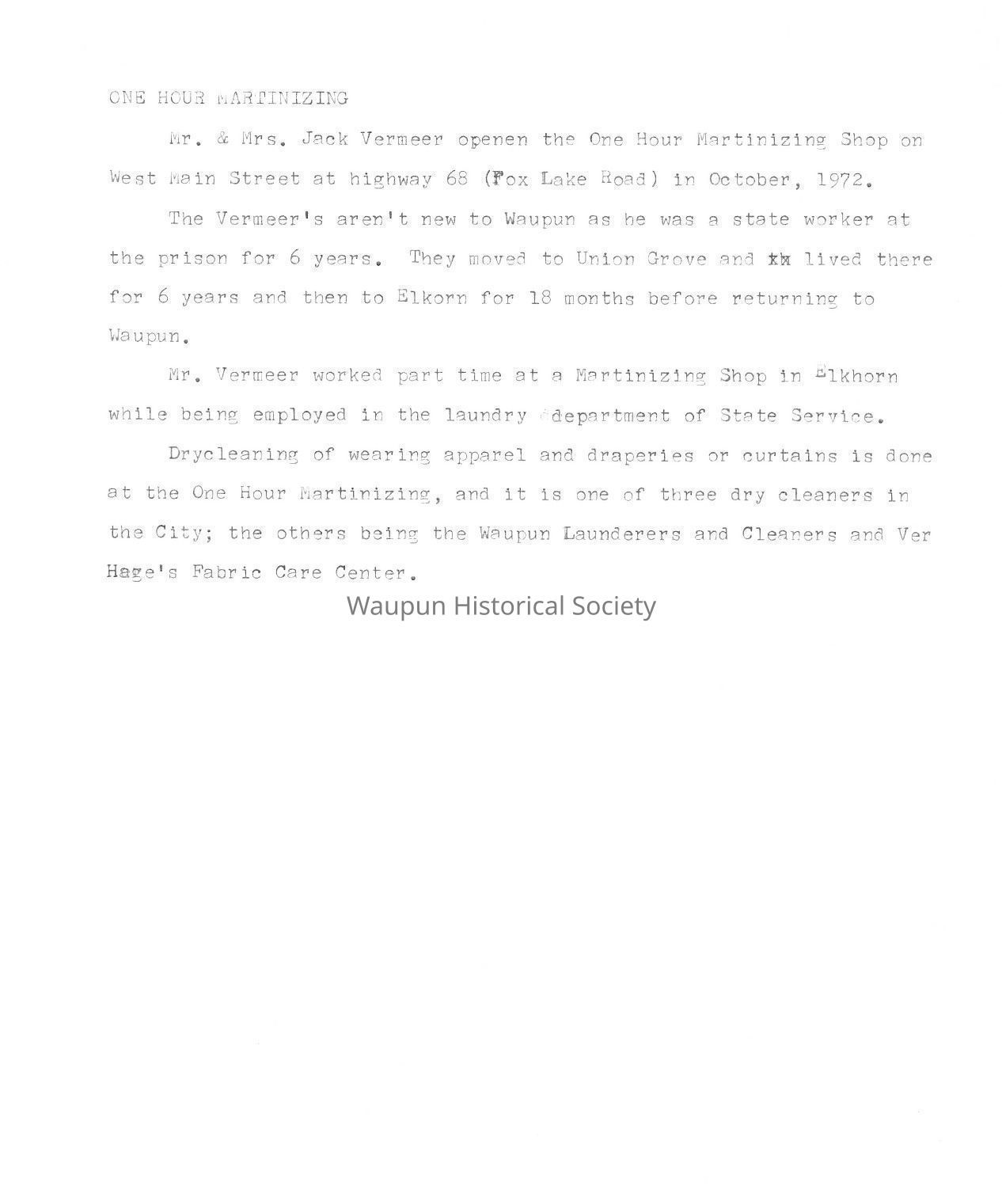 Drycleaning of wearing apparel and draperies or curtains is done at the One Hour Martinizing, and it is one of three dry cleaners in the City; the others being the Waupun Launderers and Clearers and Ver Hage's Fabric Care Center.Acquisition