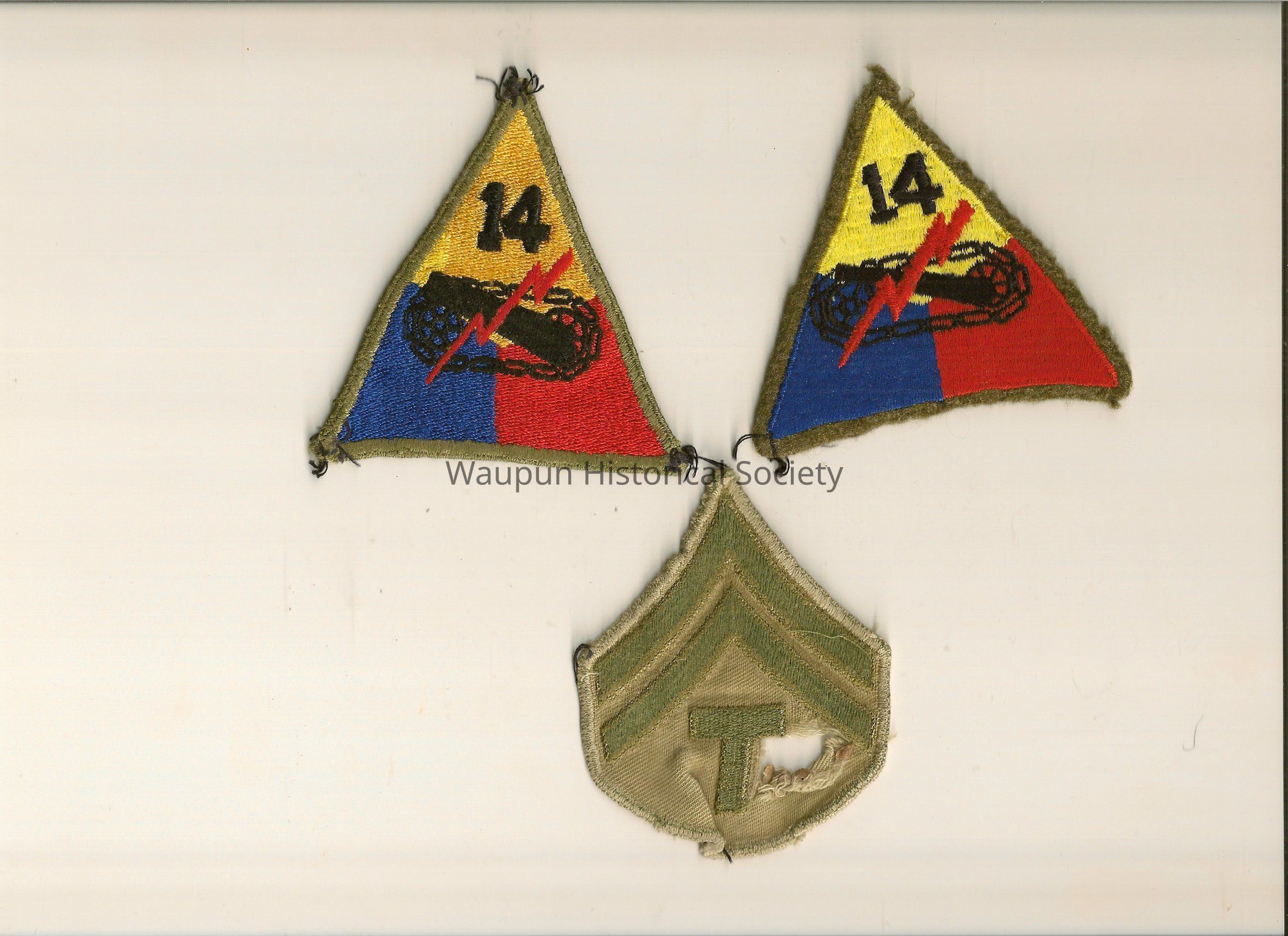 (3) Military Patches. (1) Green and tan patch with a "T" and 2 rank stripes. Hole is Bottom right side of patch. (2) Triangle shaped Military Patches colored with Yellow, Blue and Red background. Embrodered 14 in Yellow Section.Acquisition