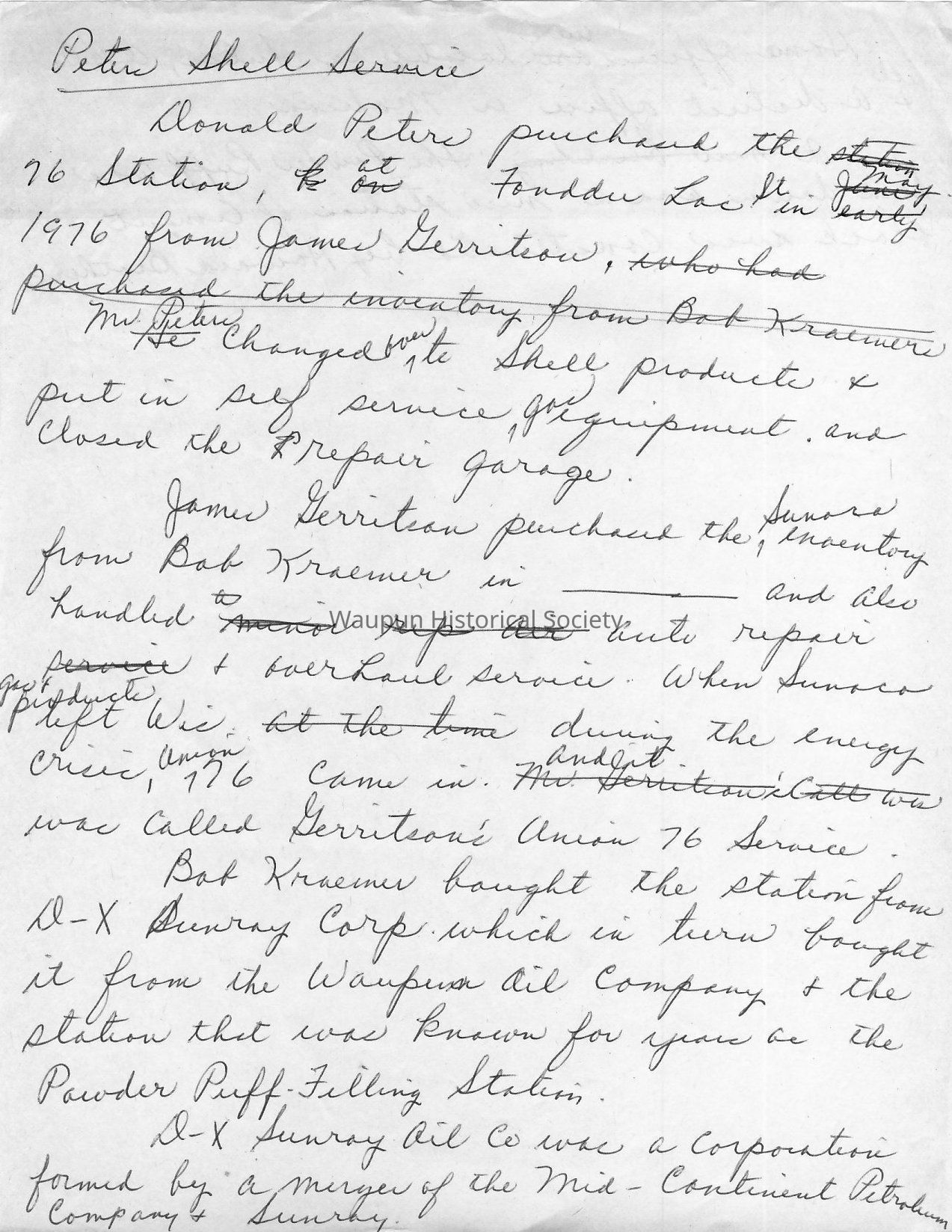 Historical information on Peters Shell Service for 1976 Bicentennial Celebration in Waupun, WI.