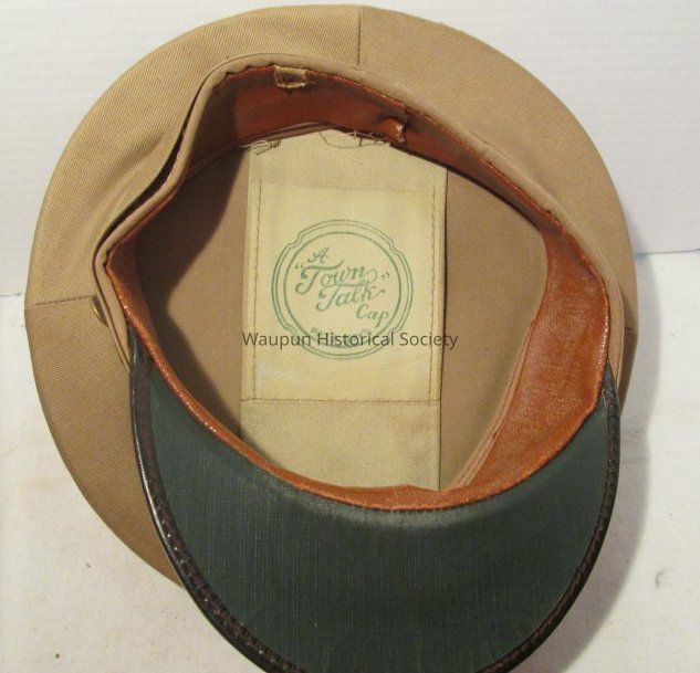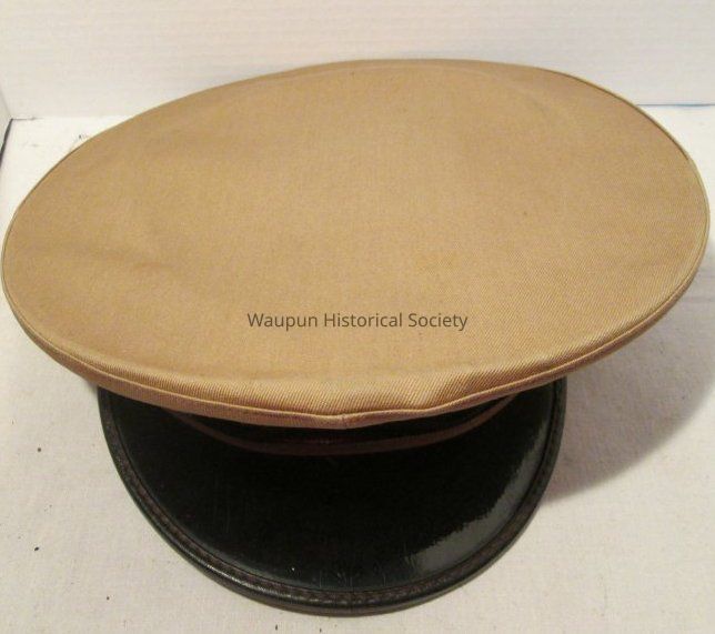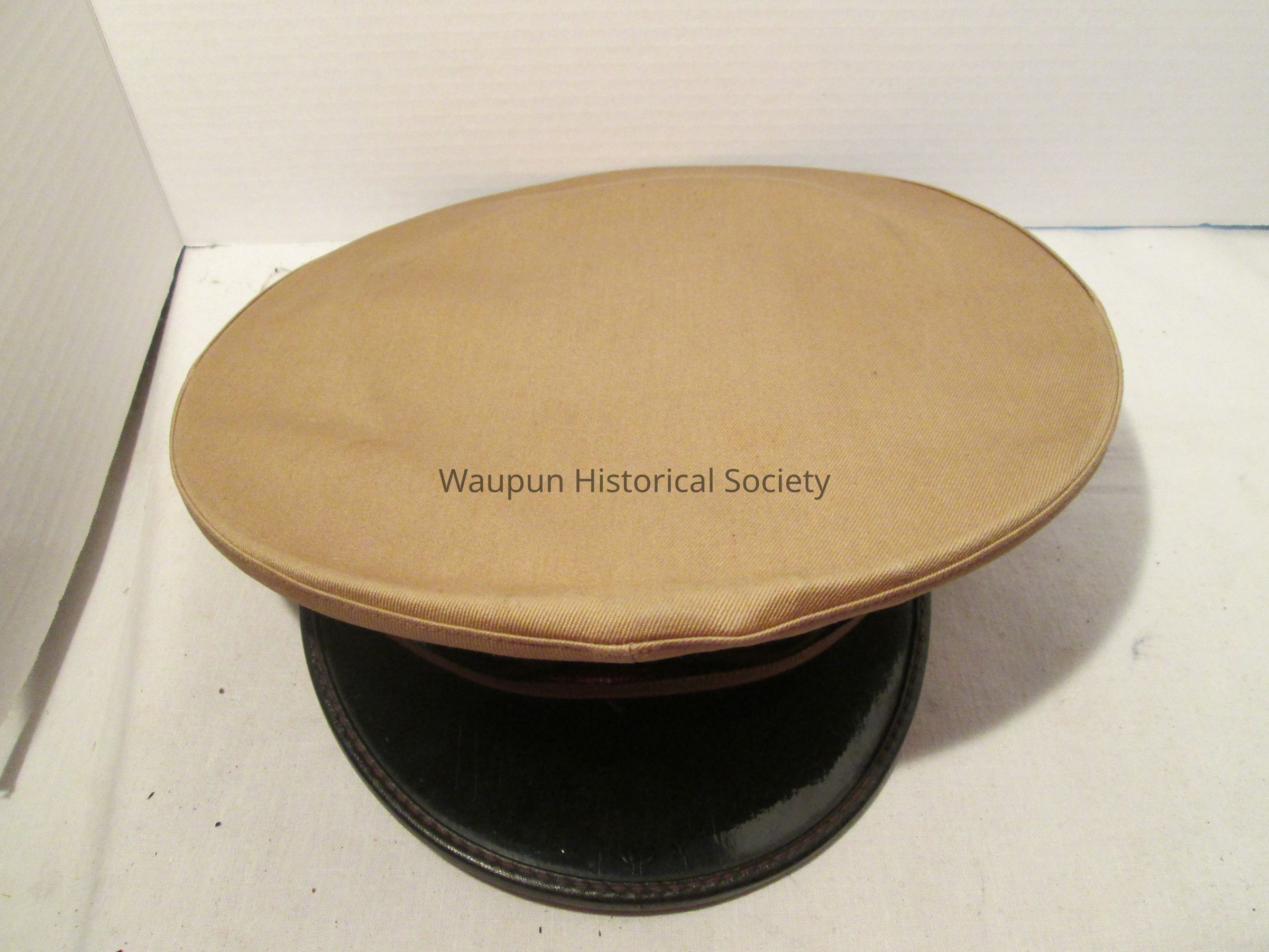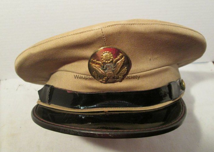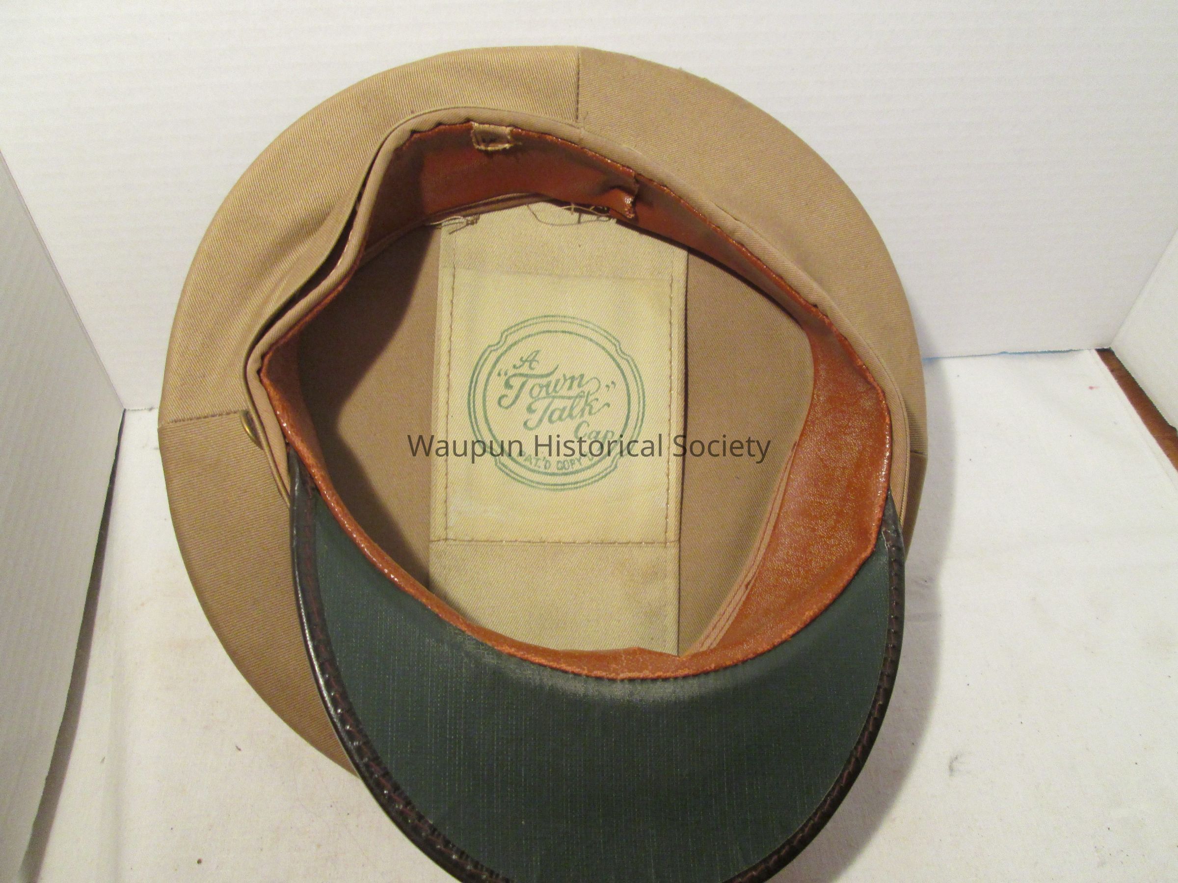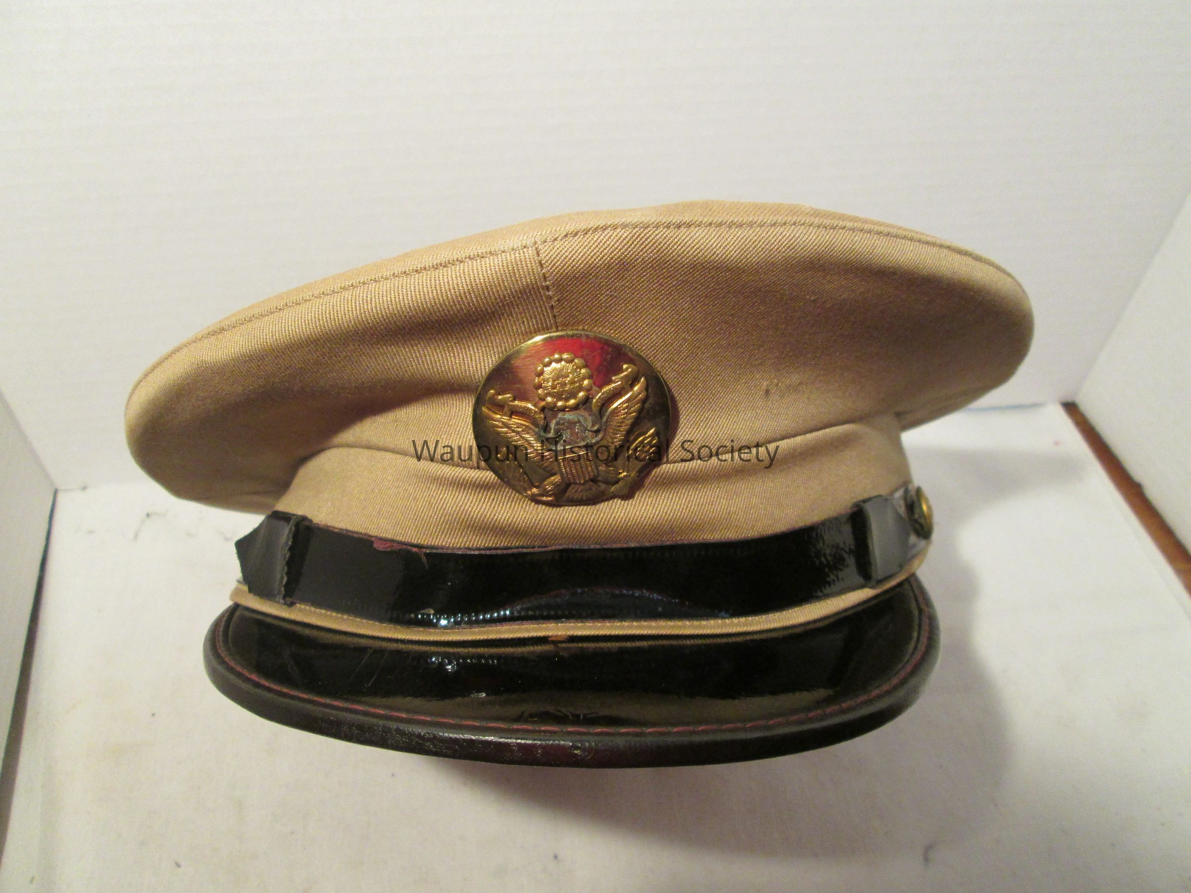 U.S. Military Tan Twill Army Hat with Black Strap and Round Gold Emblem for Army. Brim and band are both Black Patton Leather. Inside the hat in greeen lettering it states, "A Town Talk" Cap. Pat.'D copy D. Was worn by Dial Gray, the father of Sandy Gray.Acquisition