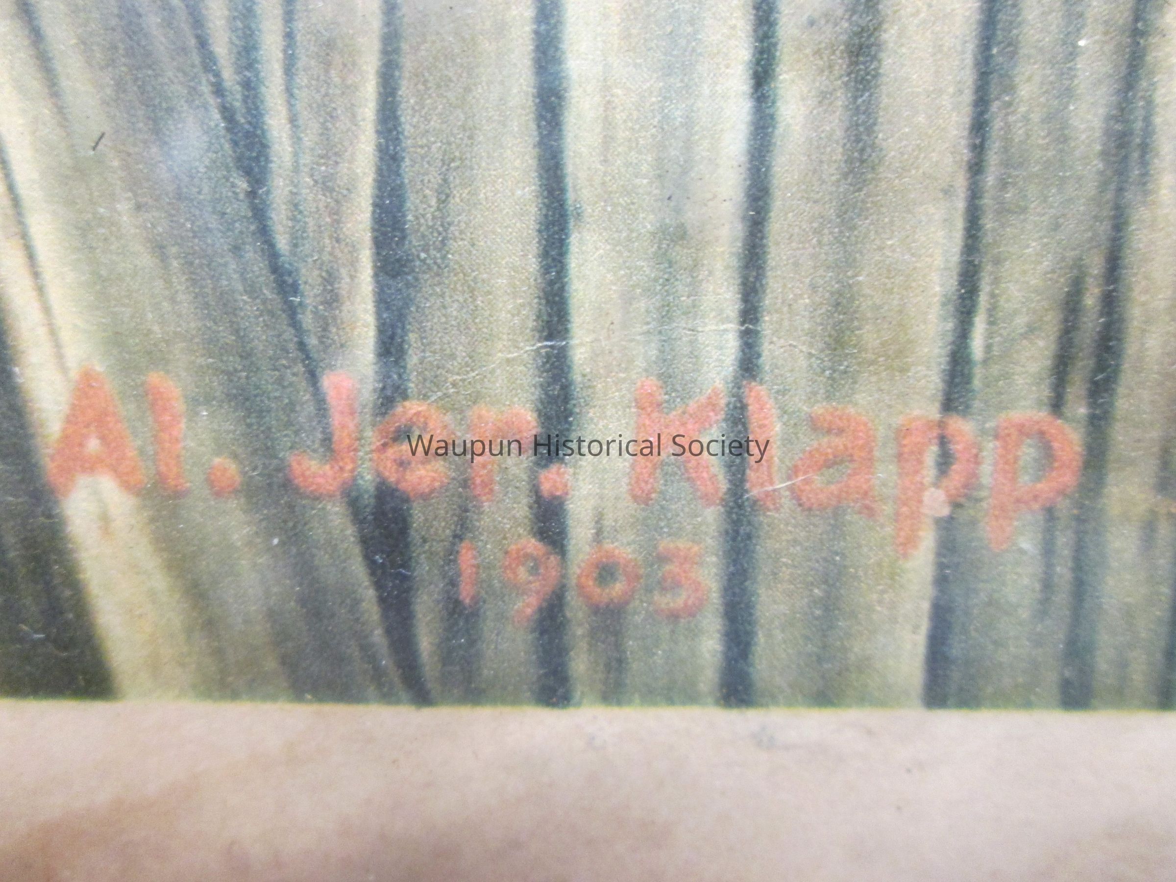 Color print of Andersonville Stockade during the Civil War. Possibly done by Al. Jer. Klapp in 1903. Print is in a very old ornate wooden frame with metal wire hanger on the back.