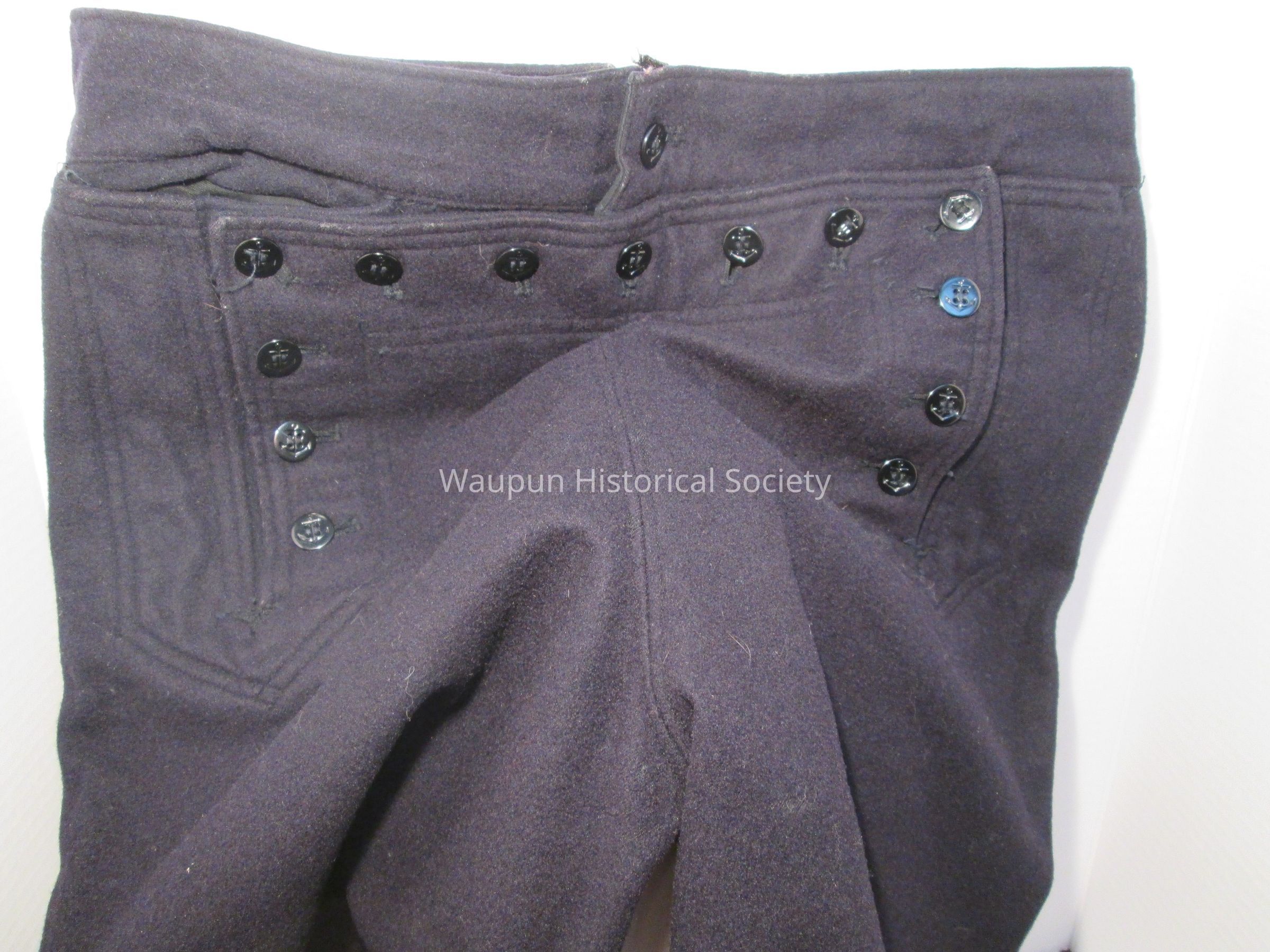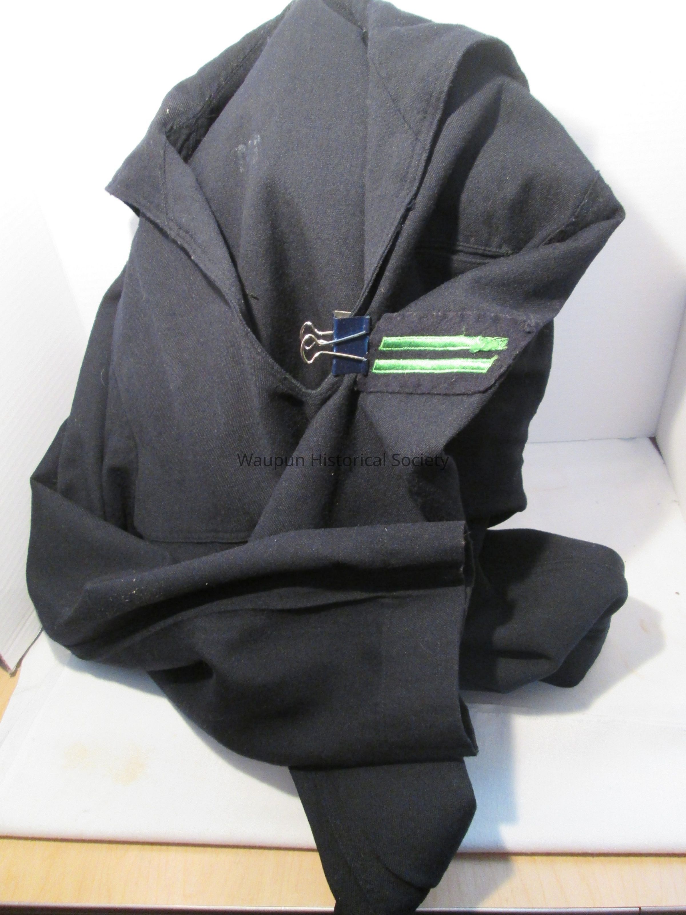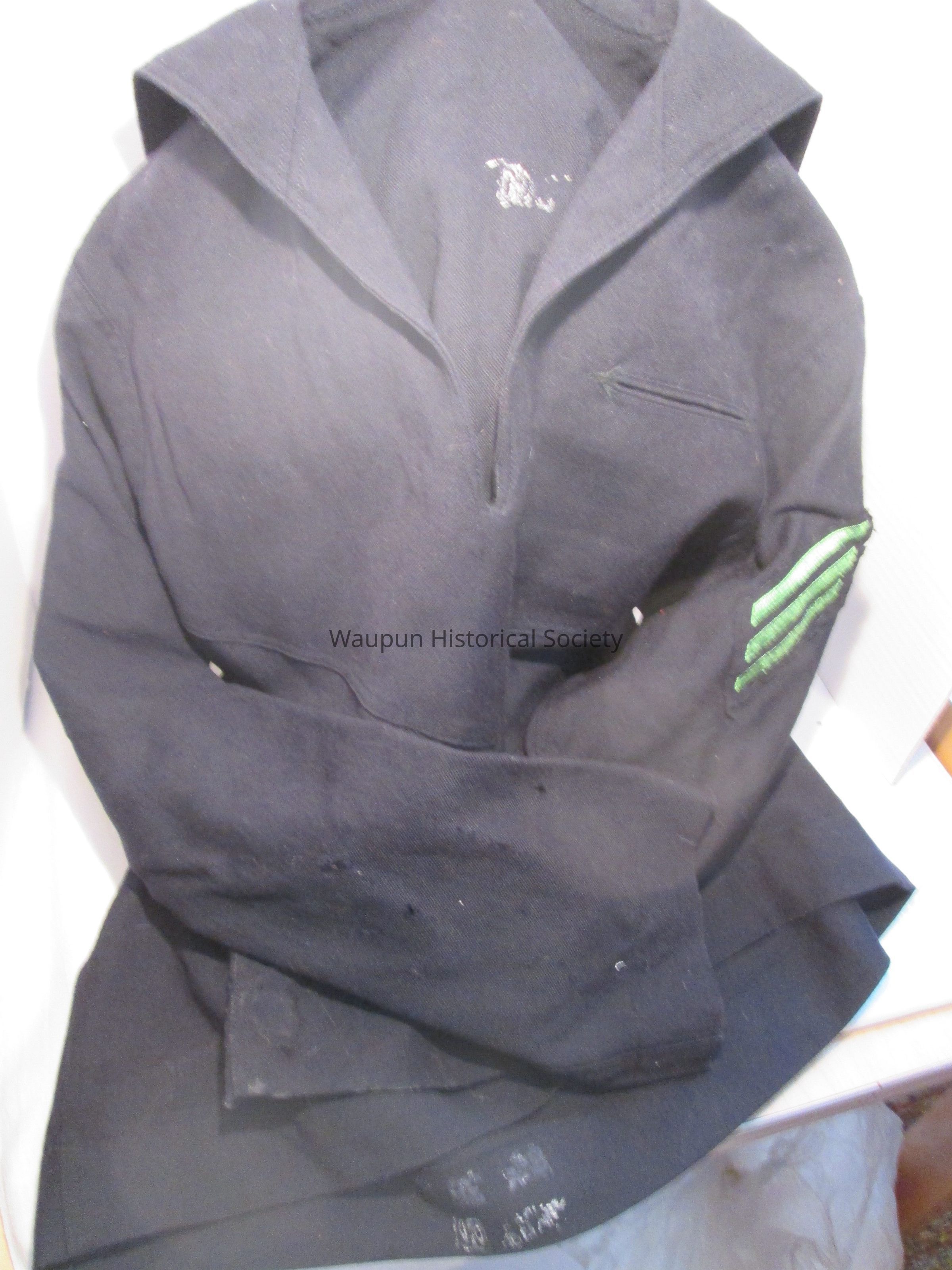 Black wool Naval Uniform Jumpsuit with (2) tops and (1) pants. Tops have "v" neck in front and square sailor collor in back. Pants have lace up back and 14 round anchor buttons on front side. (1) top has three green bars on left sleeve and (1) top has 2 green bars on left sleeve. All three items are very worn and have numerous holes in fabric.Acquisition