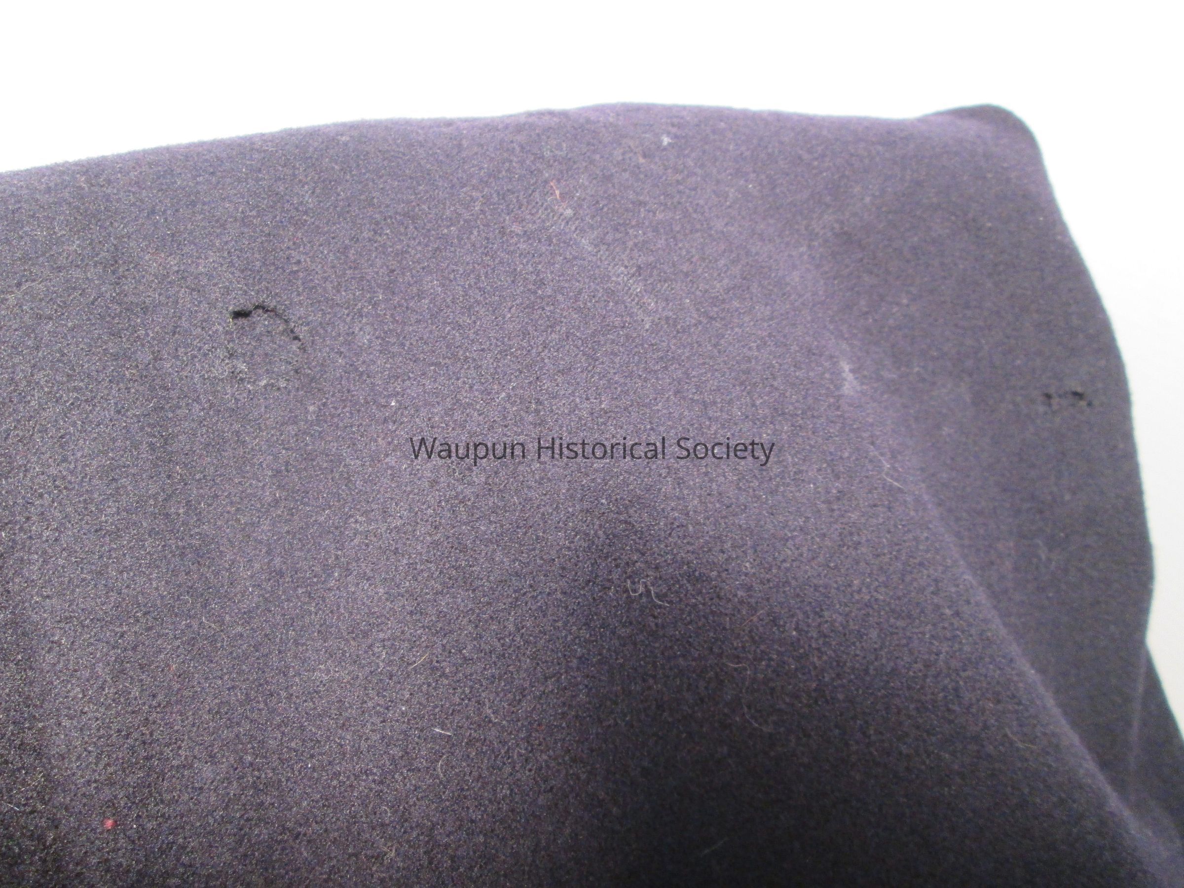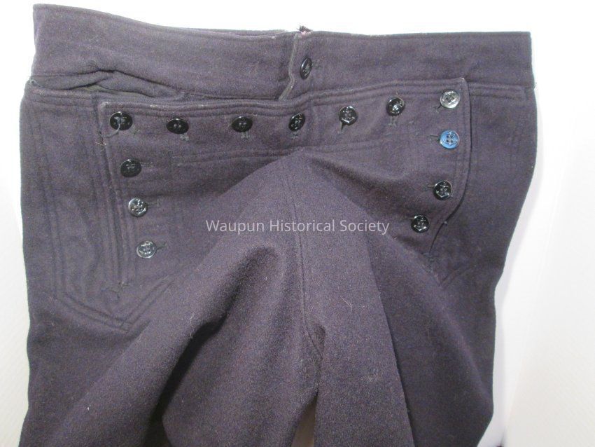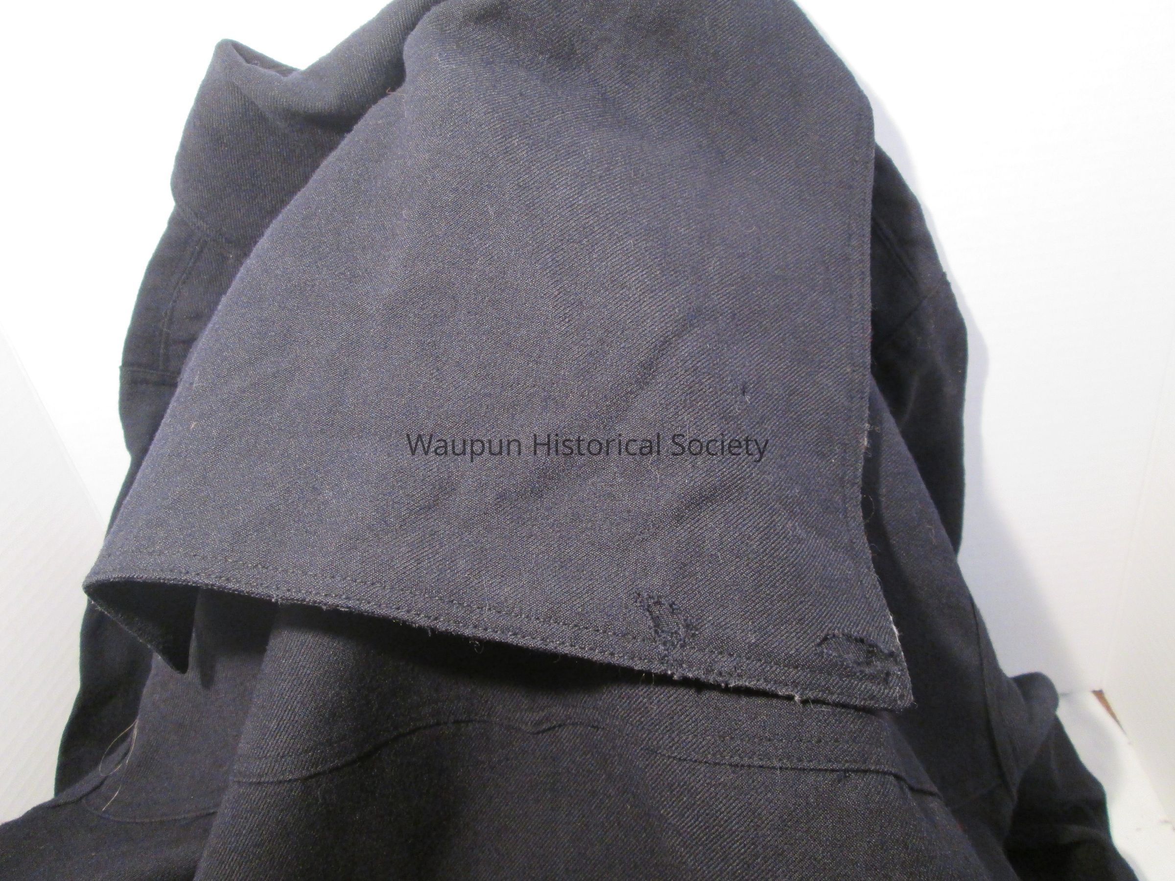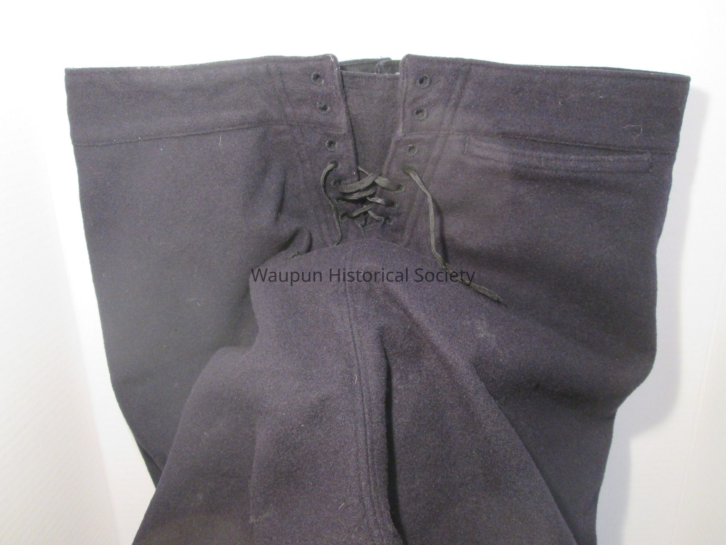 Black wool Naval Uniform Jumpsuit with (2) tops and (1) pants. Tops have "v" neck in front and square sailor collor in back. Pants have lace up back and 14 round anchor buttons on front side. (1) top has three green bars on left sleeve and (1) top has 2 green bars on left sleeve. All three items are very worn and have numerous holes in fabric.Acquisition
