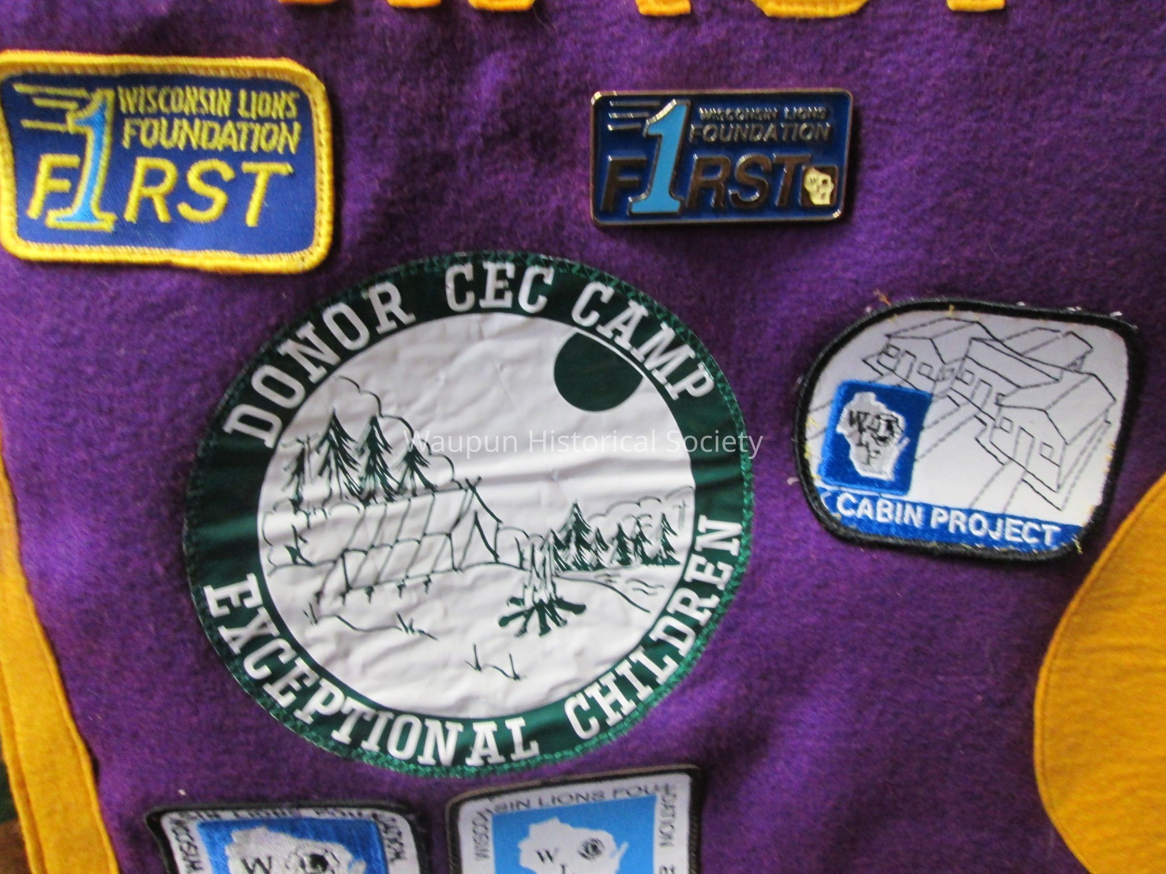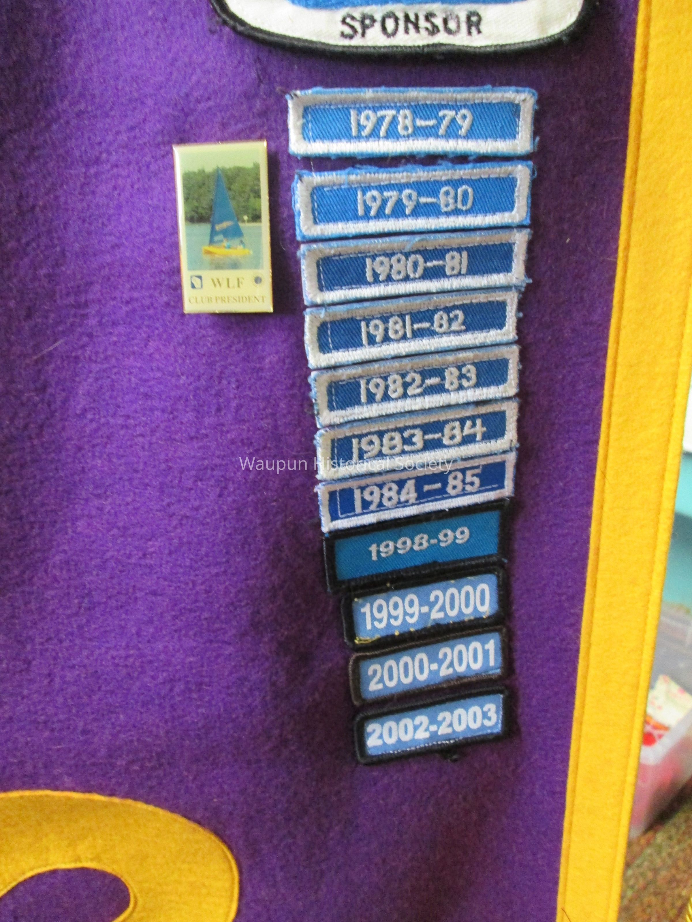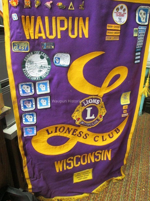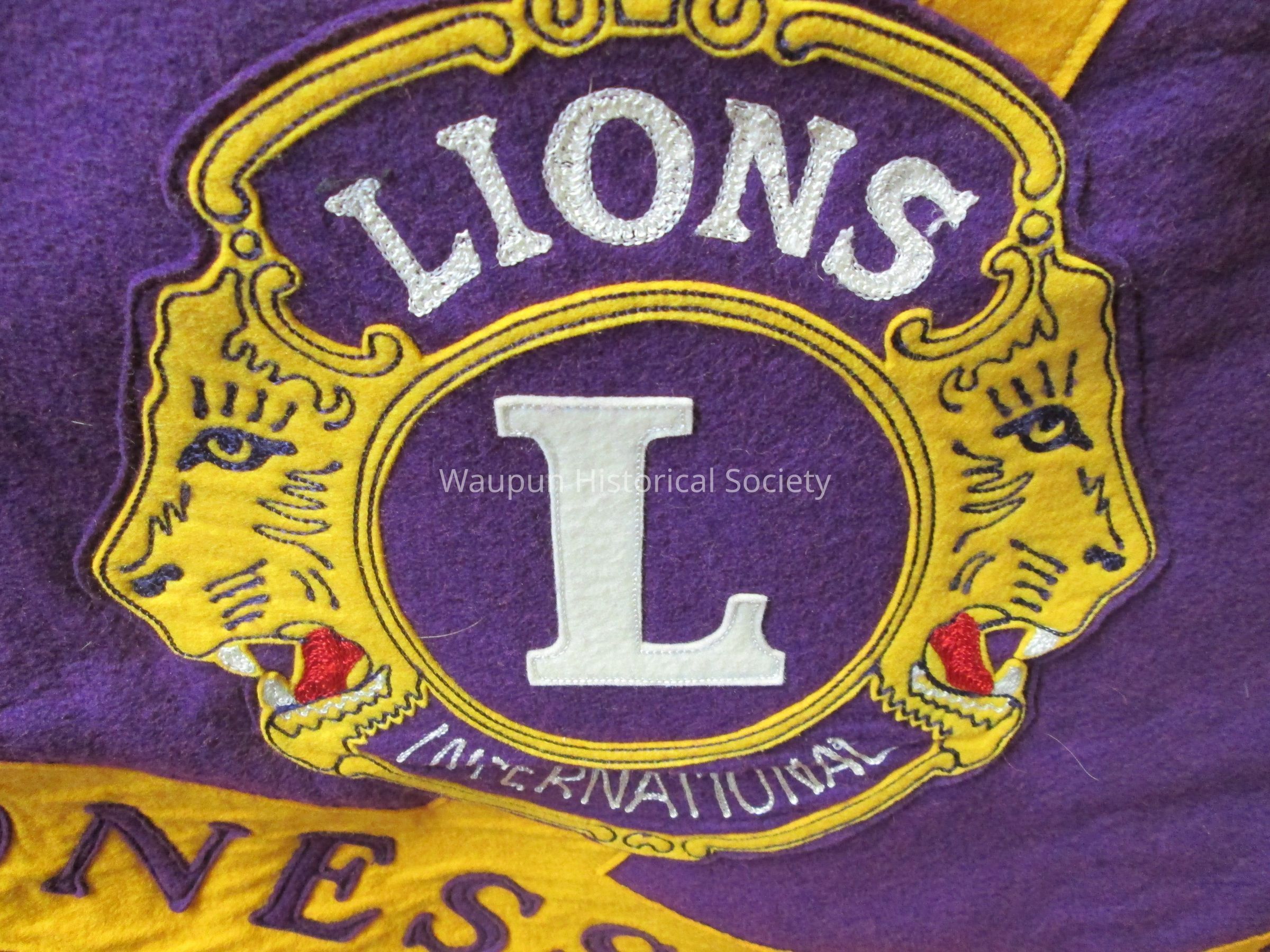 Purple and Yellow Felt Waupun Lioness Banner for the years of 1978 through 2009. Contains yearly membership patches and Wisconsin Lions Foundation Appreciation Award patches. Also included at the top of the banner are some of the trading pins designed by members of the club. Flag hanges from a collapsable metal tripod.