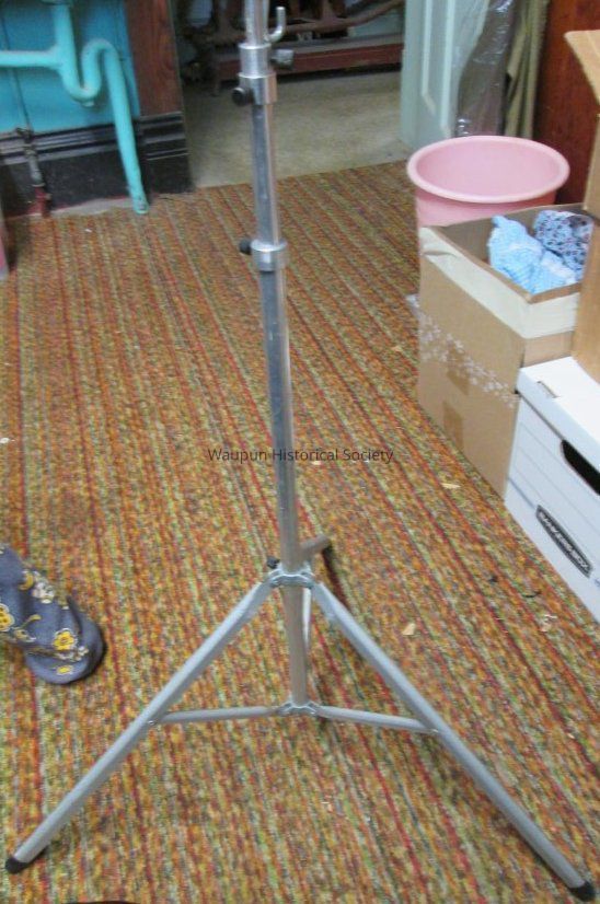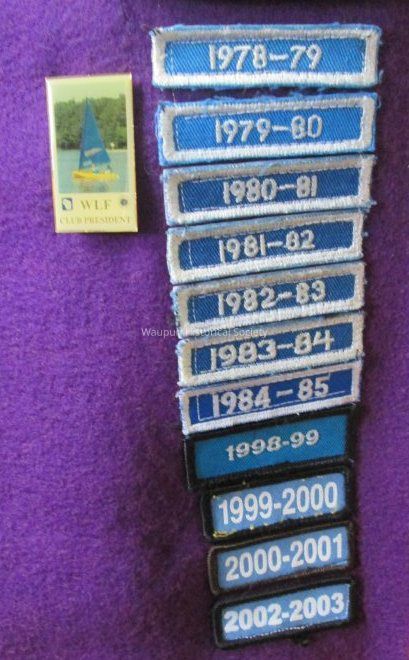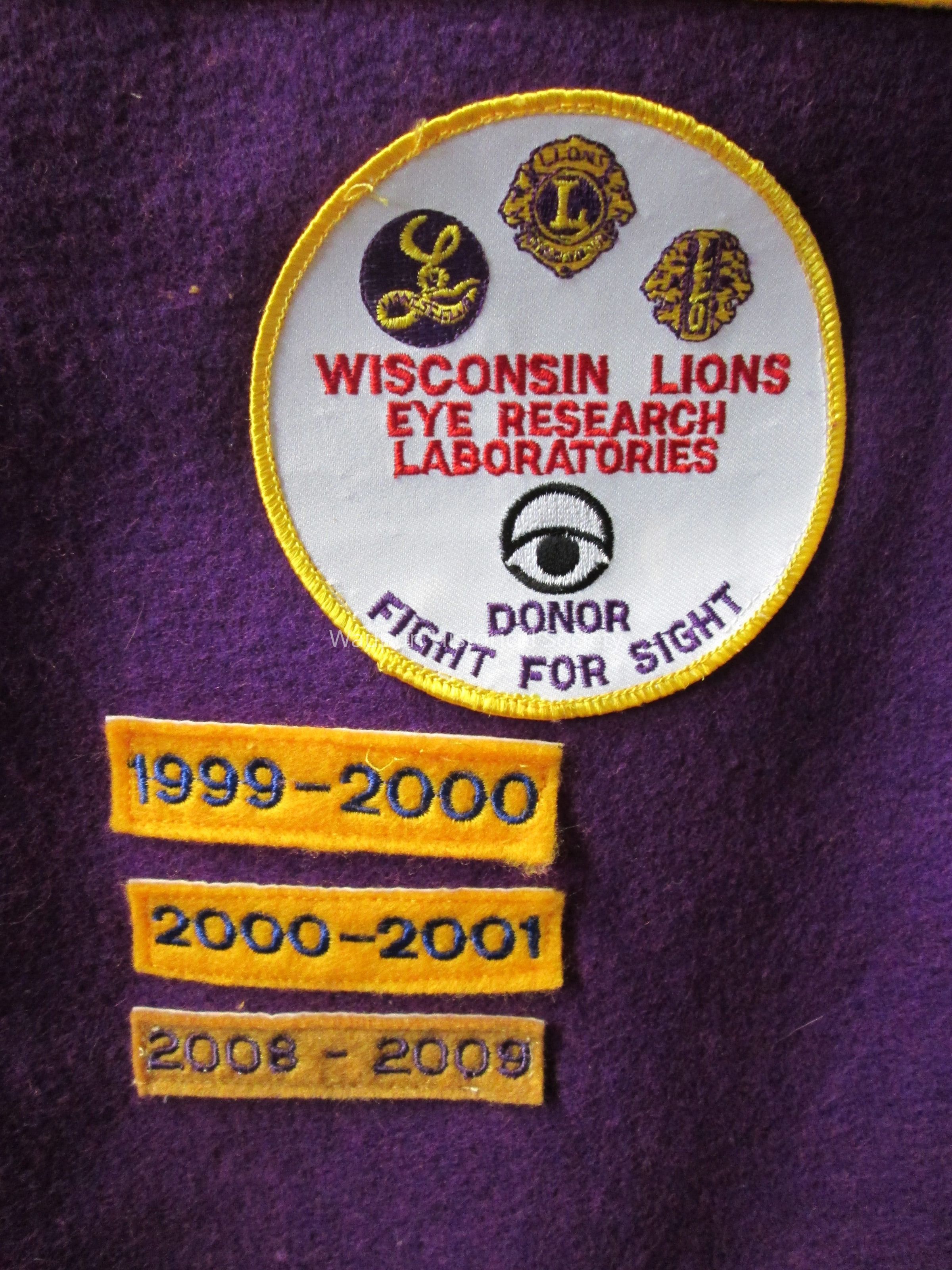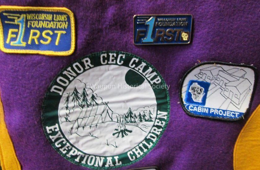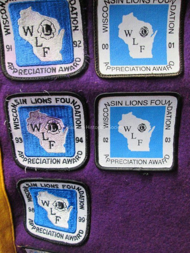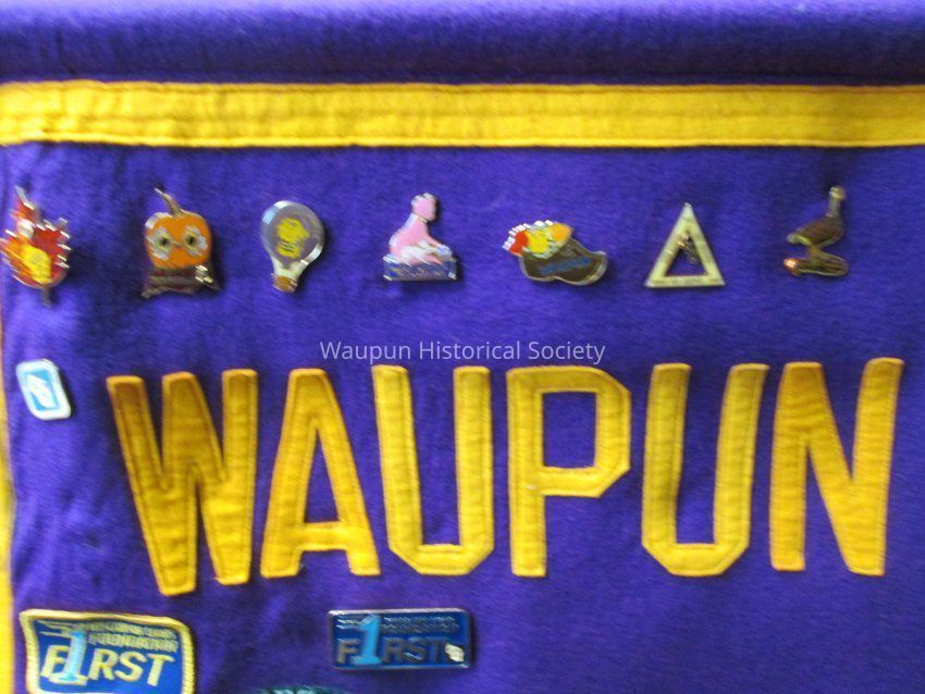 Purple and Yellow Felt Waupun Lioness Banner for the years of 1978 through 2009. Contains yearly membership patches and Wisconsin Lions Foundation Appreciation Award patches. Also included at the top of the banner are some of the trading pins designed by members of the club. Flag hanges from a collapsable metal tripod.