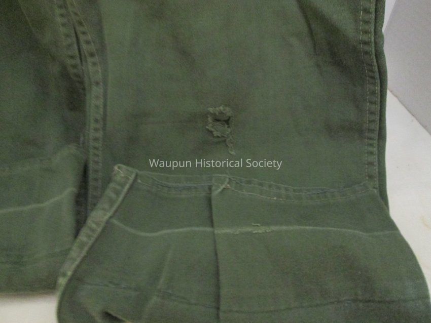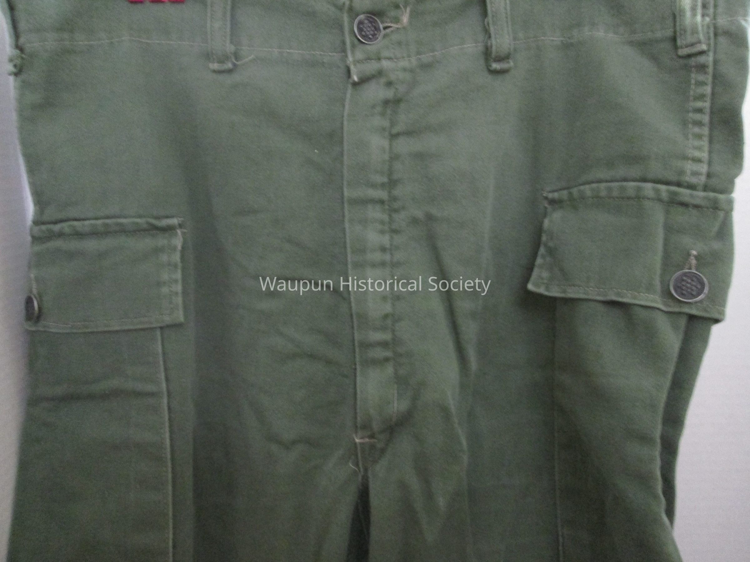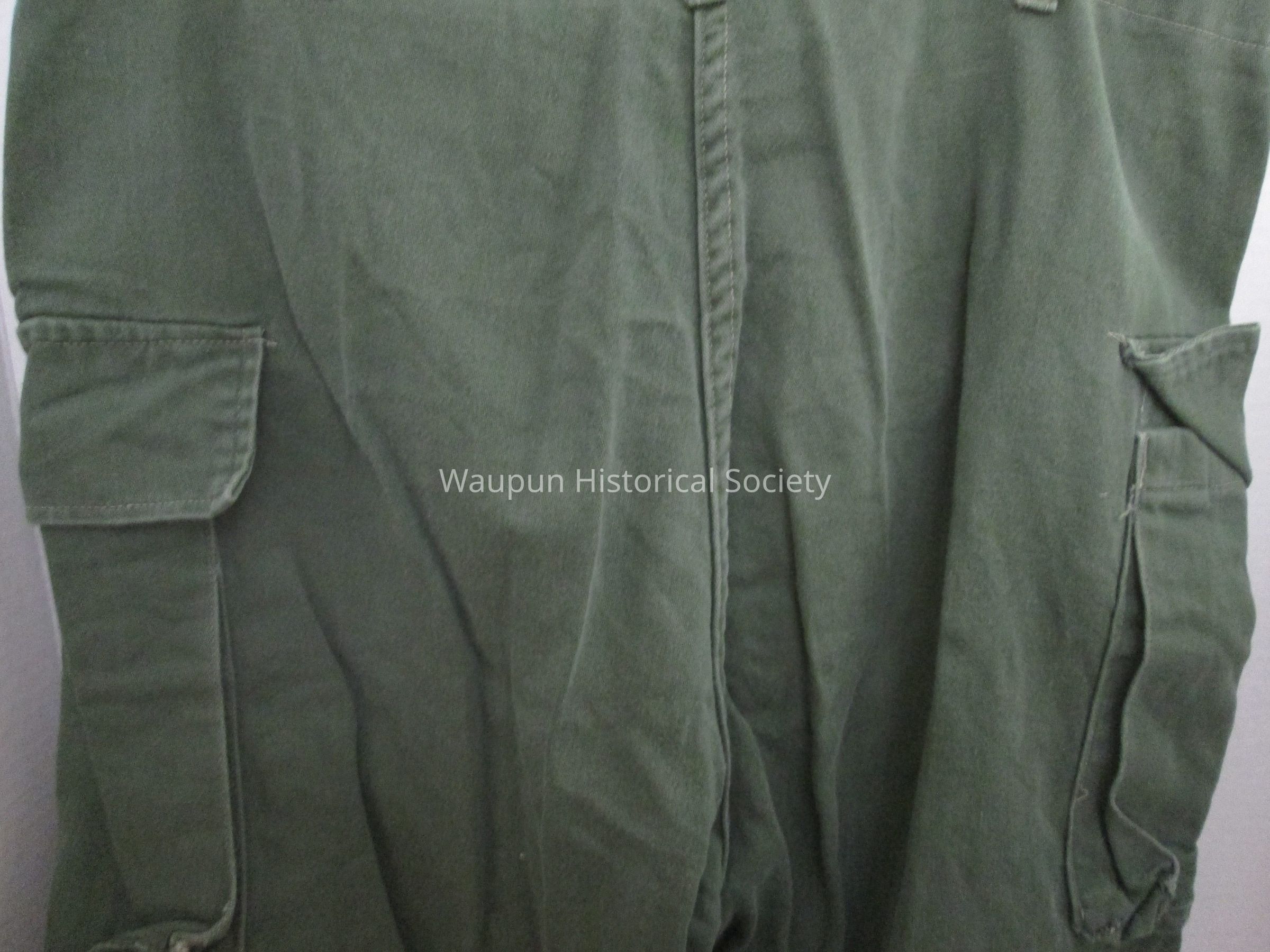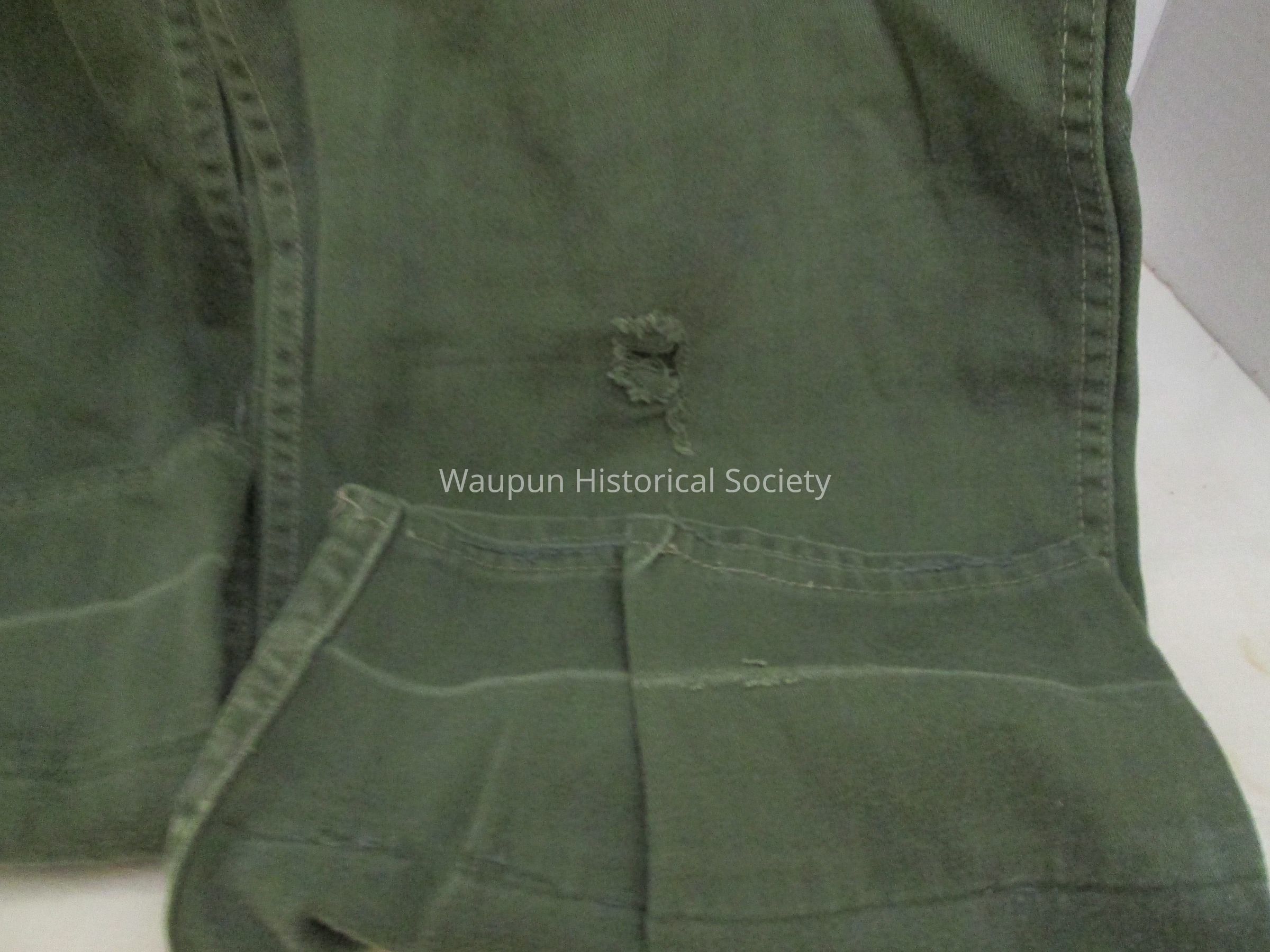 Military Uniform pants. Olive green color with zipper and button fly and 2 cargo pockets on legs. There is a hole in the front of left leg.Acquisition