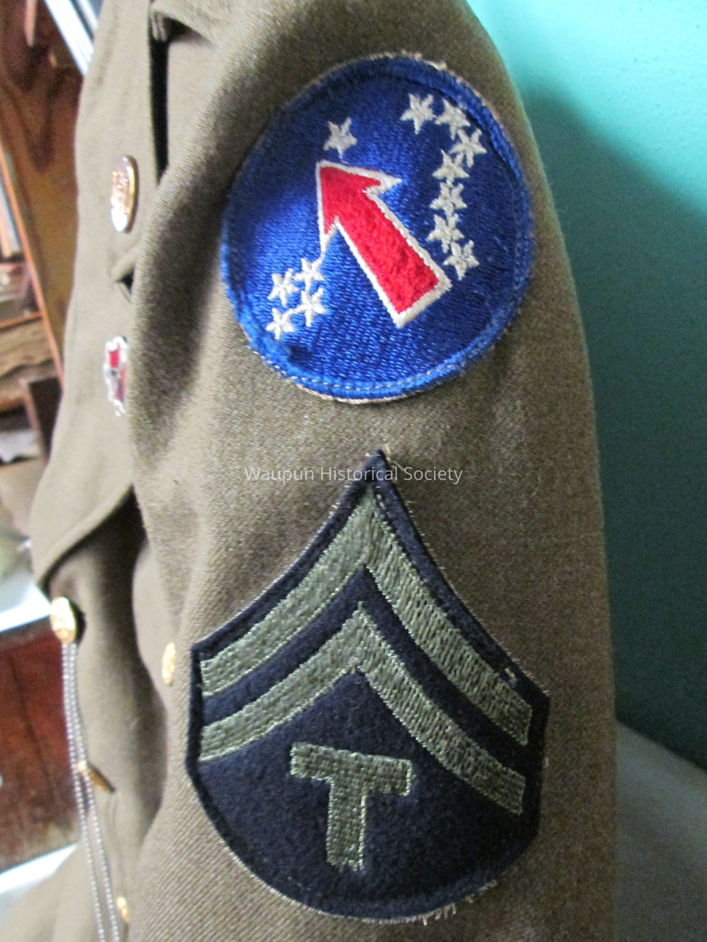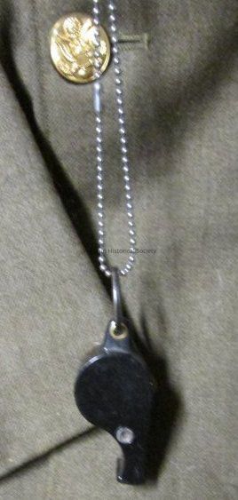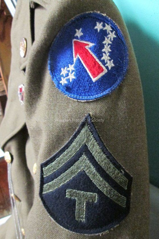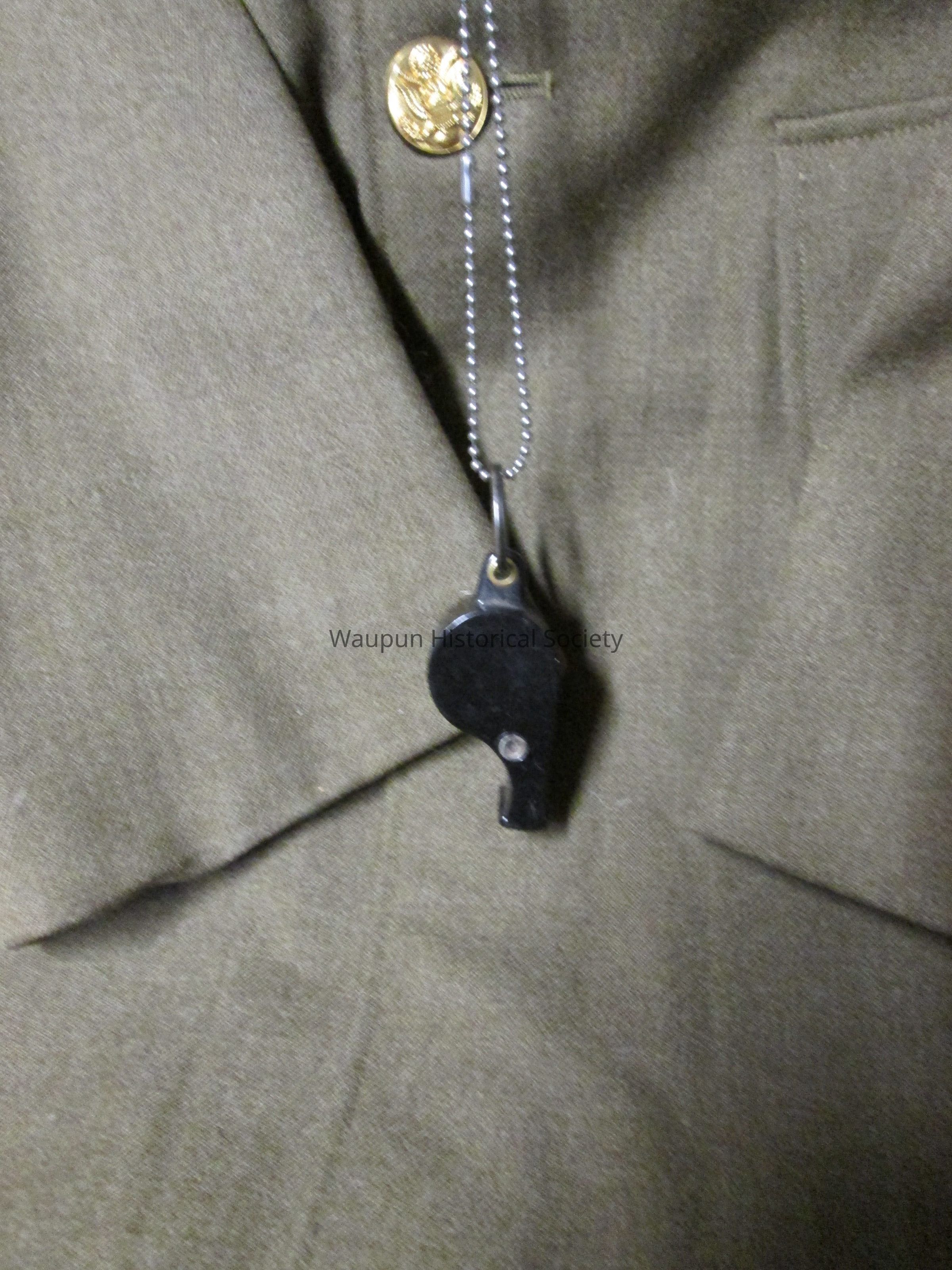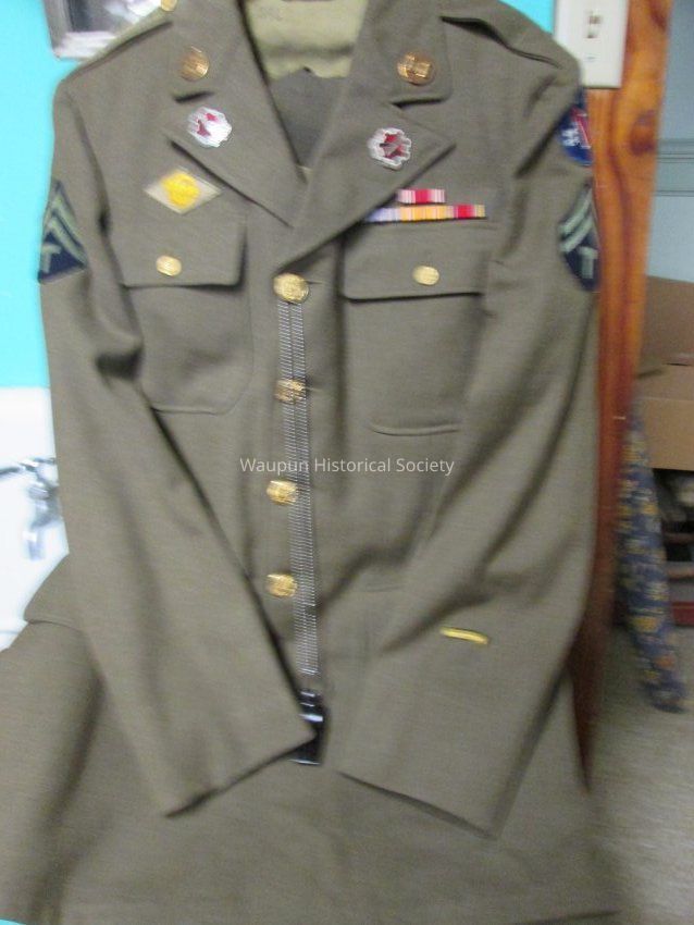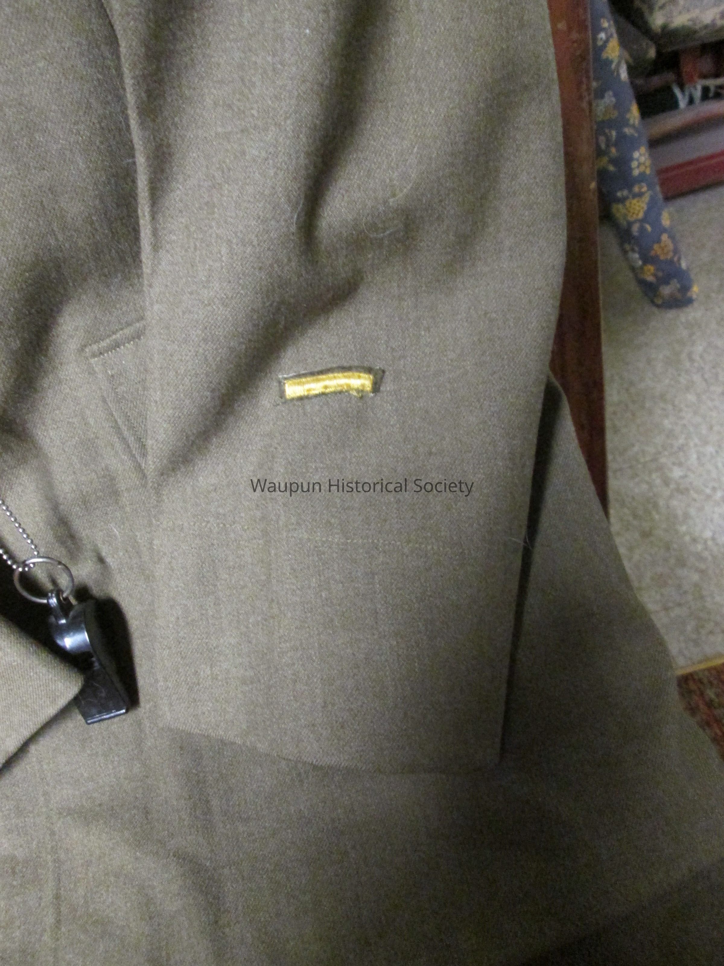 WW II US Army Pacific Commander's Uniform. Jacket, Pants and belt. All are Olive green colored. Jacket has numerous patches including a round Pacific Commander patch on left shoulder, (2) Black Tech patches with green "T" and 2 chevrons and a WW II Golden eagle diamond shaped patch. Milititary pins on collars and lapels. One gold bar on bottom of left sleeve. a black plastic whistle, on a silver chain, is attatched to a front button hole.Acquisition