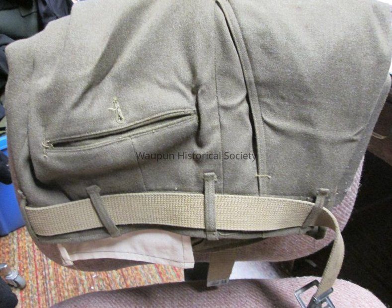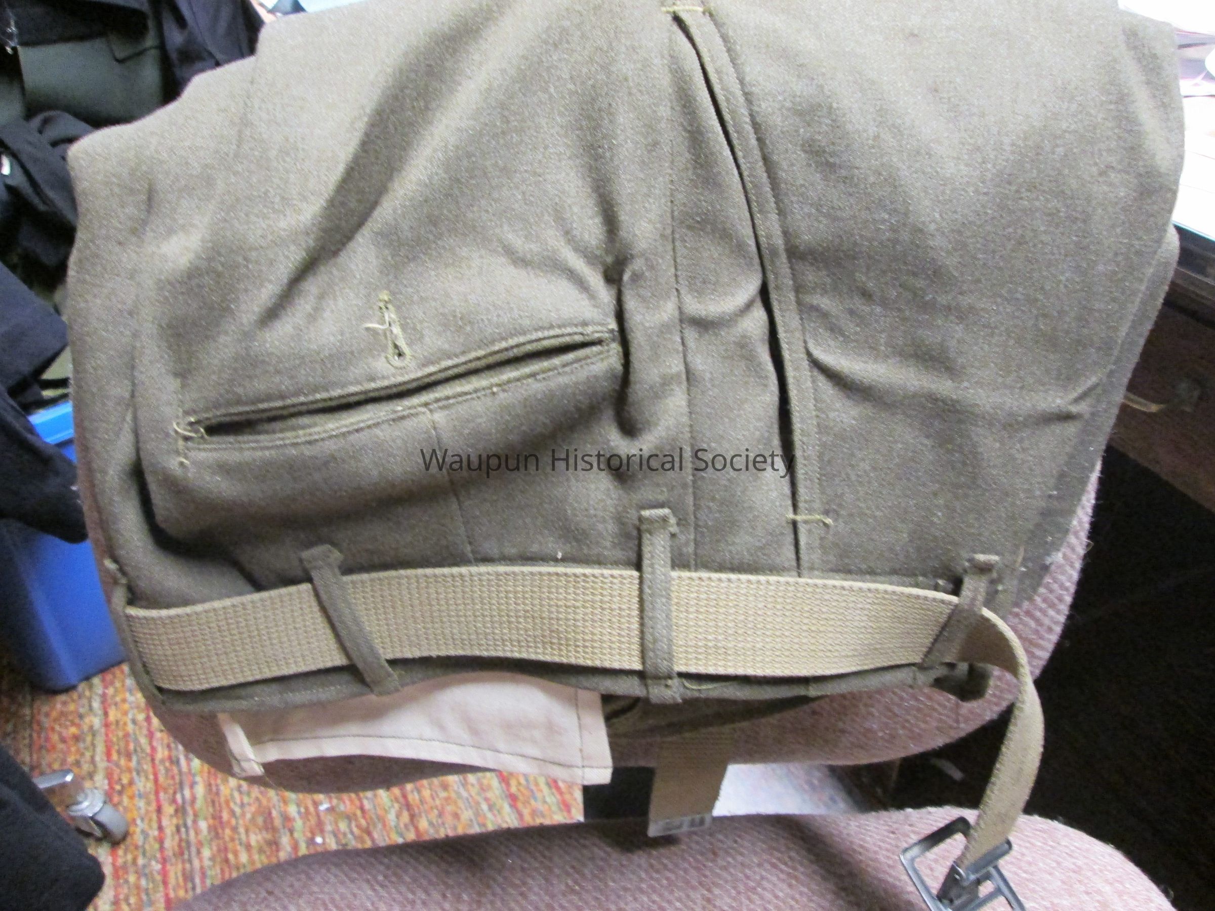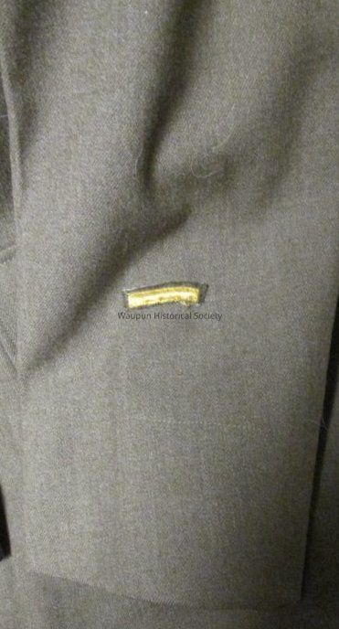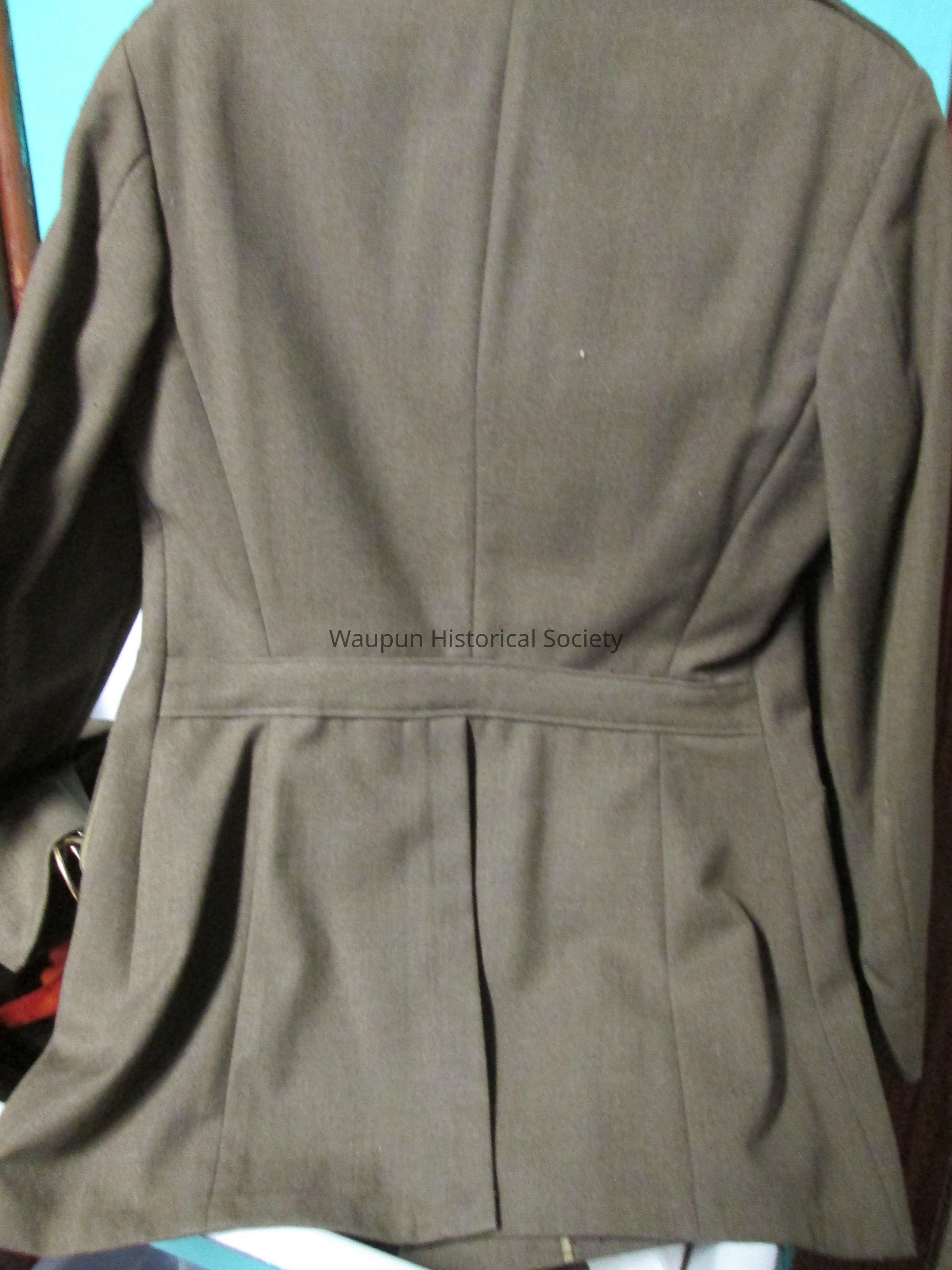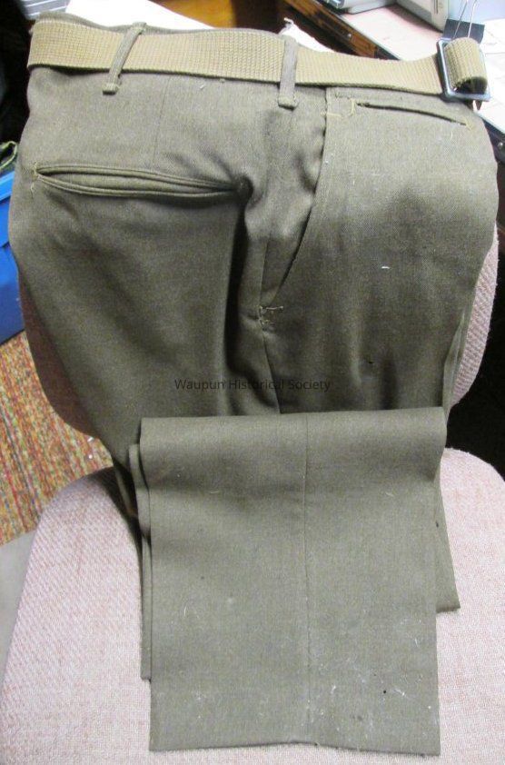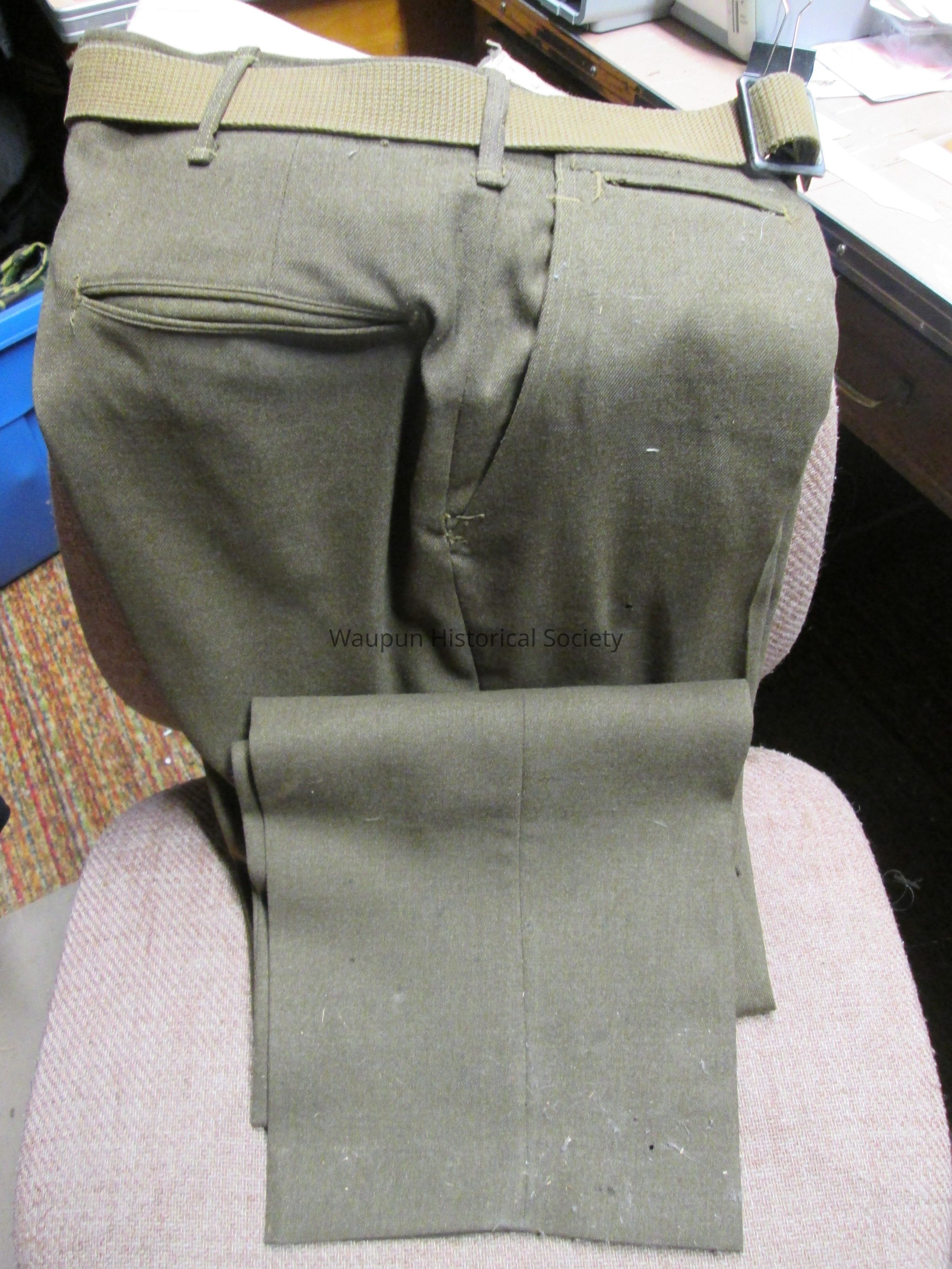 WW II US Army Pacific Commander's Uniform. Jacket, Pants and belt. All are Olive green colored. Jacket has numerous patches including a round Pacific Commander patch on left shoulder, (2) Black Tech patches with green "T" and 2 chevrons and a WW II Golden eagle diamond shaped patch. Milititary pins on collars and lapels. One gold bar on bottom of left sleeve. a black plastic whistle, on a silver chain, is attatched to a front button hole.Acquisition