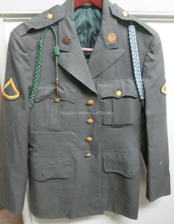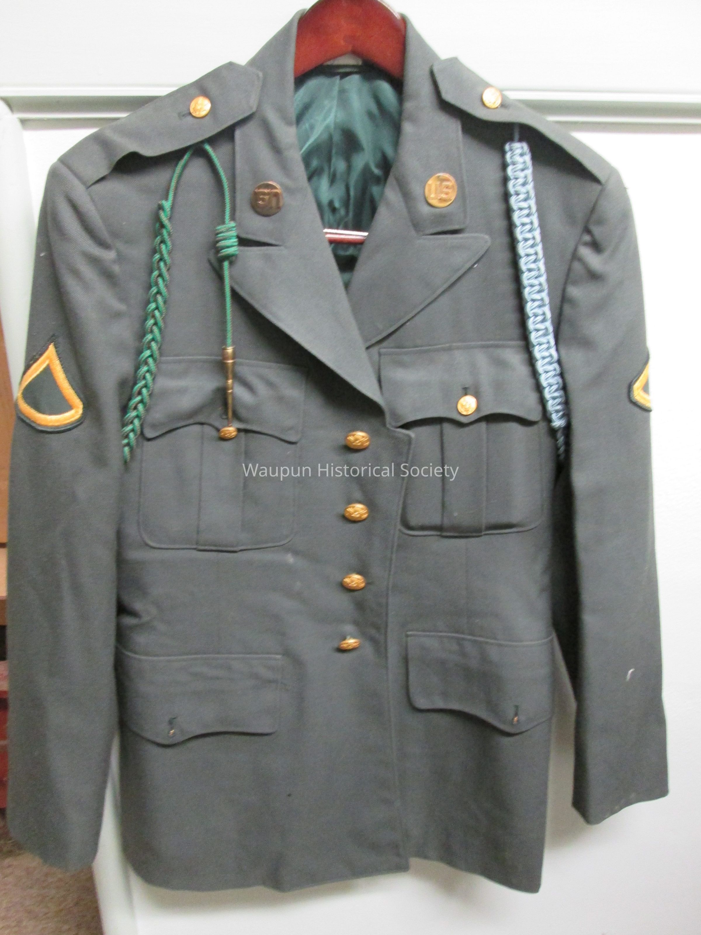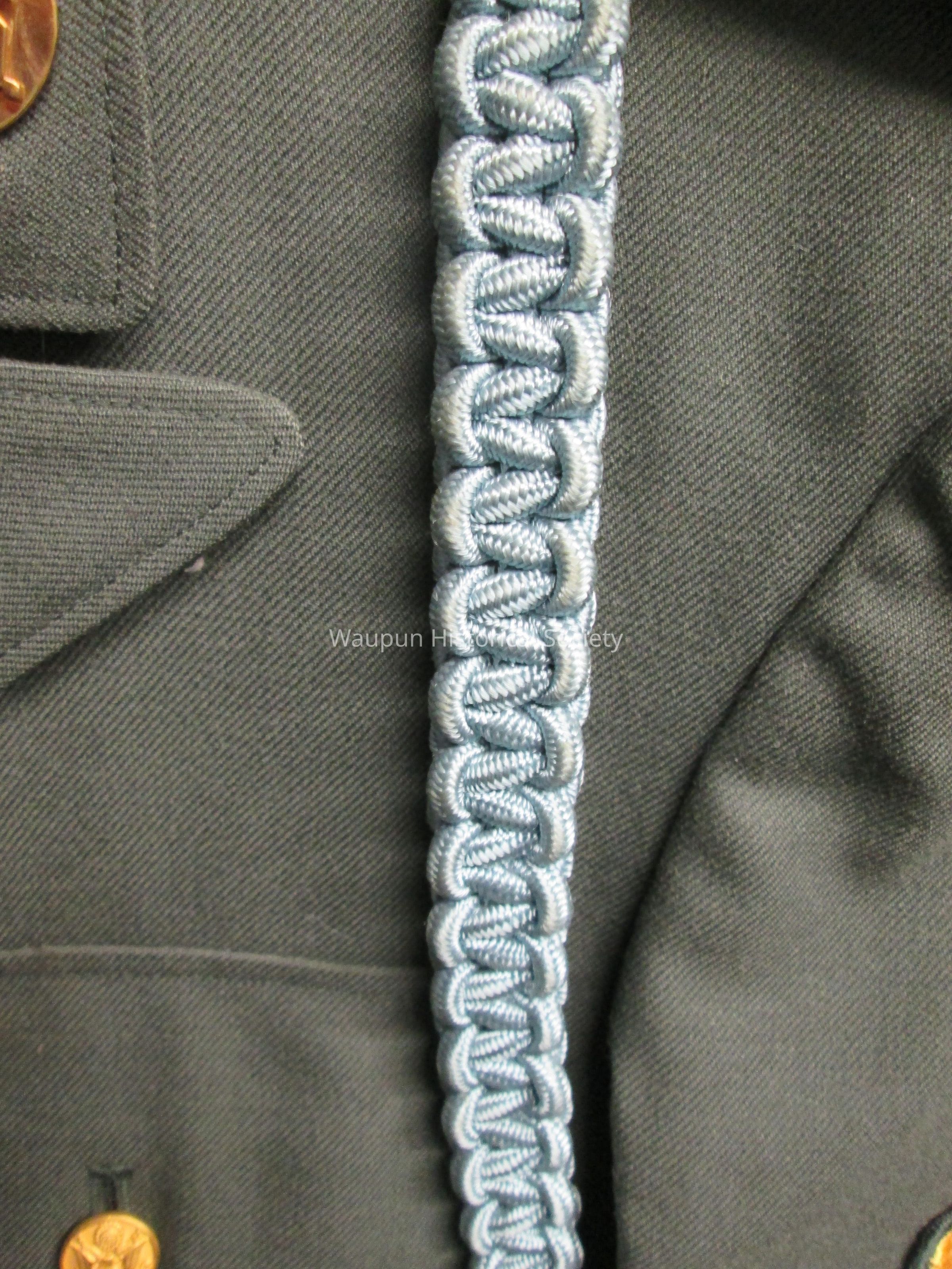 WW II Army Air Corps Uniform Jacket. There is a ranking patch designating that this soldier was a private 1st class. The blue cord on the left shoulder stands for infantry and the red and green cord on the right shoulder is a French Fourragere Shoulder Cord.Acquisition