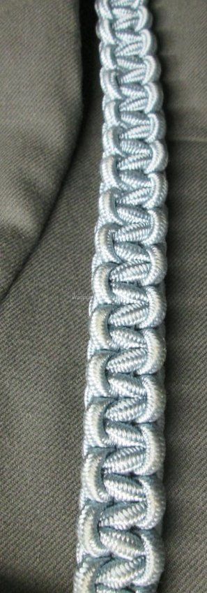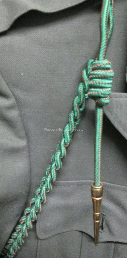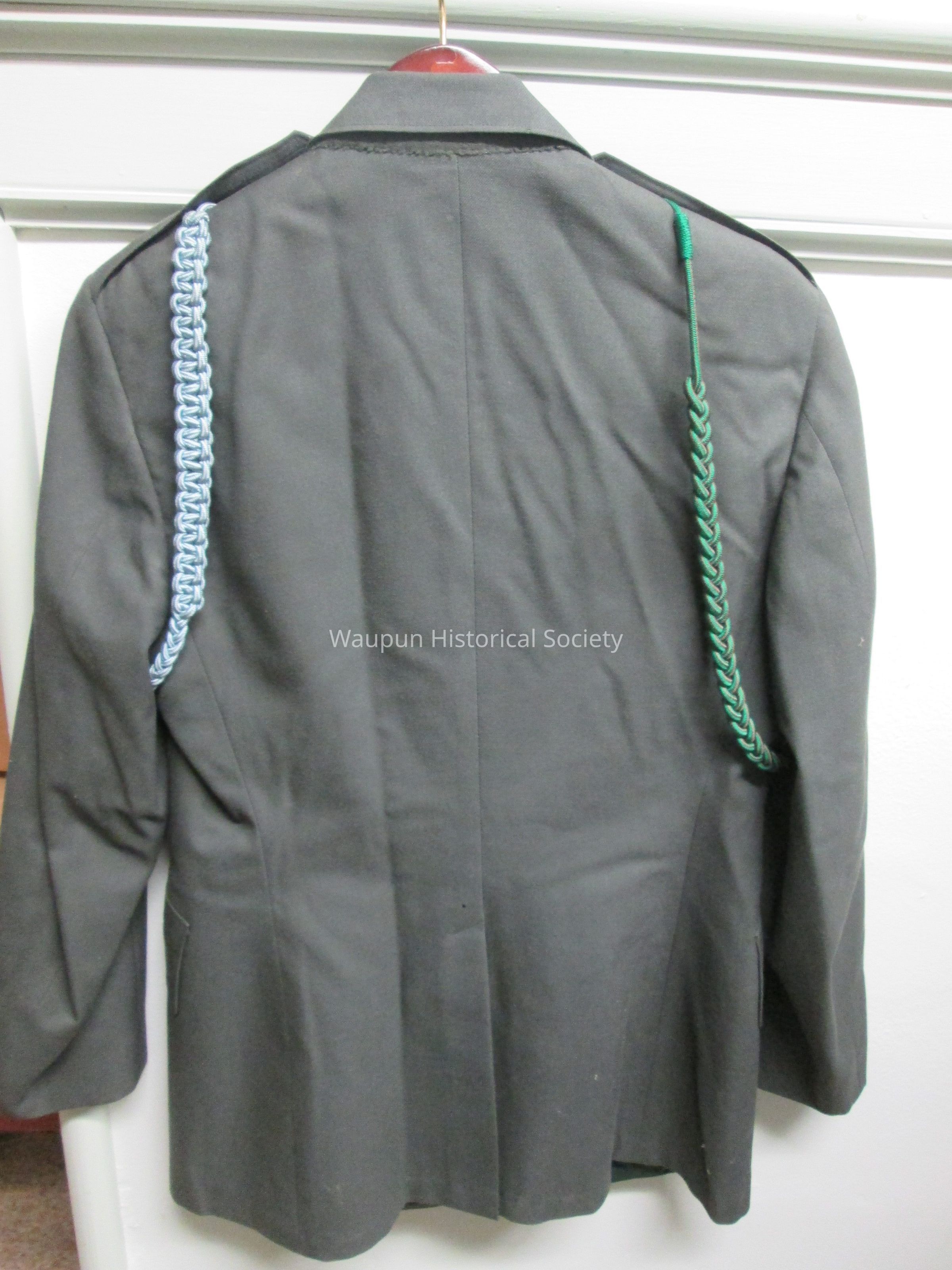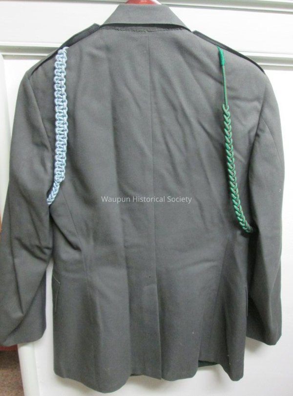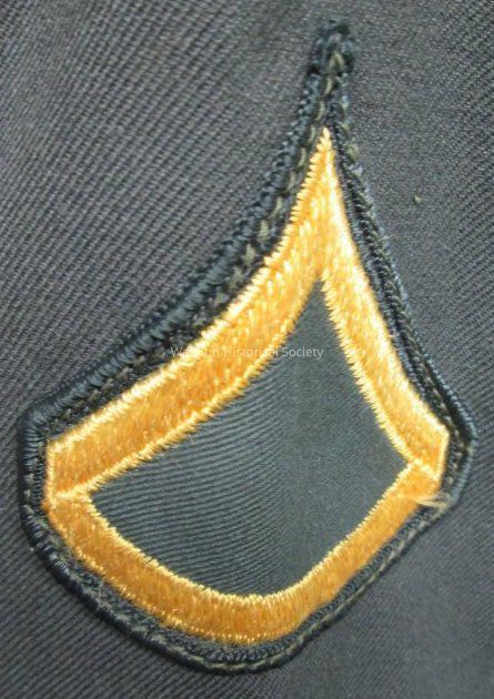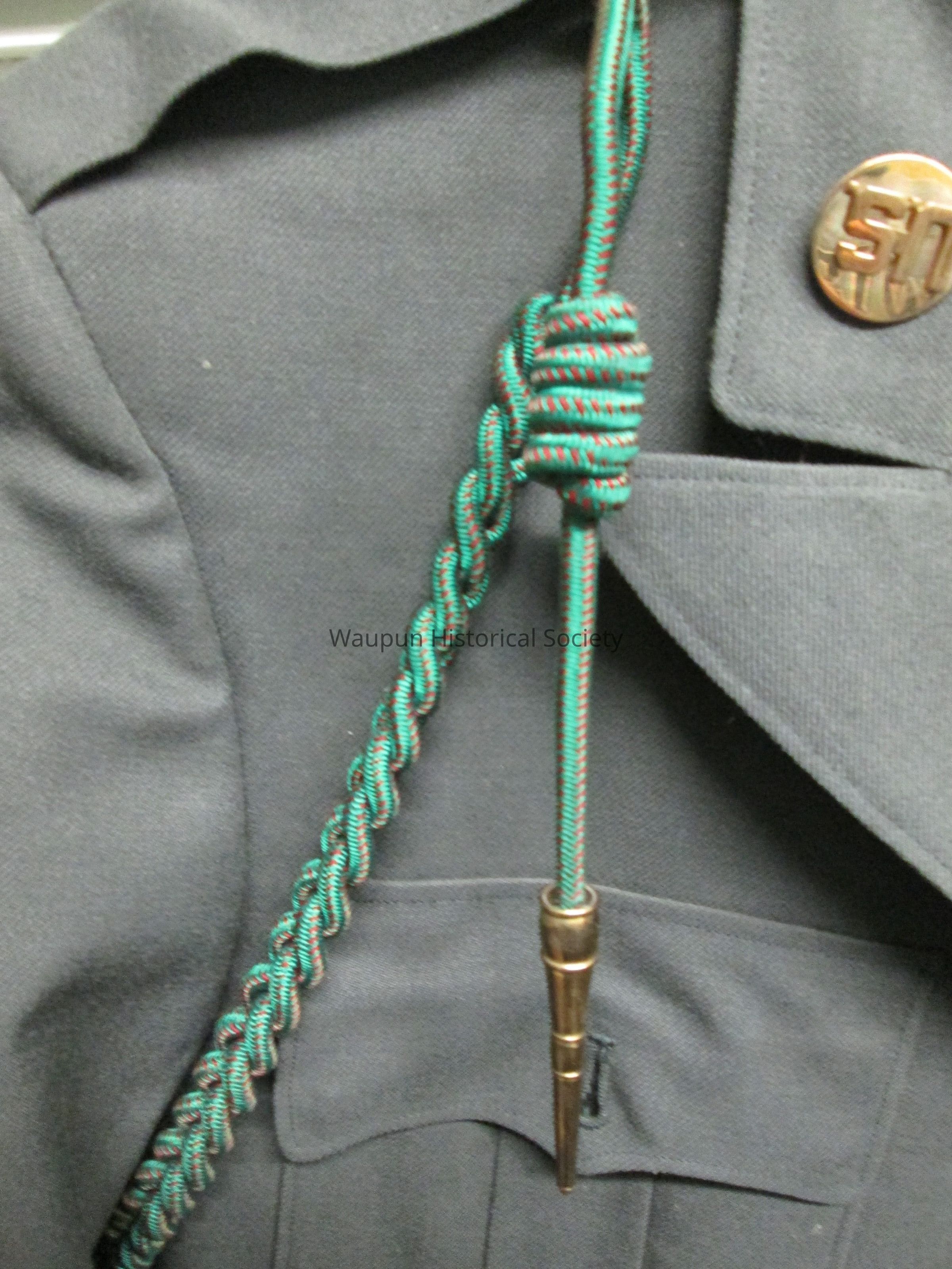 WW II Army Air Corps Uniform Jacket. There is a ranking patch designating that this soldier was a private 1st class. The blue cord on the left shoulder stands for infantry and the red and green cord on the right shoulder is a French Fourragere Shoulder Cord.Acquisition