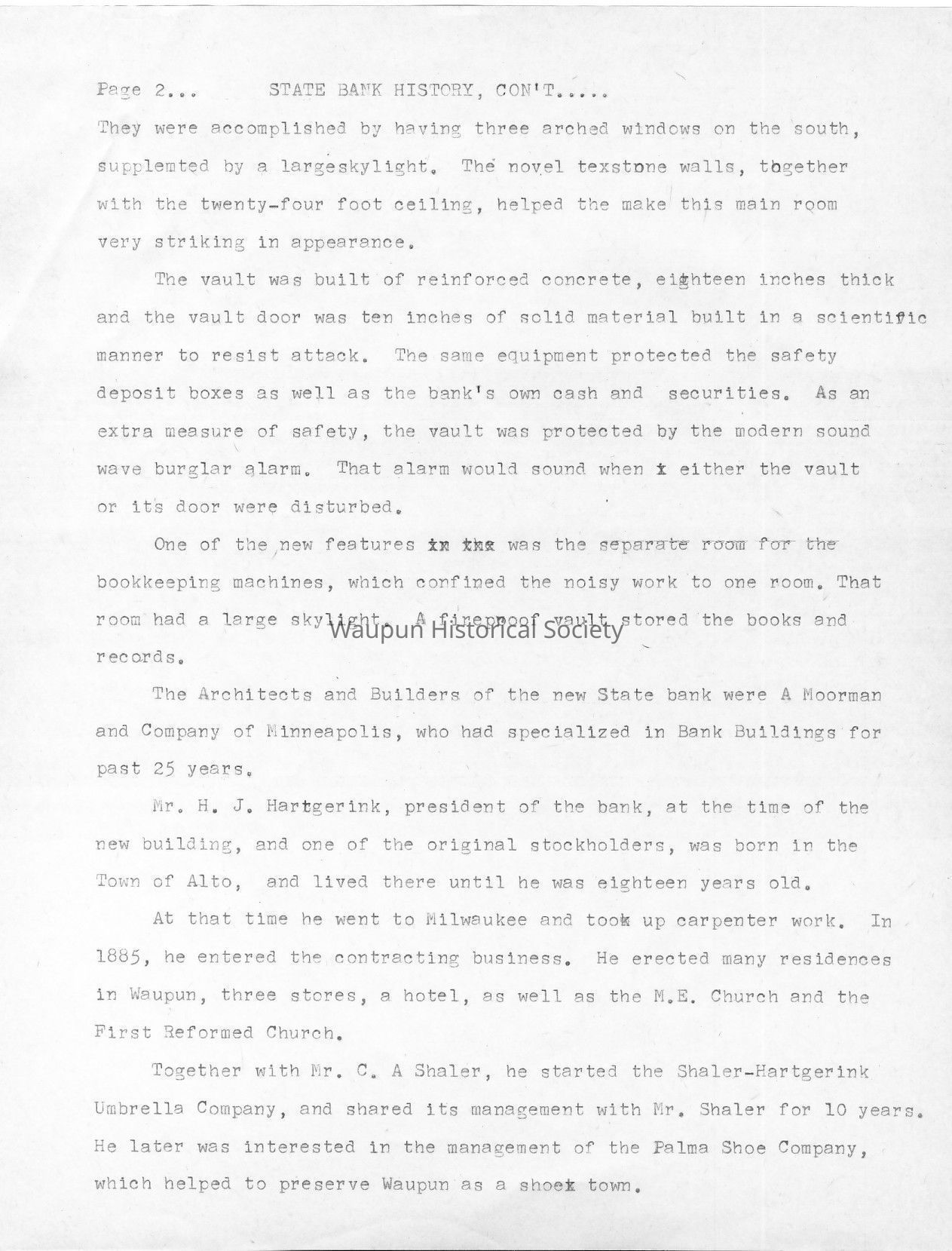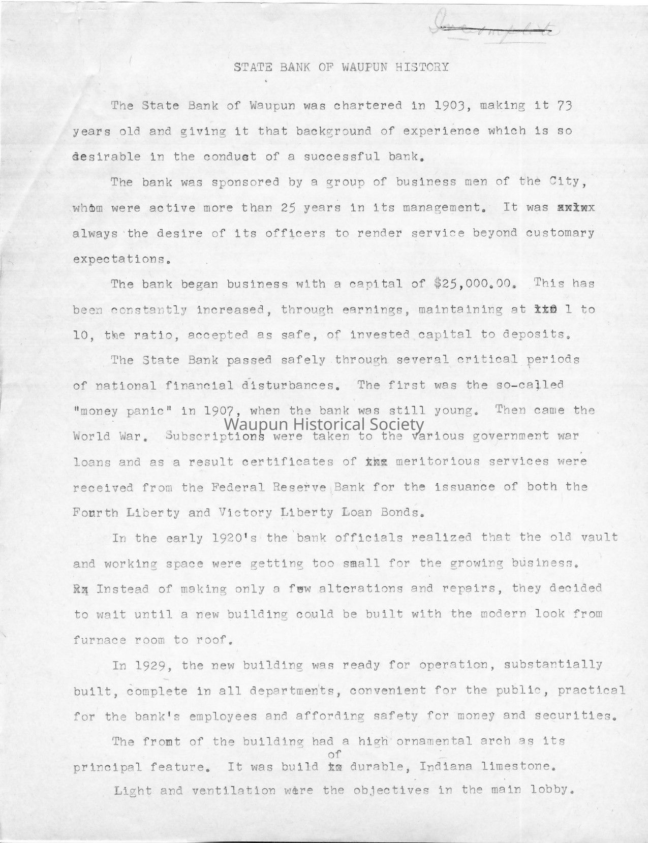 Historical information on State Bank of Waupun History for 1976 Bicentennial Celebration in Waupun, WI.