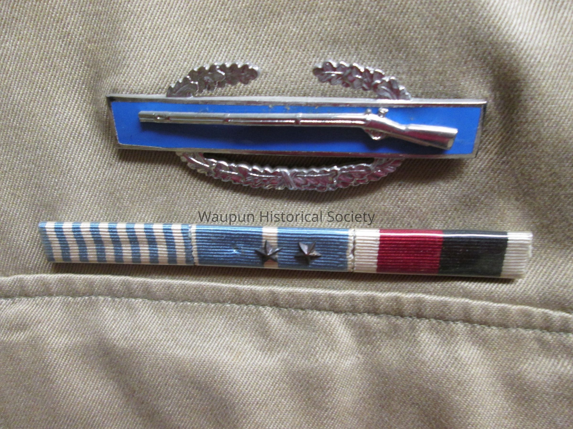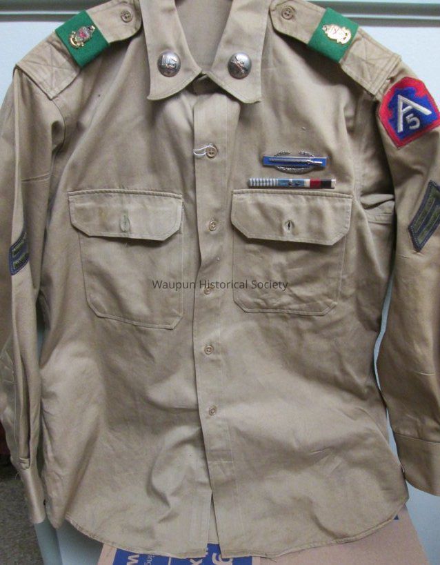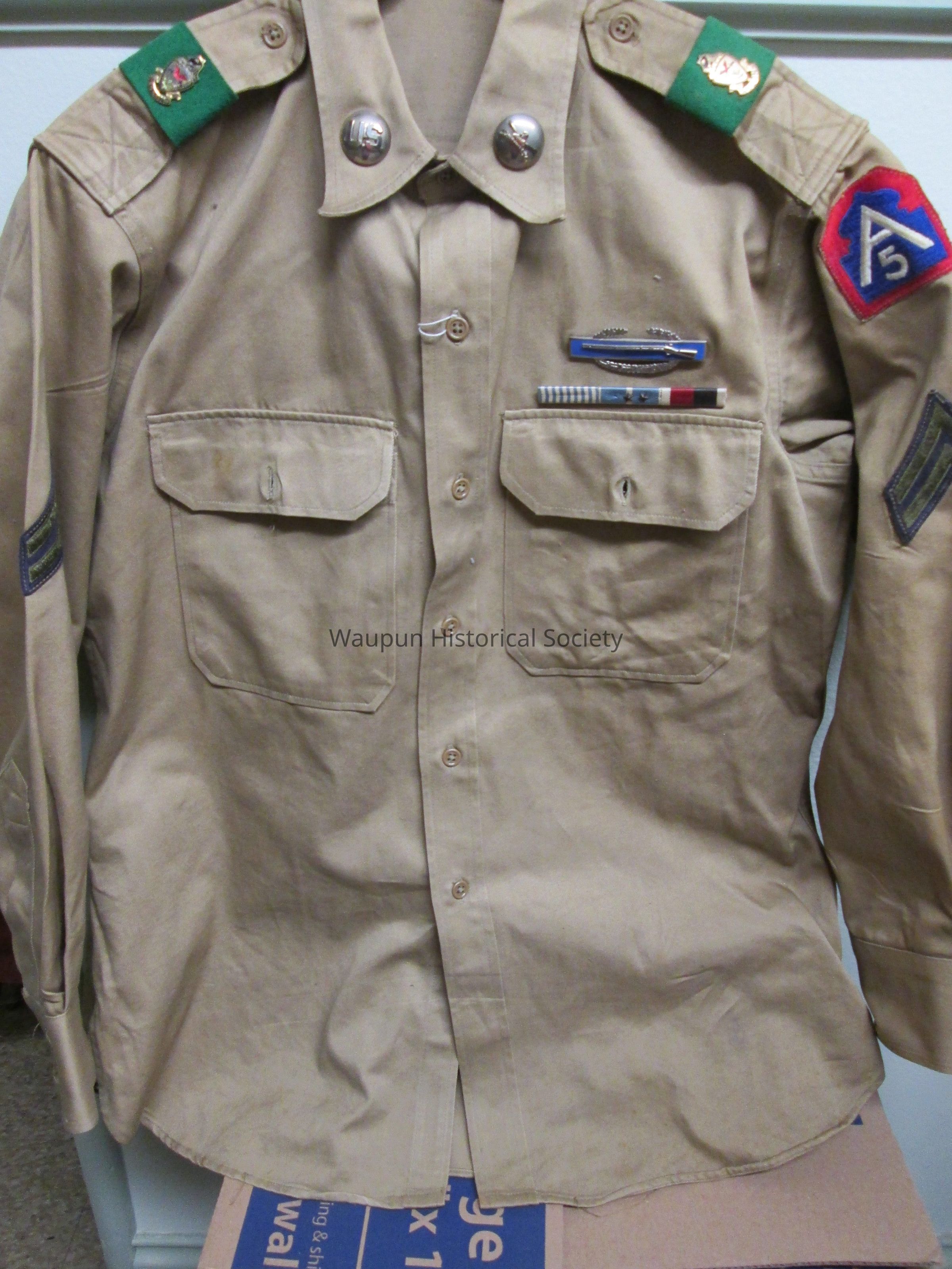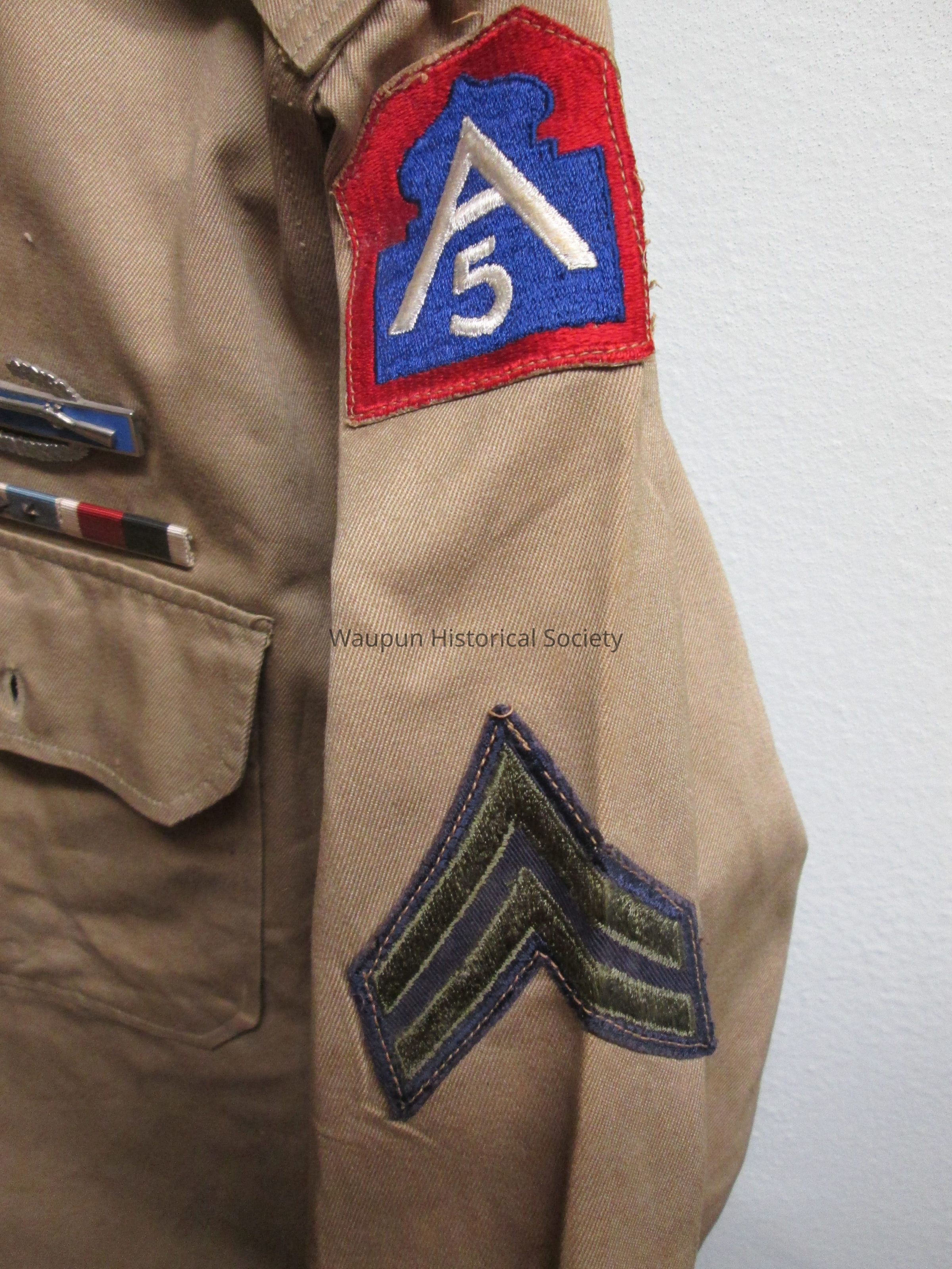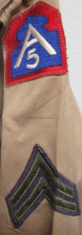WW II Era Military Uniform Top with a Red, Whit and Blue, 5th Army Patch left shoulder sleeve. There are two undefinable pins located on the top of shoulder. On the front of the shirt is an Infantry Sterling Silver Rifle Badge Combat Award Pin. Each sleeve is a patch with two chevrons denoting his rank.Acquisition