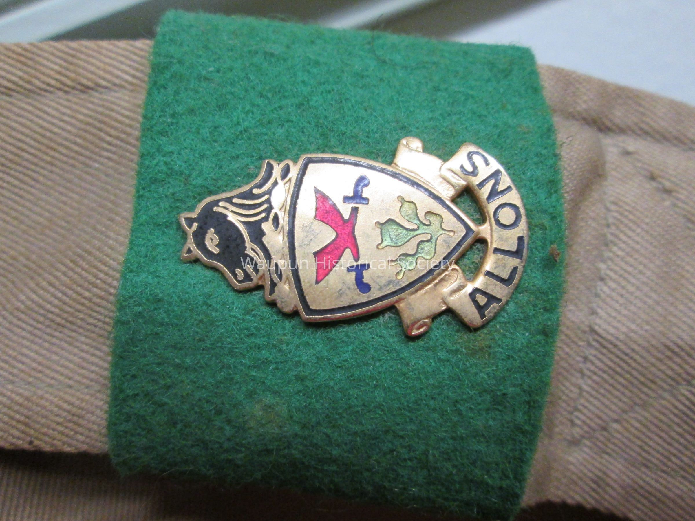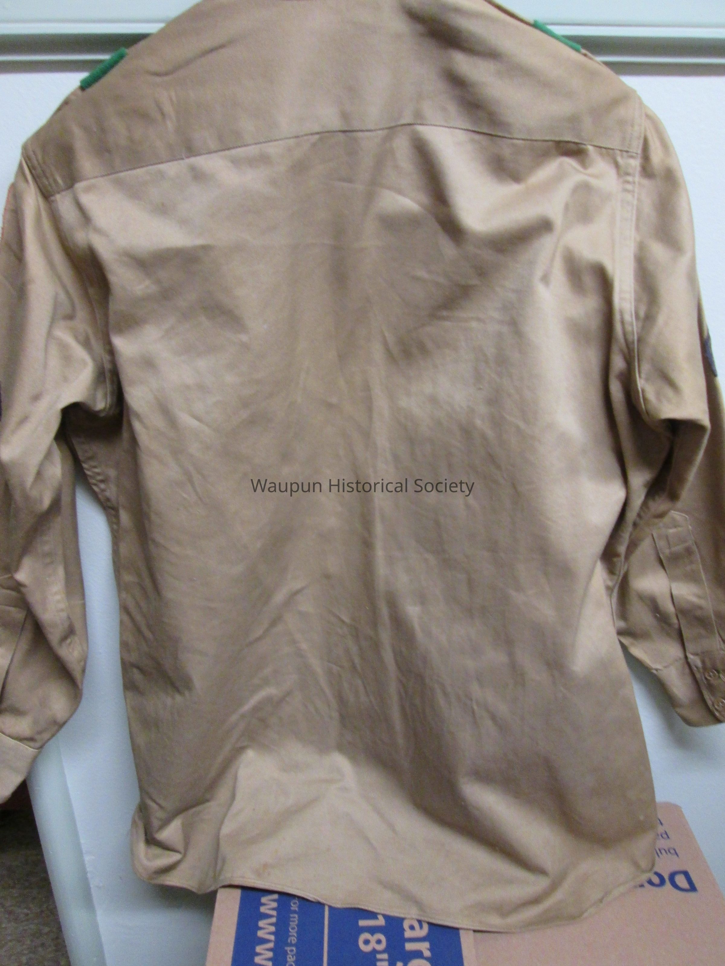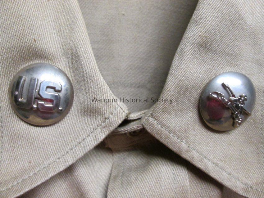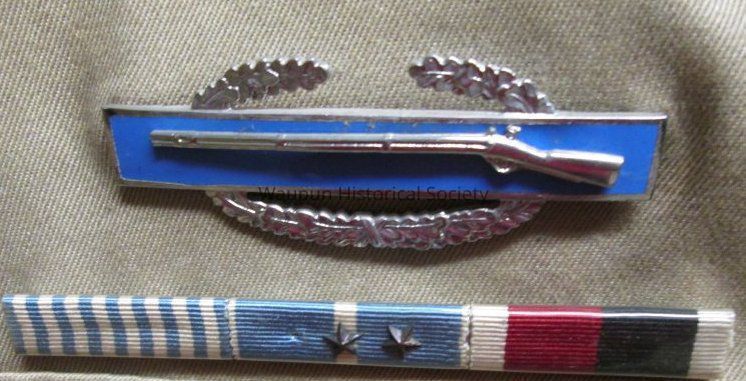WW II Era Military Uniform Top with a Red, Whit and Blue, 5th Army Patch left shoulder sleeve. There are two undefinable pins located on the top of shoulder. On the front of the shirt is an Infantry Sterling Silver Rifle Badge Combat Award Pin. Each sleeve is a patch with two chevrons denoting his rank.Acquisition