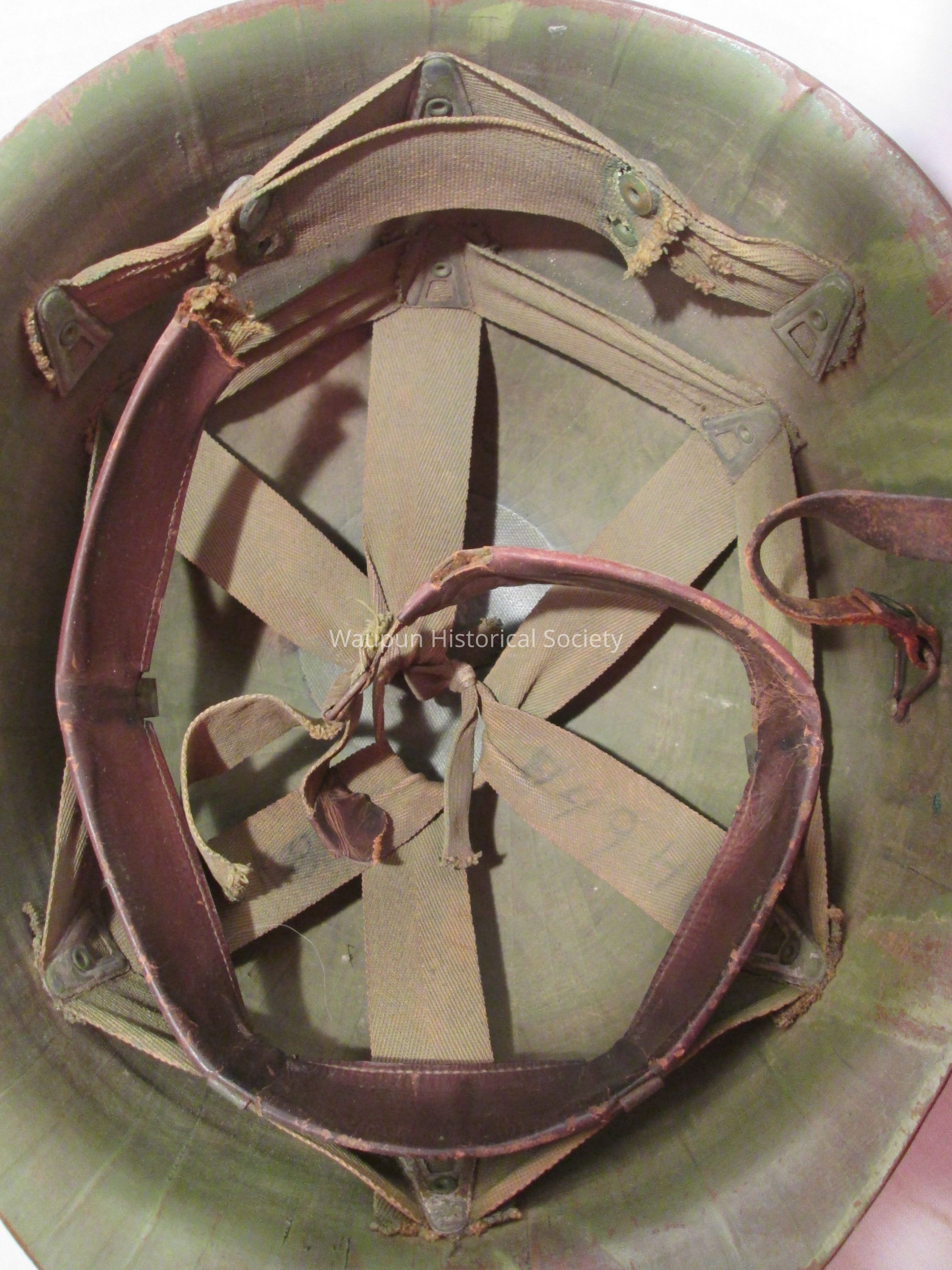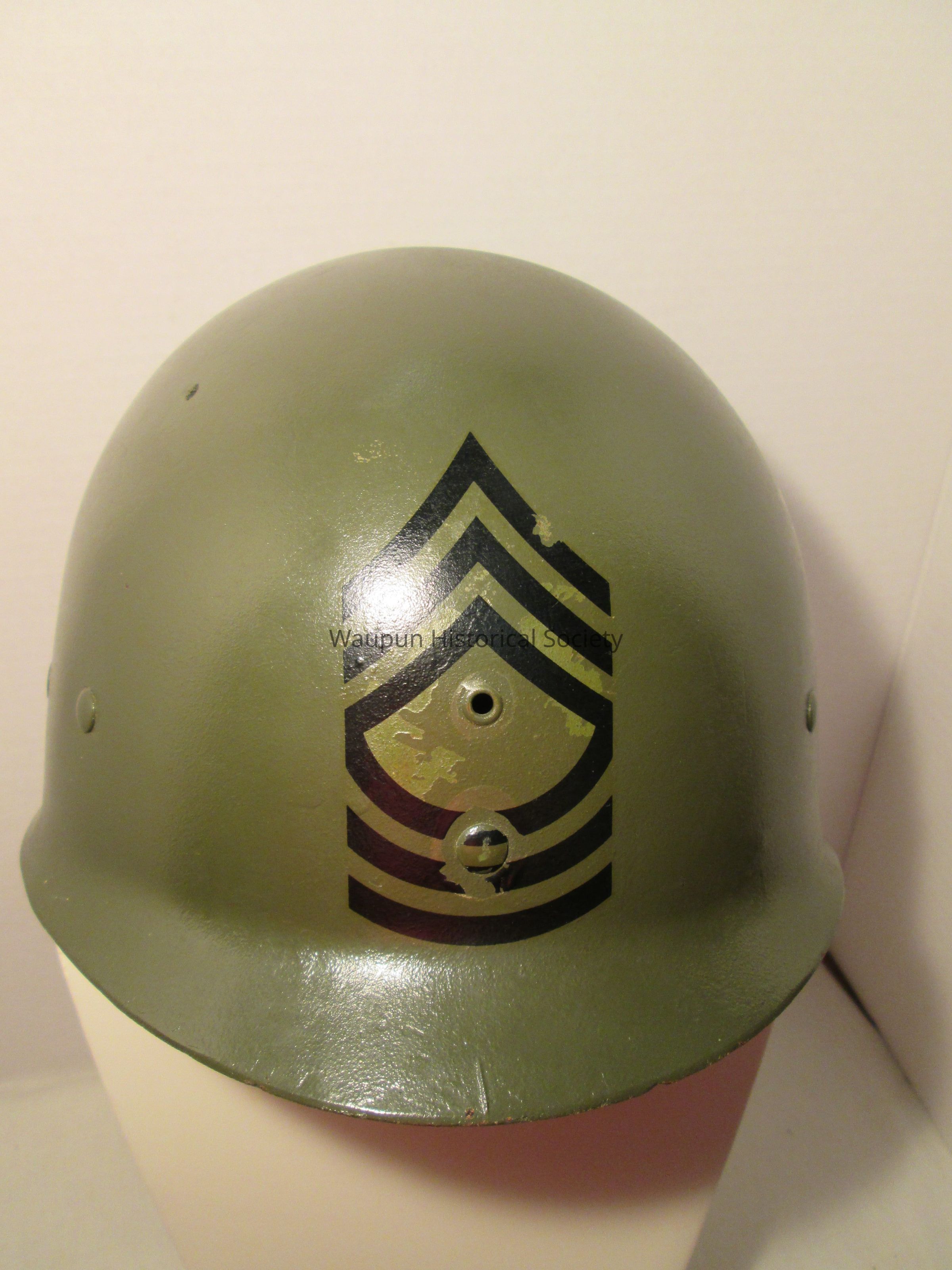 Green Military Helmet with chevron insignia painted on front side denoted rank of E-8 Master Sergeant.Acquisition