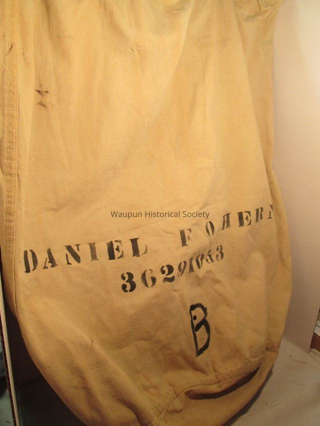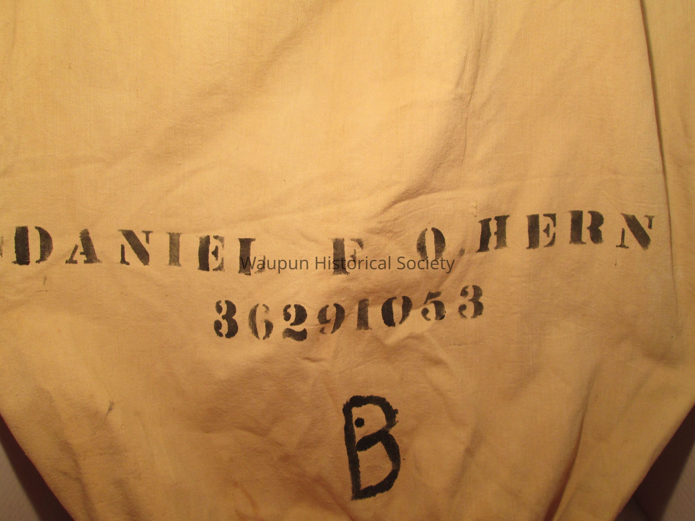 Military Laundry Bag. Probably used by Daniel F. O'Hern. Bag is lite tan with a tie cord at the tops. Bag is very worn.Acquisition