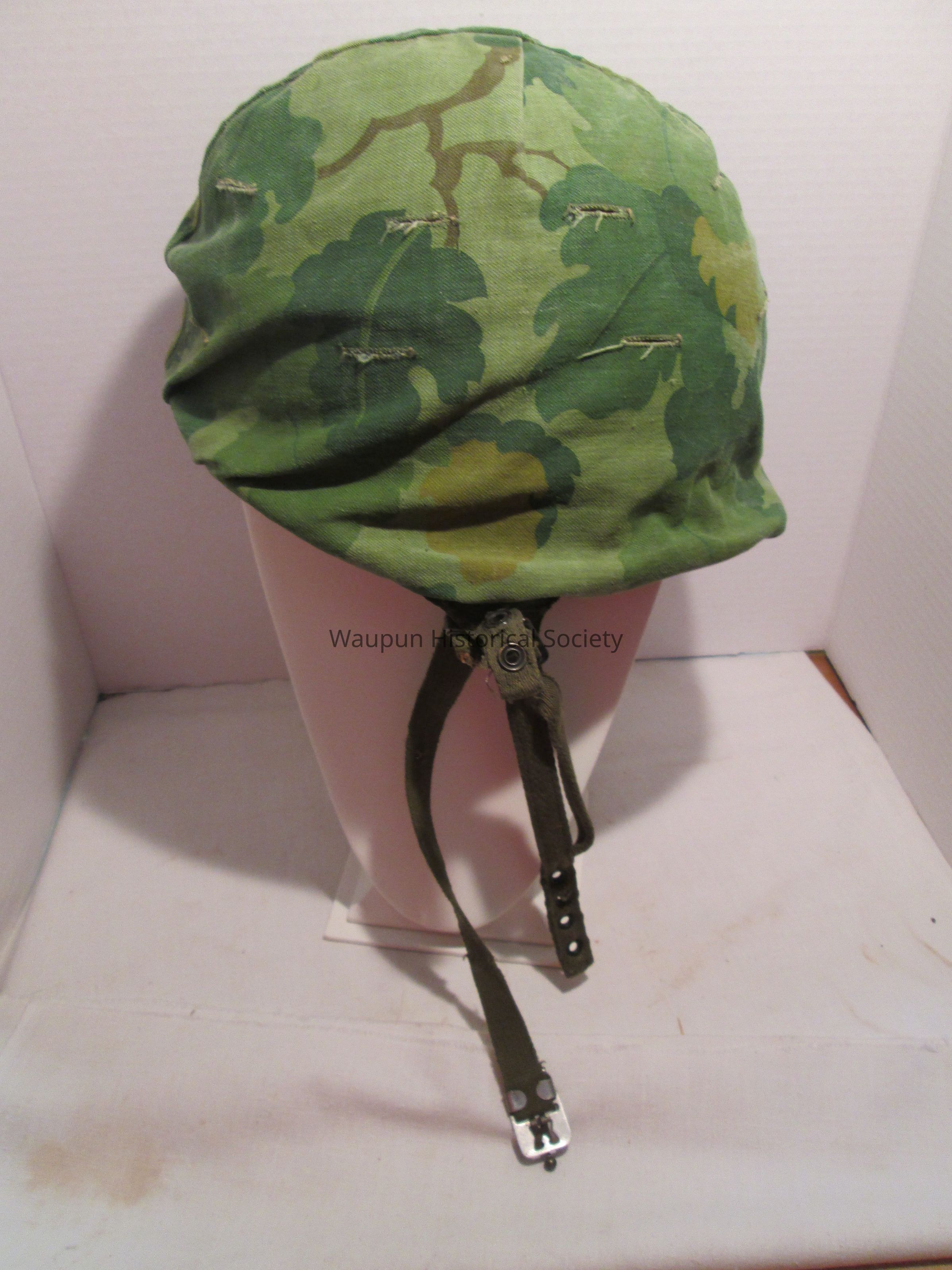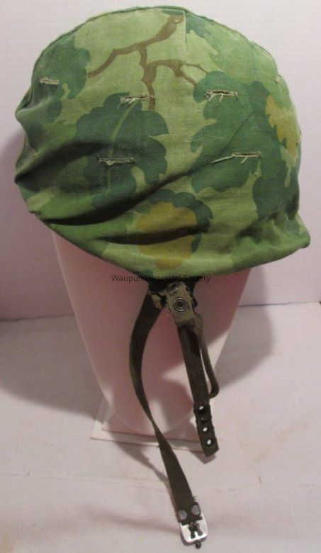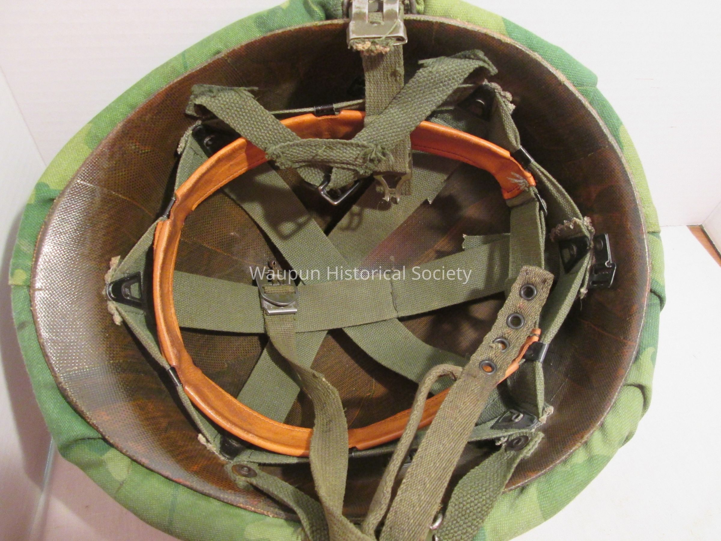 US Military 3pc Helmet. Consisting of Fiberglass helmet liner, next a metal shell covered in camouflage fabric on the outside. Numerous ties and straps adorn the inside of the helemt to keep it all together and on the soldiers head.Acquisition