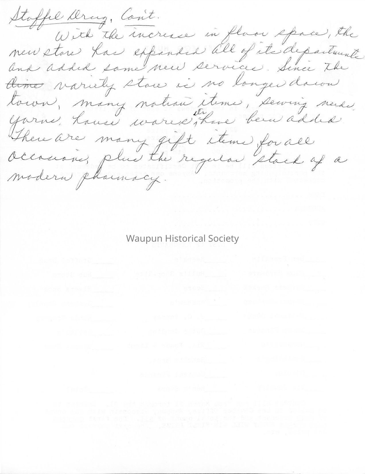 With the increase in floor space, the new store has expanded all of its departments and added somenew services. Since the variety store is no longer down town, many notion items, sewing needs, yarns, housewares, etc. have been added. There are many gift items for all occasions, plus the regular stock of a modern pharmacy.Acquisition