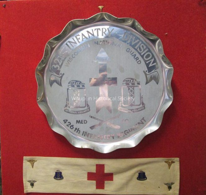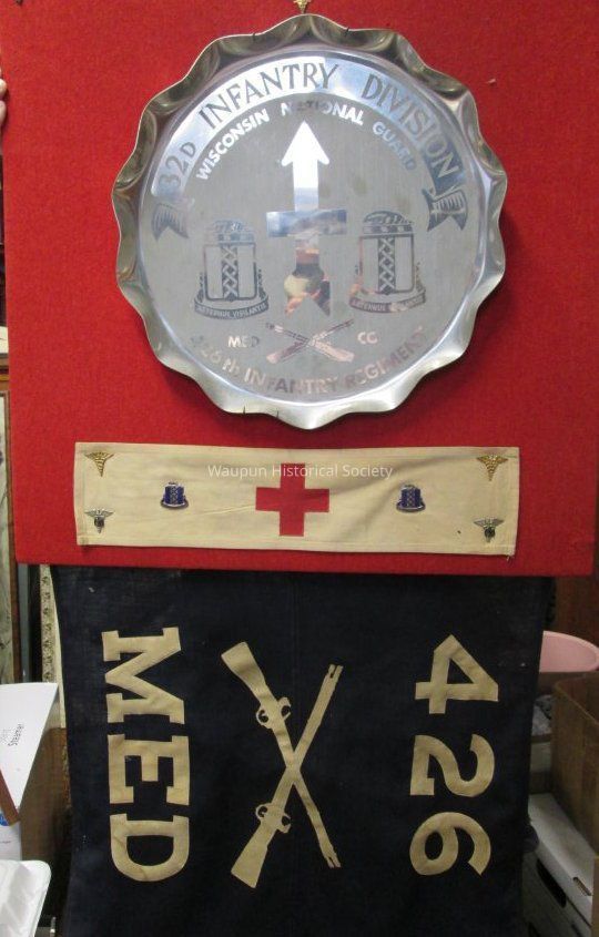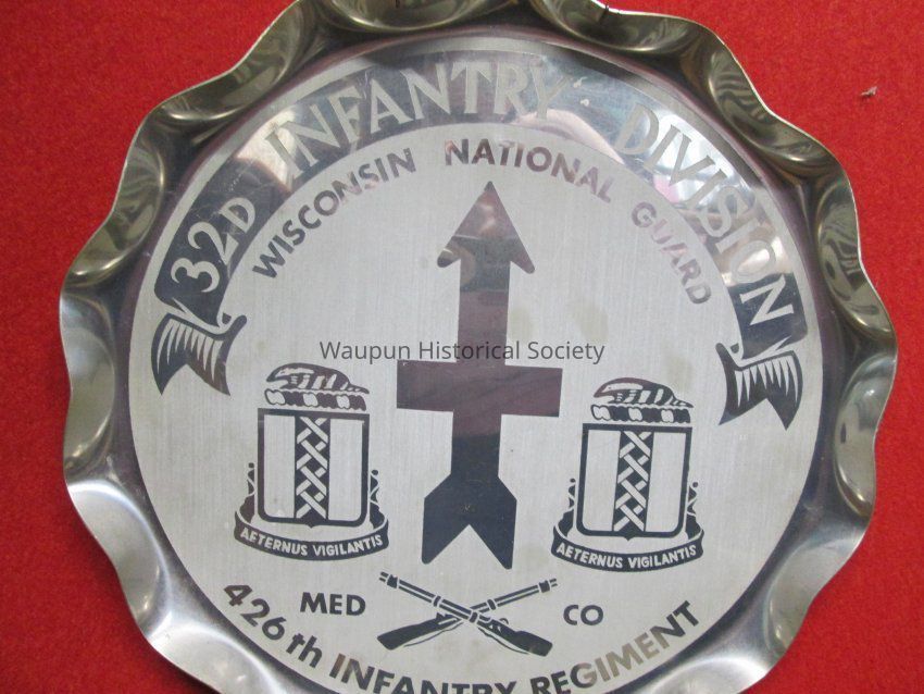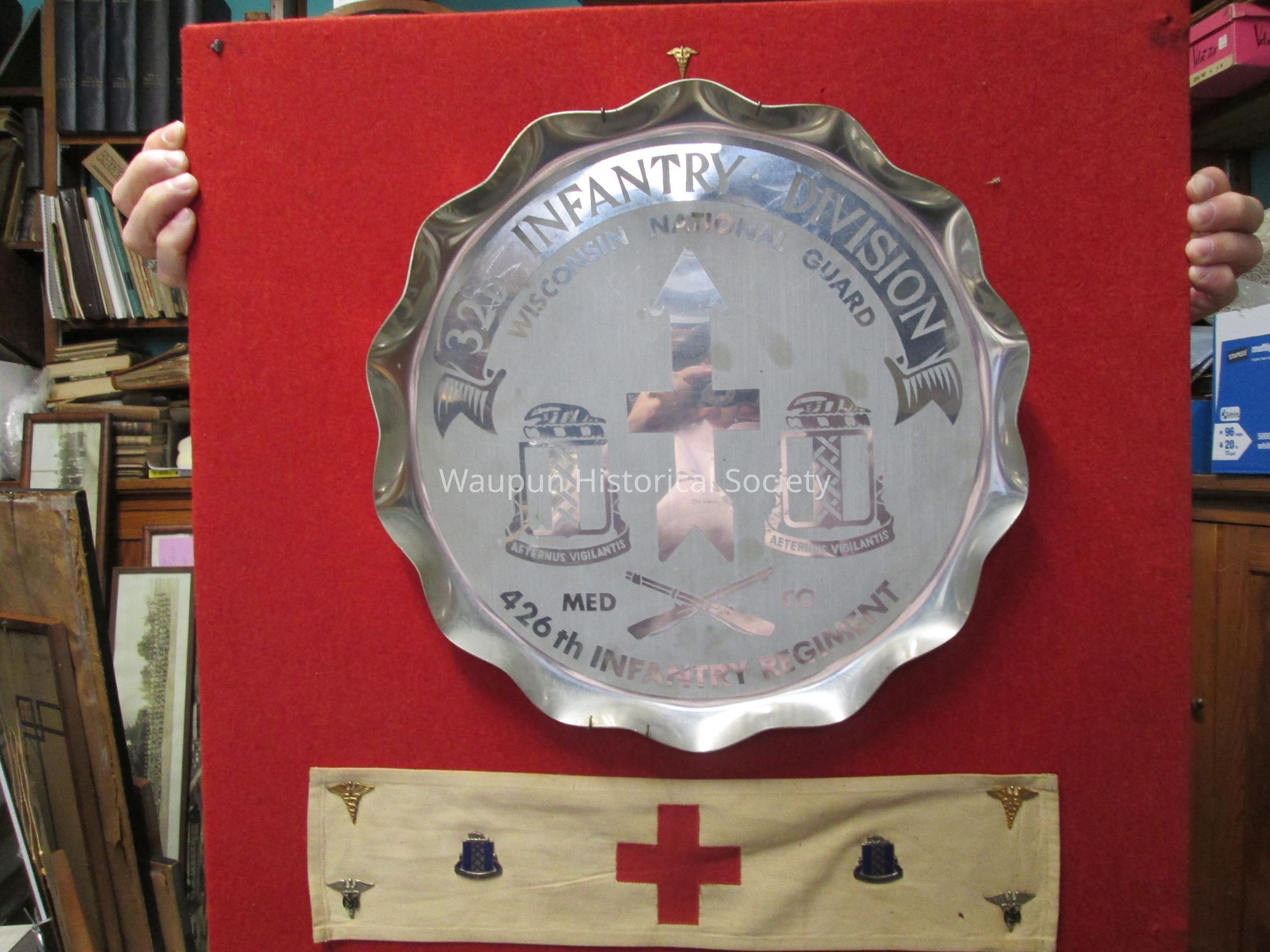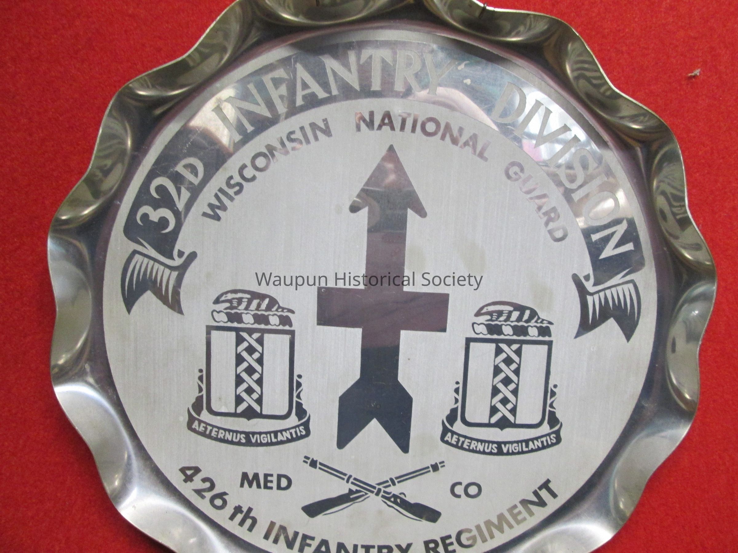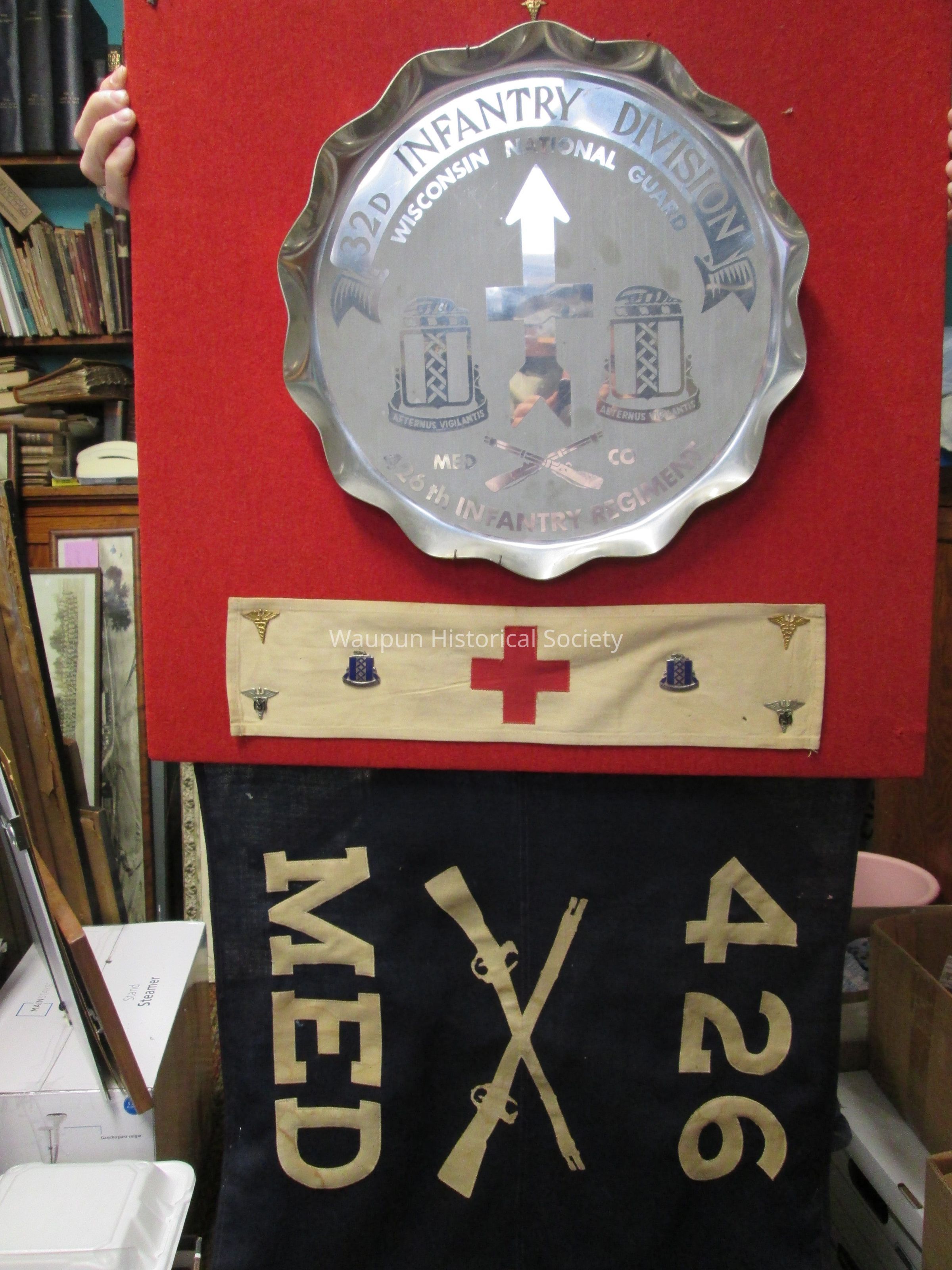National Guard Banner including a piece of plywood covered with red felt size, 22.5" x 22.5". There are several medical pins attatched to the top and bottom of red felt. There is a silver platter attatched to the red area by a metal hanger on the back of the platter. Platter is for the 32nd Infantry Division, Wisconsin National Guard, Med Co 426th Infantry Regiment. Latin states, "Aeternus Vigilantis" meaning The eternal Punisher. Attatched to the bottom of the red felt section is a National Guard flag for the 426th Medical Company. It is dark blue with white sewn on letters and includes two crossed rifles in the center.Acquisition