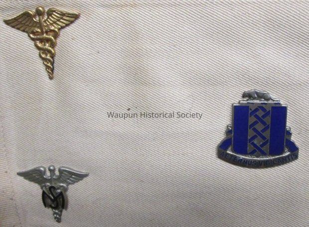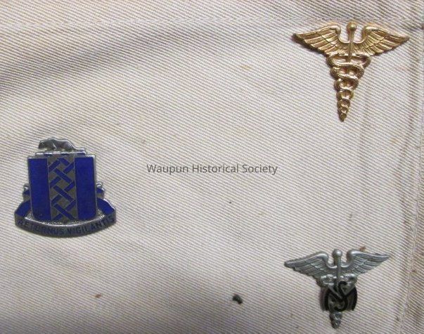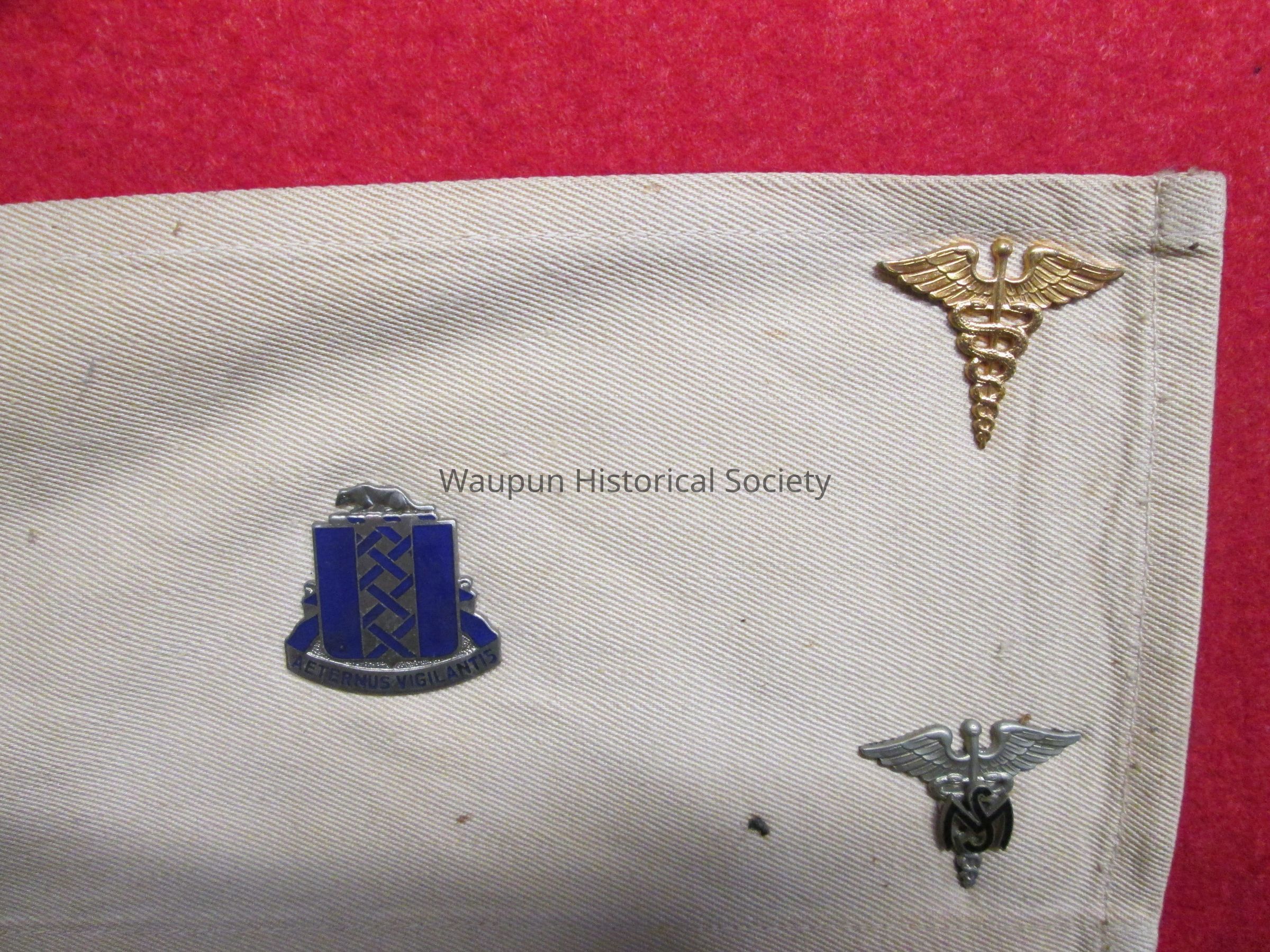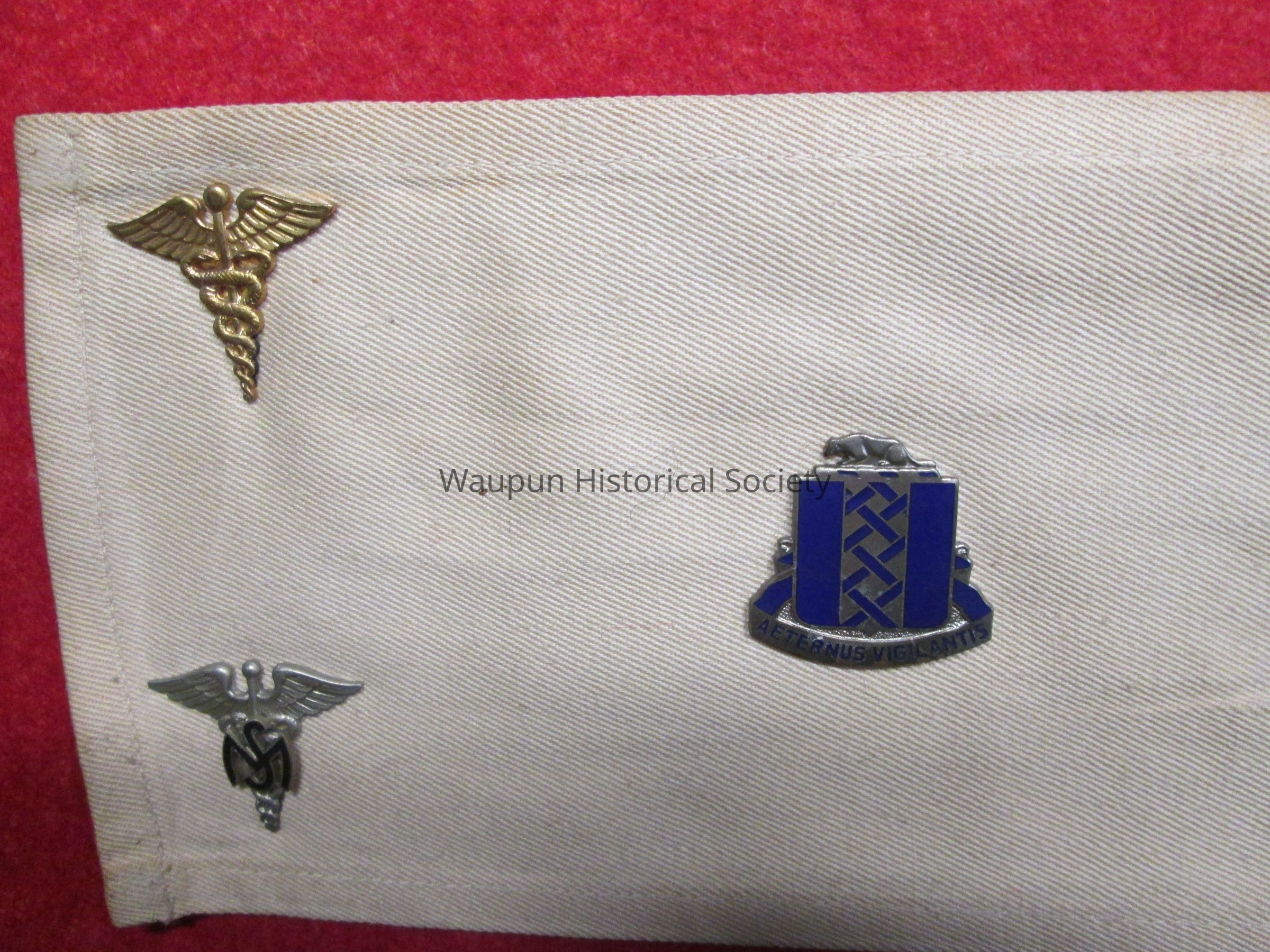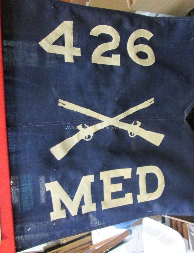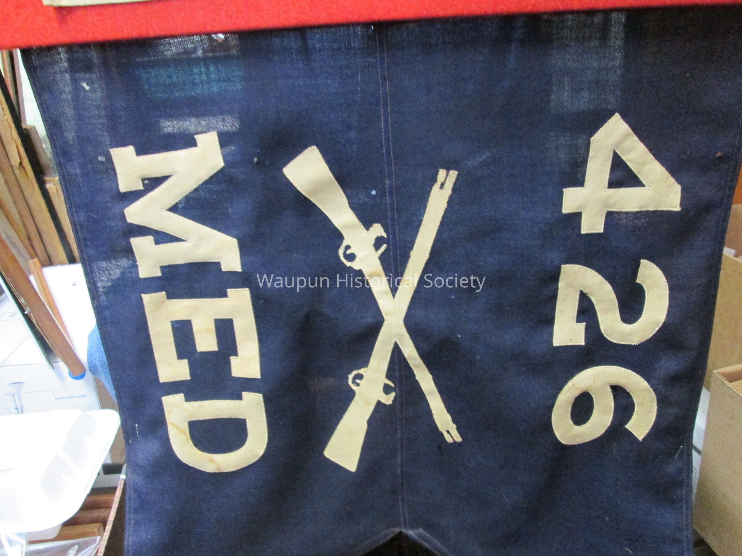 National Guard Banner including a piece of plywood covered with red felt size, 22.5" x 22.5". There are several medical pins attatched to the top and bottom of red felt. There is a silver platter attatched to the red area by a metal hanger on the back of the platter. Platter is for the 32nd Infantry Division, Wisconsin National Guard, Med Co 426th Infantry Regiment. Latin states, "Aeternus Vigilantis" meaning The eternal Punisher. Attatched to the bottom of the red felt section is a National Guard flag for the 426th Medical Company. It is dark blue with white sewn on letters and includes two crossed rifles in the center.Acquisition