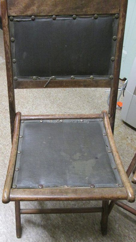 (2) Wooden Folding Chairs. These two chairs are representative of a group of chairs given to the Waupun National Guard by the H. L. Beyers Funeral Home. The chairs were used as camp chairs in the 1930's when the Waupun National Guard-Company E of the 135th medical regiment would go for their annual summer encampment at Camp Shelby, Mississippi. The Company E pictures are on the north wall and Master Sergeant Bert Redman of Waupun, who preserved these chairs through the years is pictured there. *Donated by his son, David Redman.*Acquisition