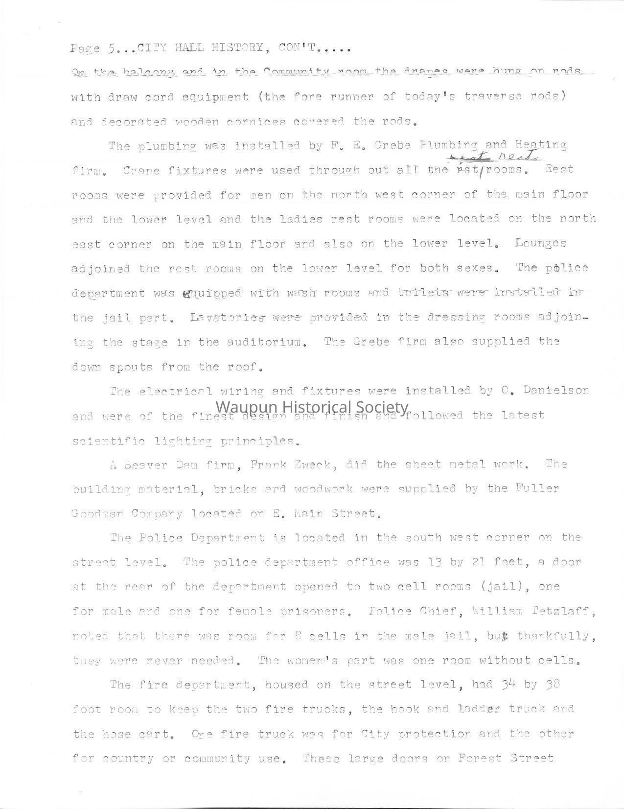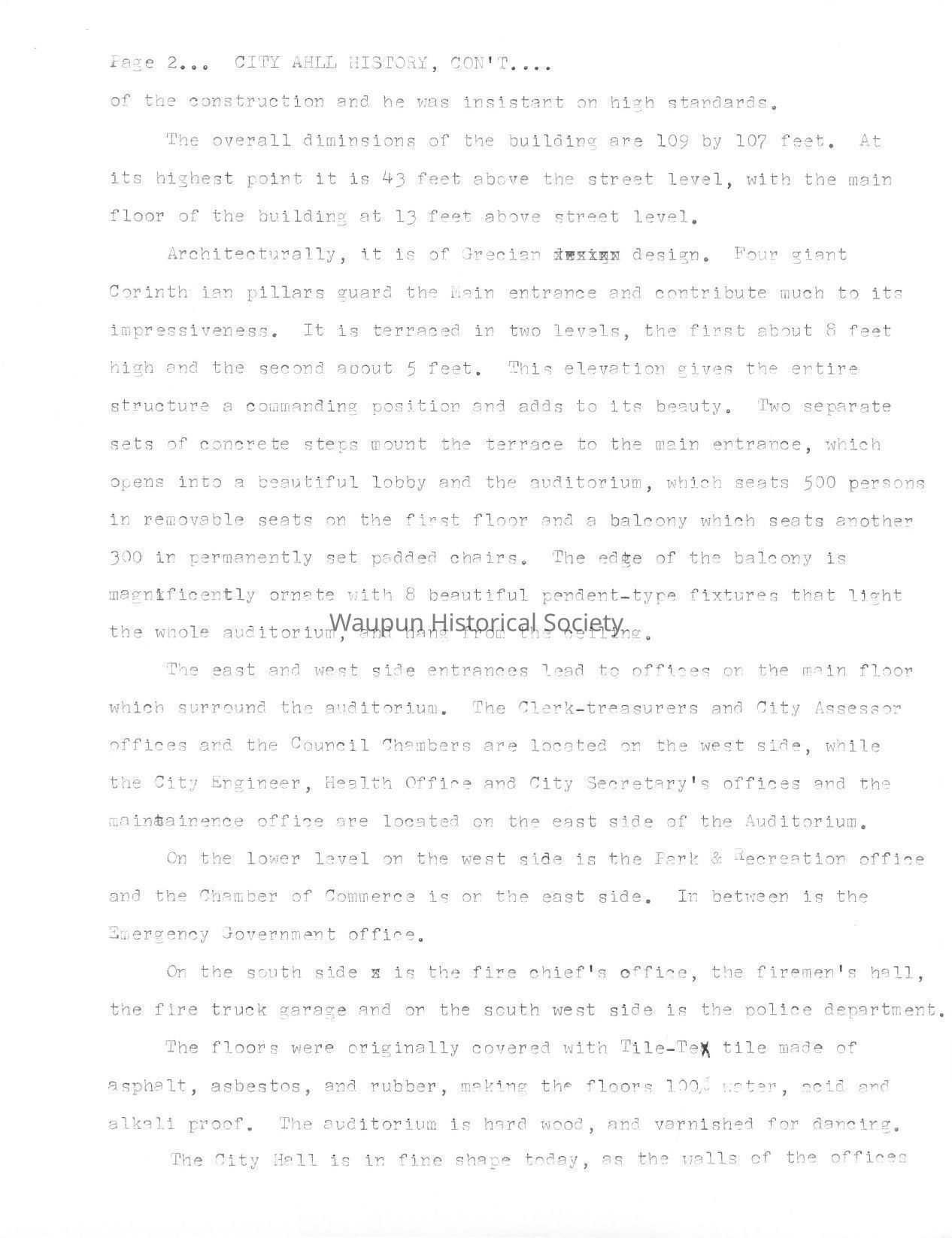 Historical information on Waupun City Hall for 1976 Bicentennial Celebration in Waupun, WI.