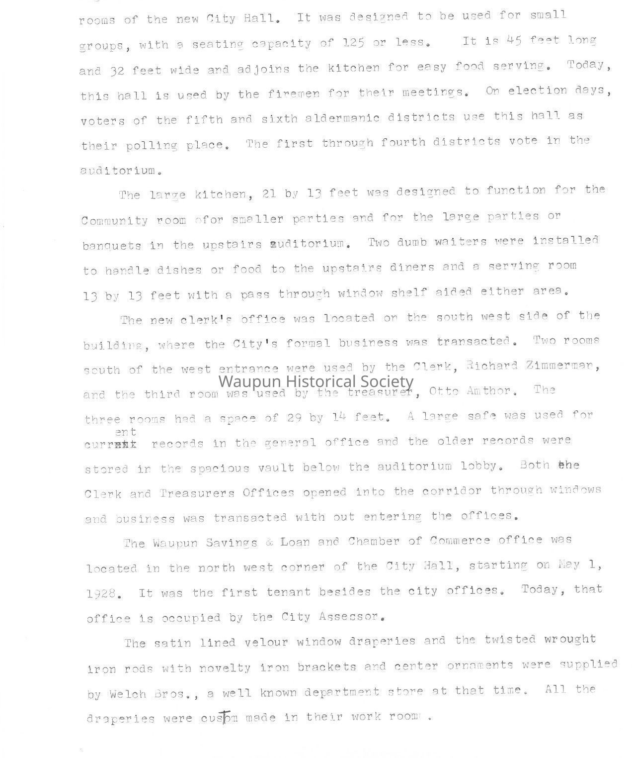 The Waupun Savings & Loan and Chamber of Commerce office was located in the north west corner of the City Hall, starting on May 1, 1928. It was the first tenant besides the city offices. Today, that office is occupied by the City Assessor.