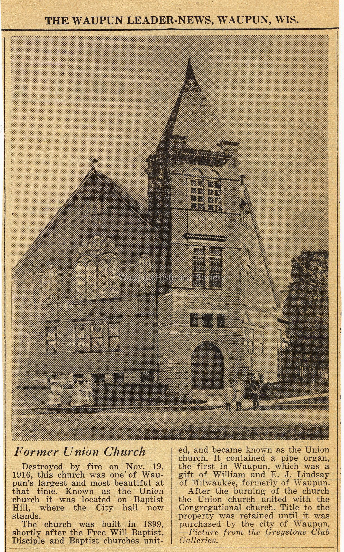 Former Union Church. From a clipping found from about 1947 in the 1910 Waupun City Directory. Destroyed by fire on Nov. 19, 1916, this church was one of Waupun's largest and most beautiful at that time. Known as the Union Church, it was located on Baptist Hill, where the City Hall now stands (Forest and Main streets). The church was built in 1899, shortly after the Free Will Baptist, Disciple and Baptist churches united, and became known as the Union Church. It contained a pipe organ, the first in Waupun, which was a gift of William and E.J. Lindsay of Milwaukee, formerly of Waupun. After the burning of the church the Union Church united with the Congregational Church. Title to the property was retained until it was purchased by the City of Waupun. Taken from The Waupun Leader-News, Waupun, Wis. 1947/1948. Picture is from the Greystone Club Galleries.