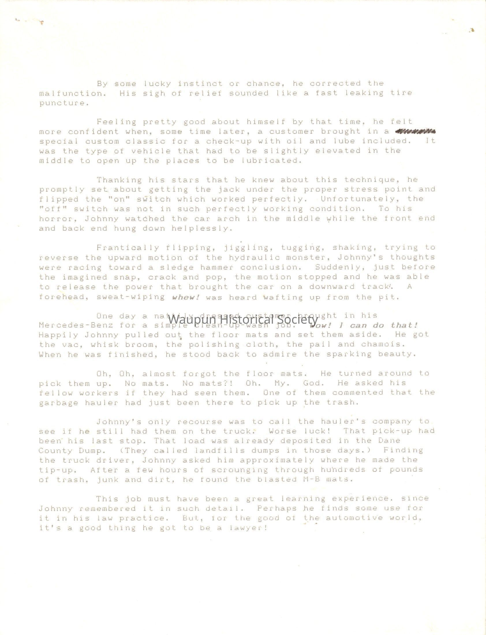 One day a nattily dressed customer brought in his Mercedes-Benz for a simple clean-up-wash job. Wow! I can do that! Happily Johnny pulled out the floor mats and set them aside. He got