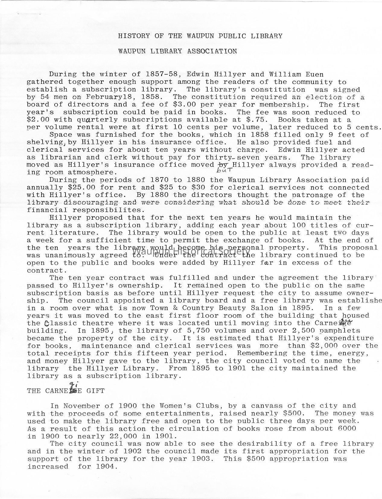 HISTORY OF THE WAUPUN PUBLIC LIBRARY/WAUPUN LIBRARY ASSOCIATION