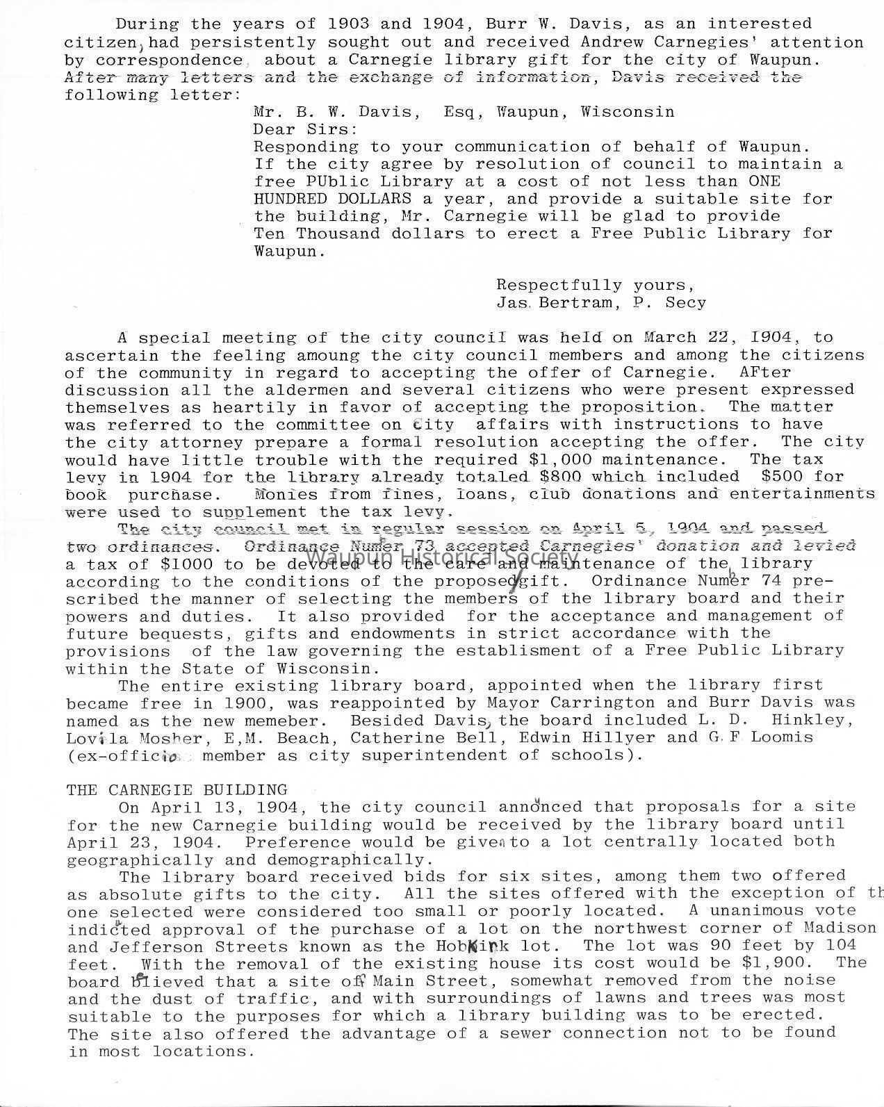 During the years of 1903 and 1904, Burr W. Davis, as an interested citizen, had persistently sought out and received Andrew Carnegies' attention by correspondence about a Carnegie library gift for the city of Waupun. After many letters and the exchange of information, Davis received the following letter: