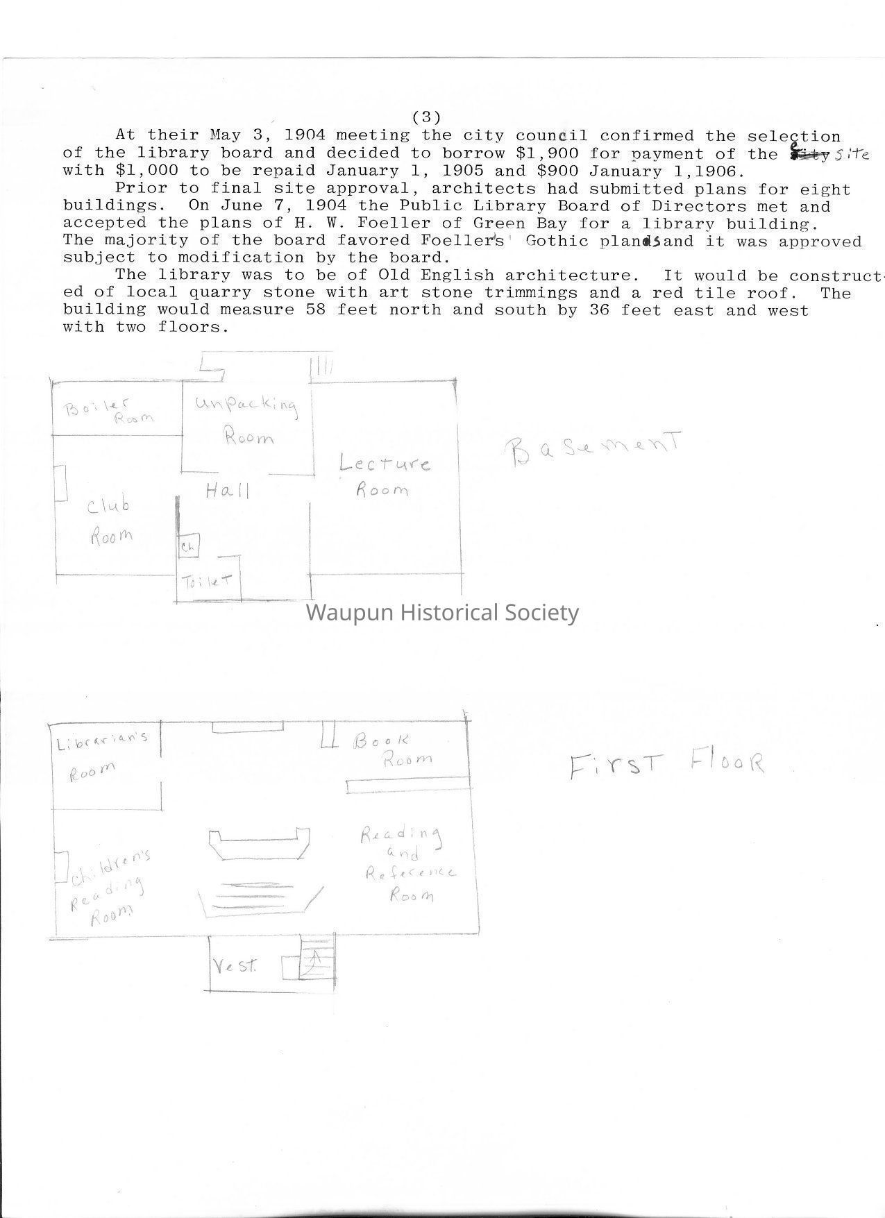 The library was to be of Old. English architecture. It would be constructed of local quarry stone with art stone trimmings and a red tile roof. The building would measure 58 feet north and south by 36 feet east and west with two floors. (Hand drawn floor plan of basement and first floor done in pencil).