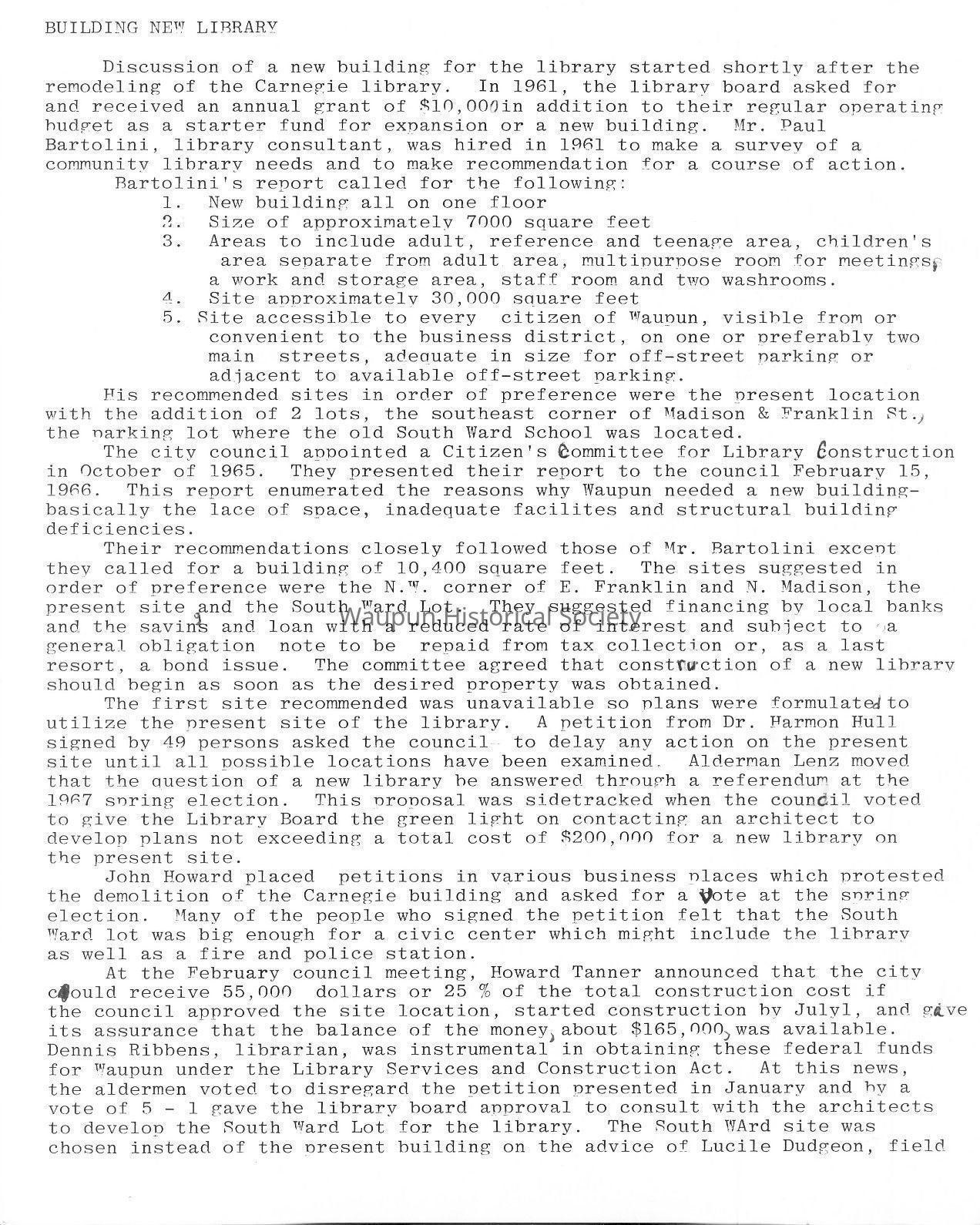 Discussion of a new building for the library started shortly after the remodeling of the Carnegie library. In 1961, the library board asked for and received an annual grant of S10,000 in addition to their regular operating budget as a starter fund for expansion or a new building. Mr. Paul Bartolini, library consultant, was hired in 1961 to make a survey of a community library needs and to make recommendation for a course of action.