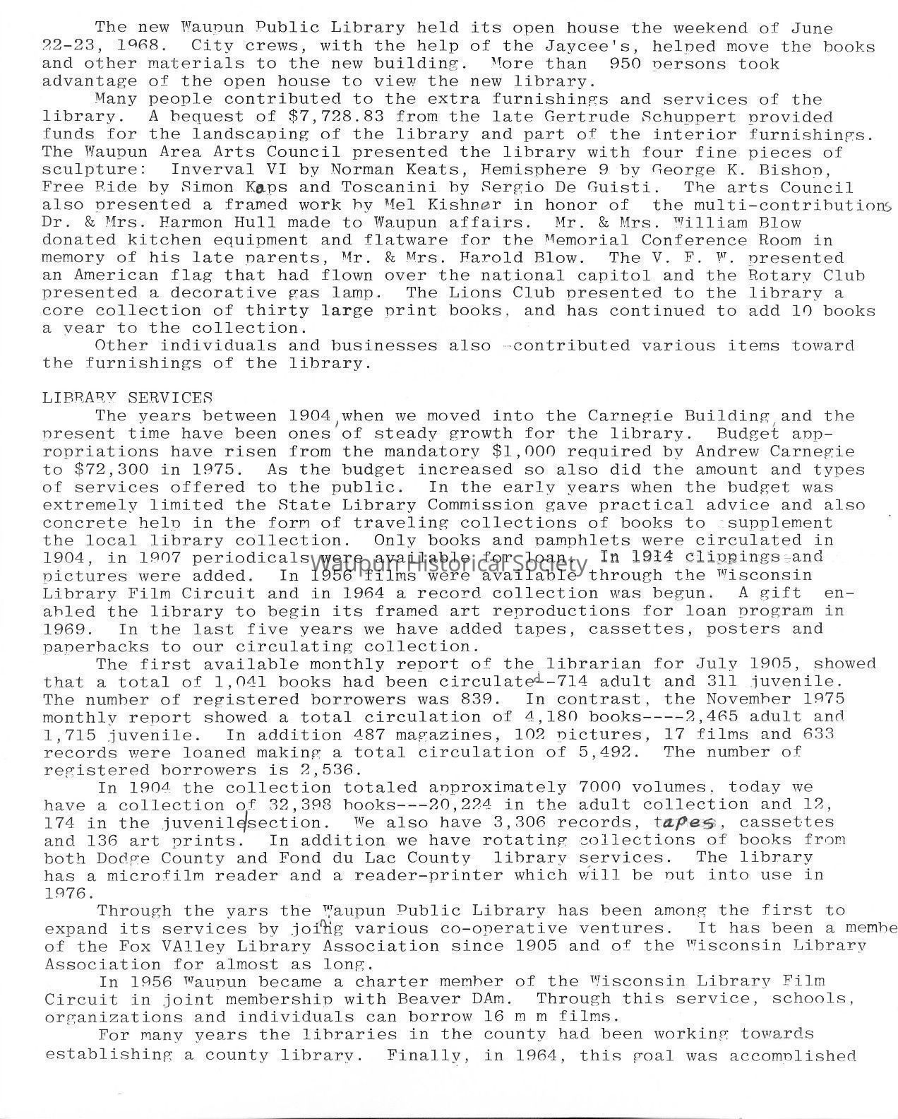 The years between 1904, when we moved into the Carnegie Building, and the present time have been ones of steady growth for the library. Budget appropriations have risen from the mandatory $1,000 required by Andrew Carnegie to $72,300 in 1975. As the budget increased so also did the amount and types of services offered to the public. In the early years when the budget was extremely limited the State Library Commission gave practical advice and also concrete help in the form of traveling collections of books to supplement the local library collection. Only books and pamphlets were circulated in 1904, in 1907 periodicals were available for loan. In 1914 clippings and pictures were added. In 1956 films were available through the Wisconsin Library Film Circuit and in 1964 a record collection was begun. A gift enabled the library to begin its framed art reproductions for loan program in 1969. In the last five years we have added tapes, cassettes, posters and paperbacks to our circulating collection.