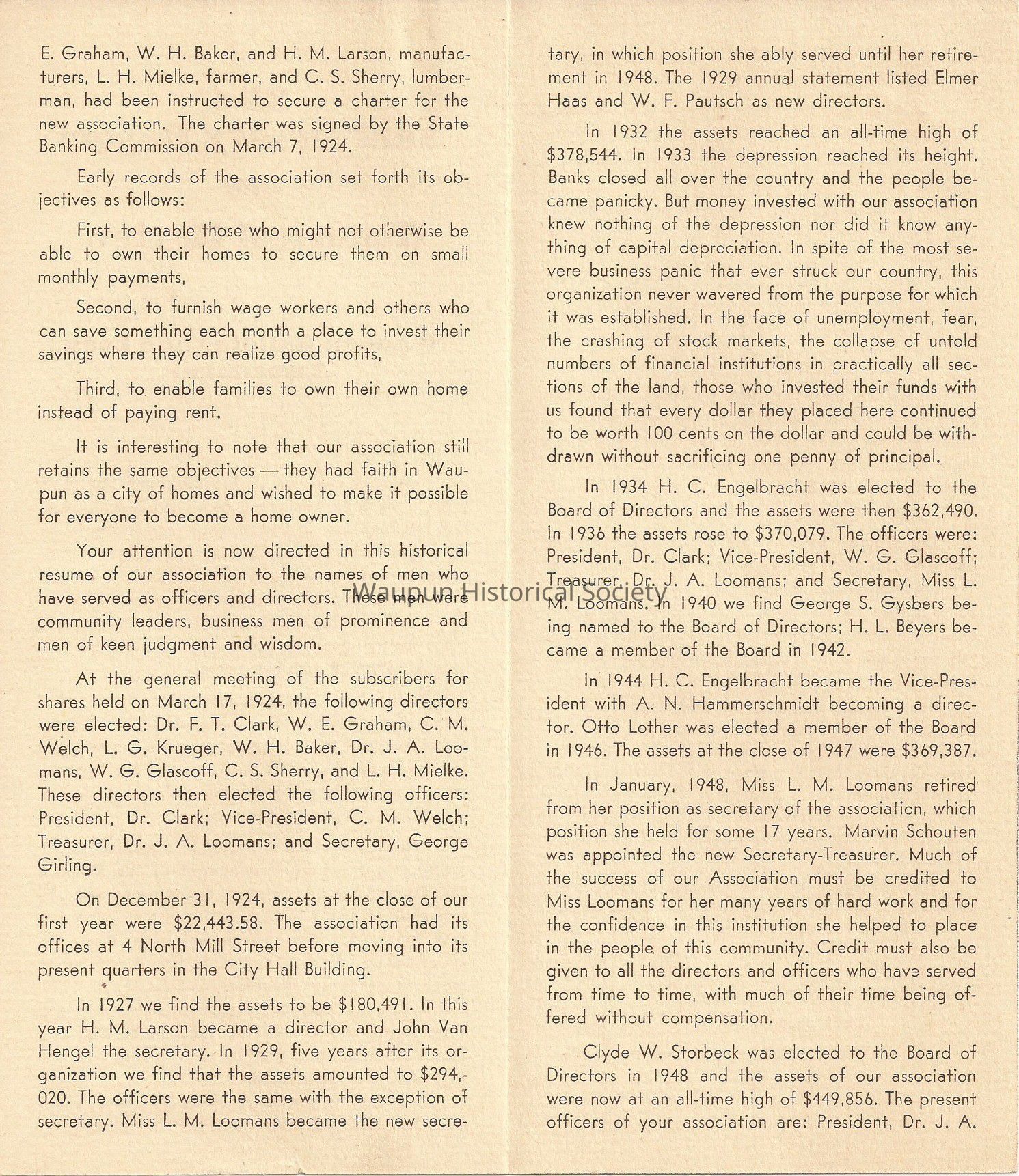 In March, 1949, we marked the completion of 25 years in which the Waupun Building and Loan Association has been serving people of our community in our field of endeavor. This association was formed to promote the welfare and development of our city by providing funds to those who needed financial aid in order to build or buy a home and also to provide a safe place for the investment of savings and assure a reasonable return on such investment.
