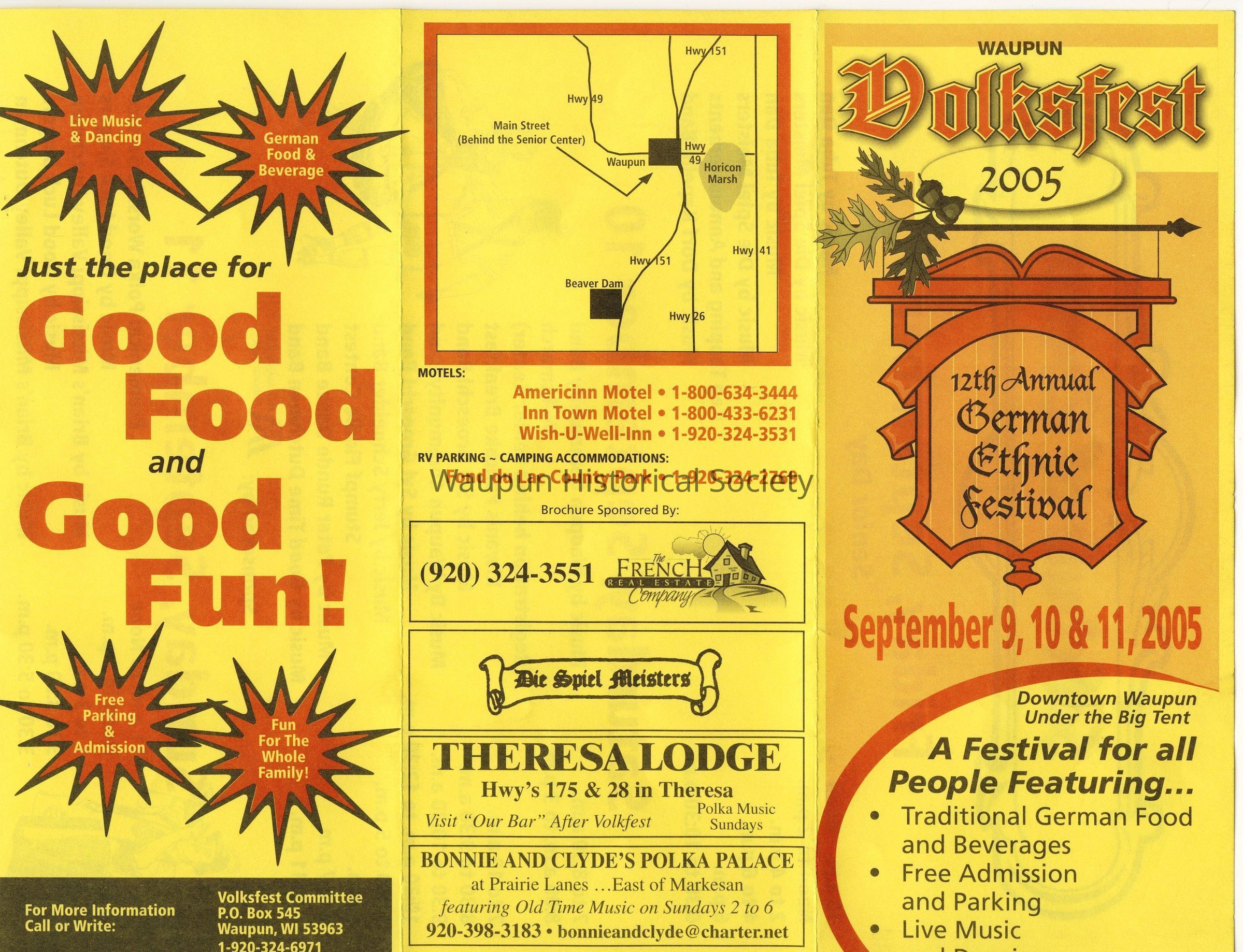Waupun Volksfest 2005 Flyer. September 9, 10 & 11, 2005. A Festival for all people featuring...Traditional German Food and Beverages, Free Admission and Parking, Live Music and Dancing. Includes schedule of events.